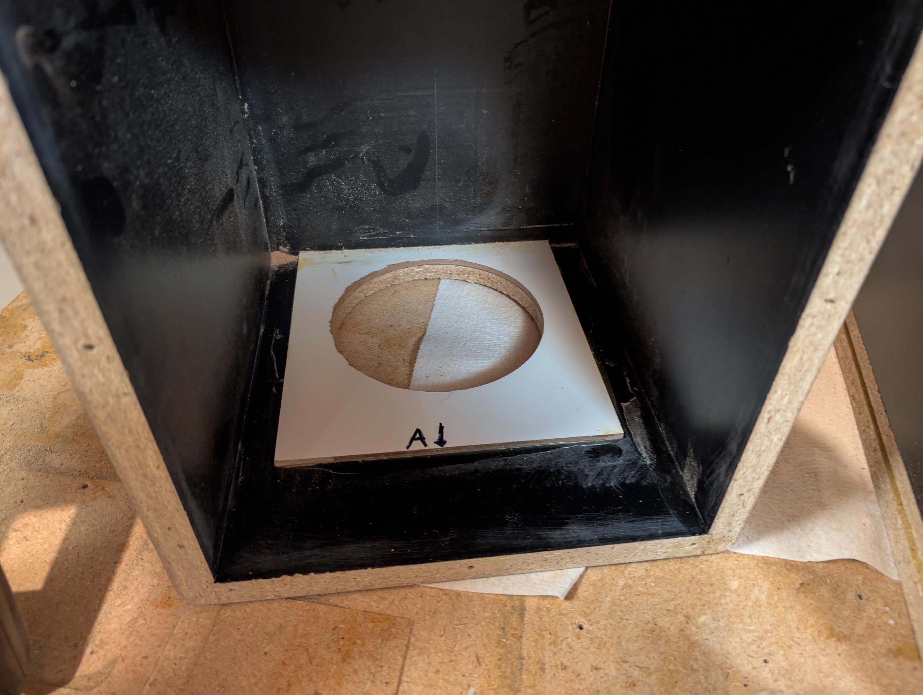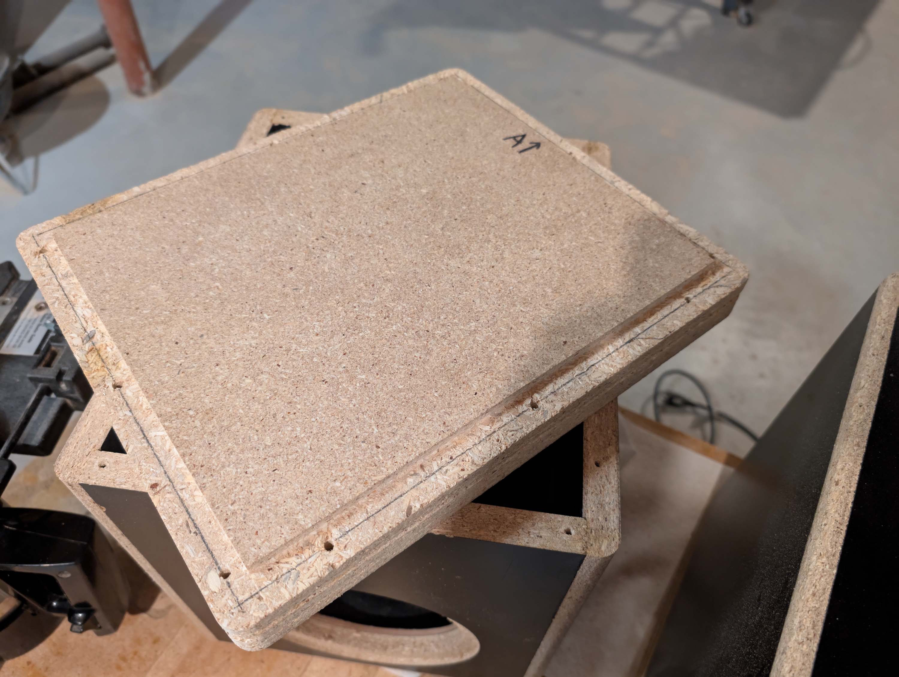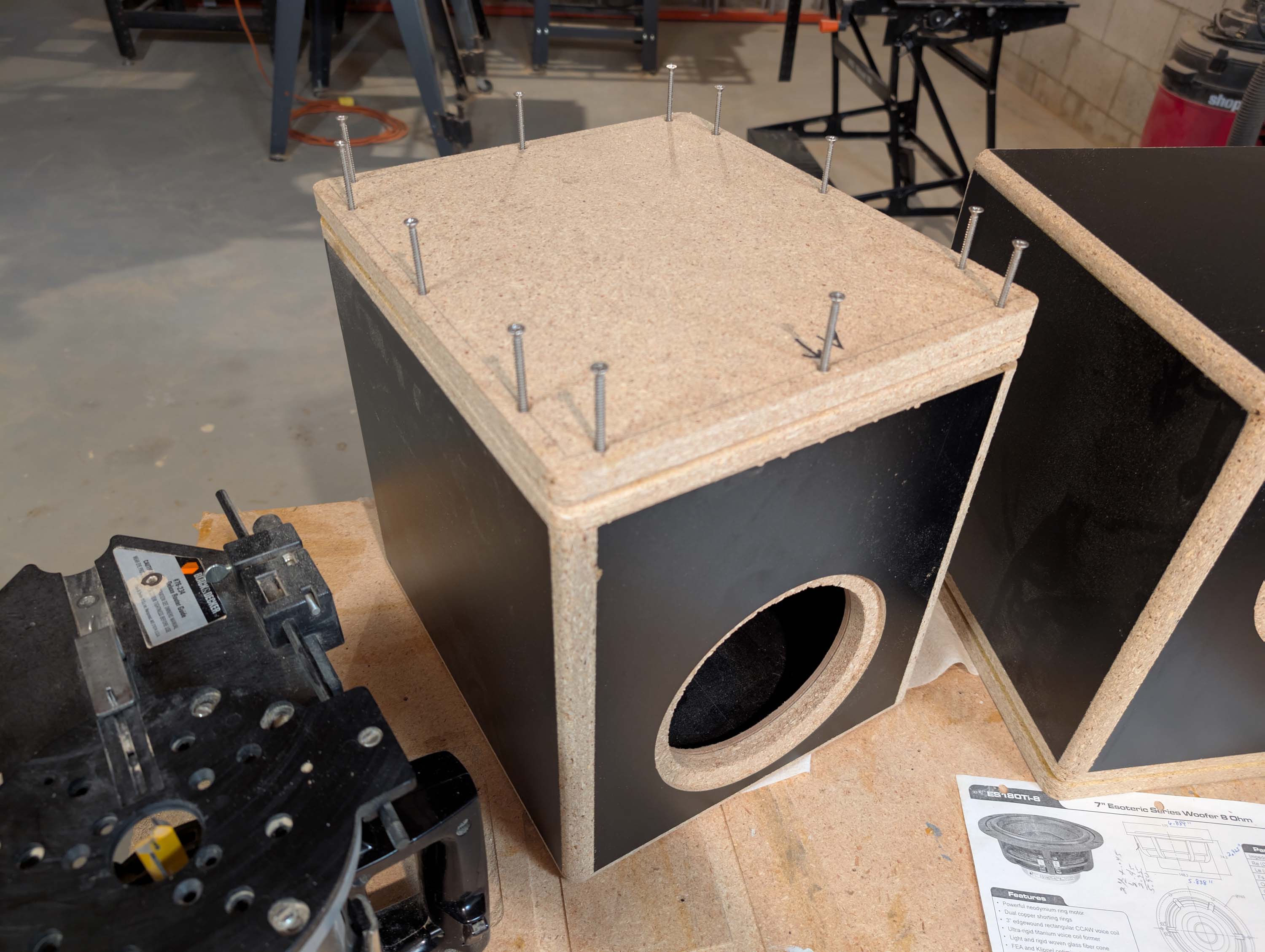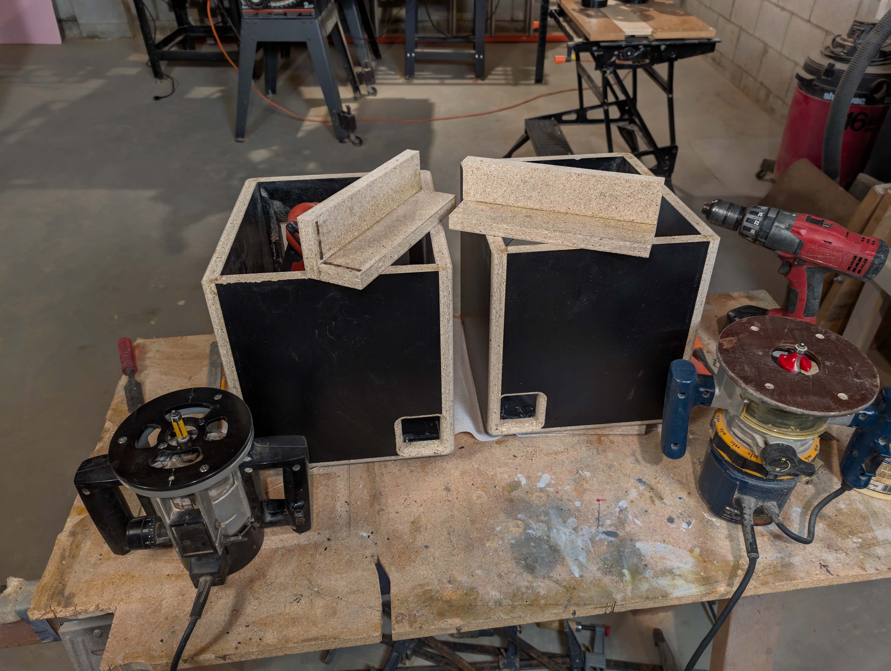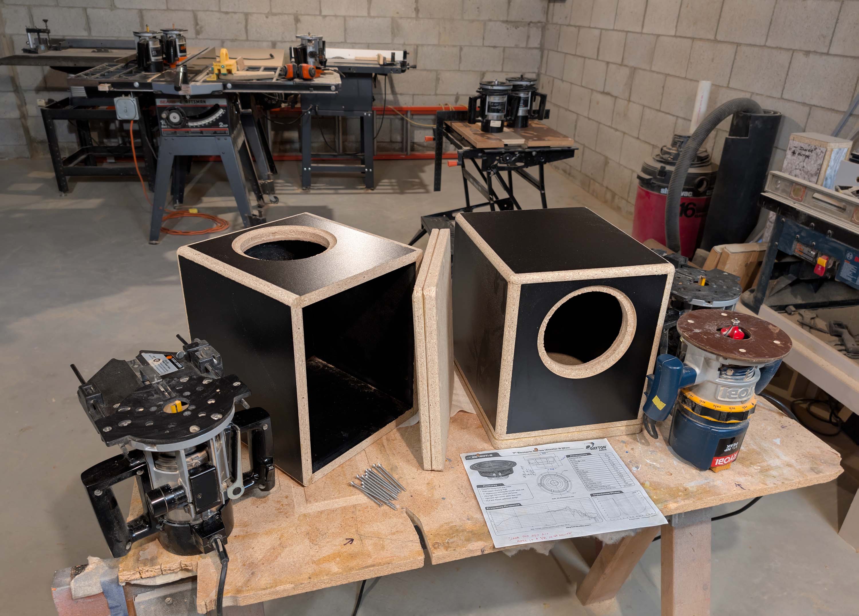 Progress report: Bass bin boxes are glued up. I increased the thickness of the bottom panel to 1.5" and made it removable with twelve #8 x 3" screws. I increased the baffle thickness from 0.75 to 0.95" to make up for the 7/32 flange recess. Next I’ll be cutting a hole for the bass reflex ports. They will be 2.1" x 2.1" x approx 9" to 10" long rectangular ports going along one of the two top corners. The removable bottom will make it easy to tune them to 32Hz.