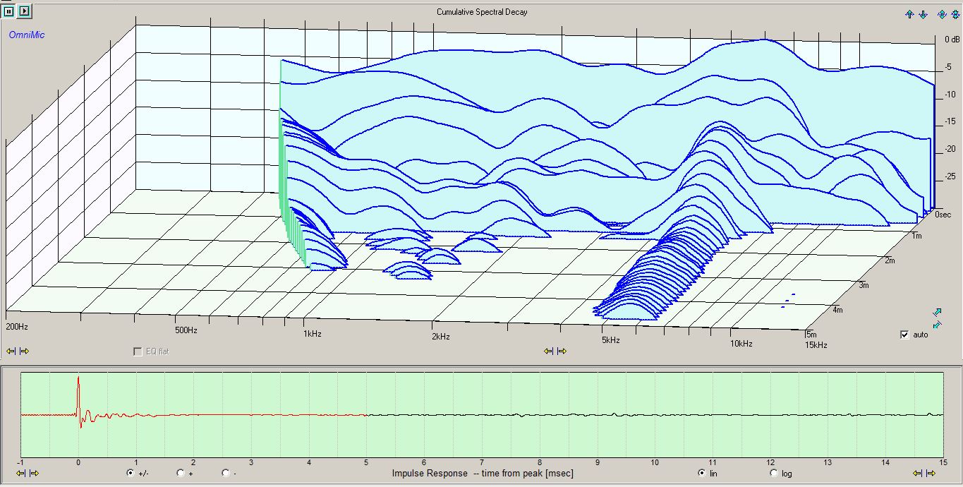 Here is a CSD plot of the RD40 mounted in the cabinet with Acousta-stuf and convoluted foam filling inside. No crossover parts or protection cap. No foam blockers up front. You can clearly see the ringing at 5 to 6kHz. This ringing does not show up at all on the impedance curve.