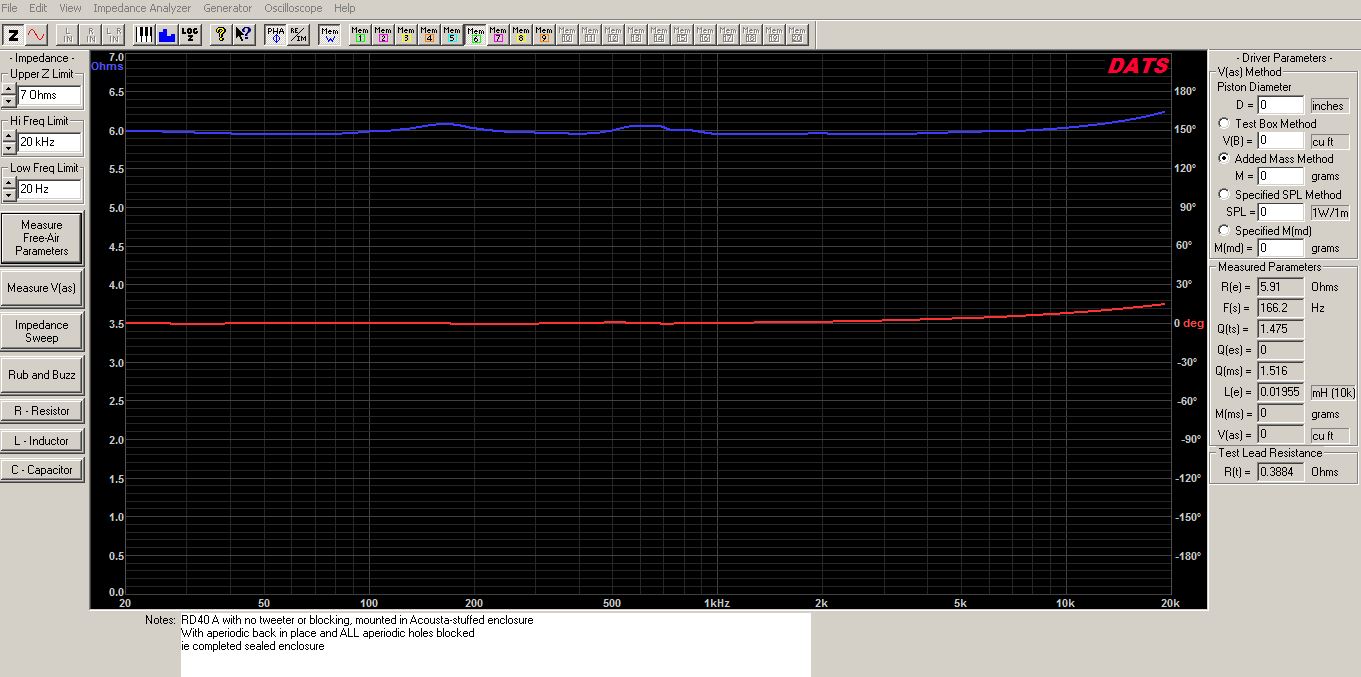 FYI, here are the impedance curves comparing the stuffed/sealed enclosure verses the stuffed/aperiodic enclosure. Both curves are basically flat lines at 6 ohms except for slight bumps here and there. The completely sealed version has a little bump around 175Hz related to the increased SPL at 200Hz. The small bump at about 600Hz is a little bit smaller for the completely sealed version. Neither version shows any bump in the 5 to 6kHz region.