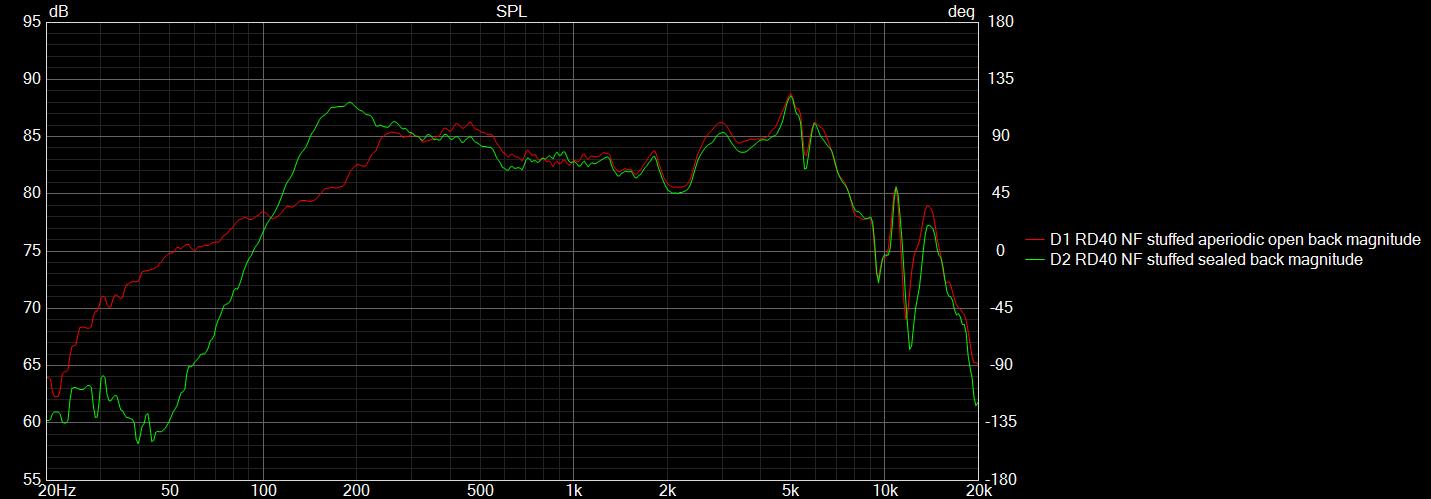 I did some NF measurements of the RD40 in the stuffed sealed cabinet verses the stuffed aperiodic open cabinet configurations. I was not sure how to do a NF measurement on a driver that is 35.5" long, but it seemed to work OK. Mic tip was about 1/4" above the center of the diaphragm. The sealed back NF measurement has an inverse baffle step slope that flattens out perfectly when I apply the diffraction correction model. A 150Hz xover looks like it will work very well with this configuration. The aperiodic configuration, OTOH, drops off quickly below 300Hz and would need an xover of about 250Hz or so. So I think I am going to drop the entire aperiodic idea and seal the back. Probably glue a long board over the vent holes from the inside so that I do not have to re-do the entire back panel.