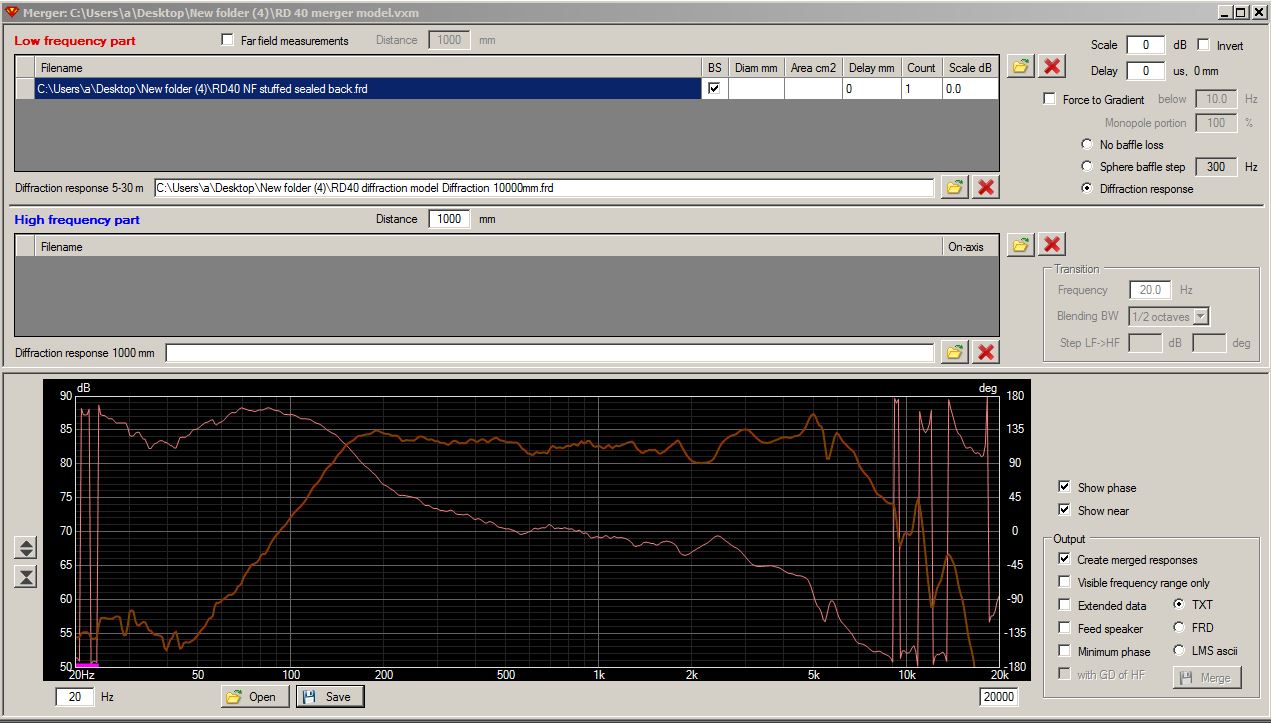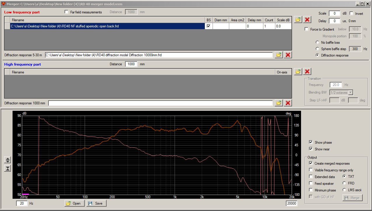 I’ll try to explain as best I can. The green curve in post #90 above is a near field (NF) measurement of the sealed back RD40 configuration. NF measurements are generally accurate below 500Hz or so, but they do NOT include low frequency stepping losses created by a thin baffle board. So, I created a diffraction model of my 41x6.5" baffle board using VituixCAD’s diffraction tool. I then imported this diffraction model and the NF measurement into VituixCAD’s merger tool, and added the two curves together. The result is a corrected curve that accounts for the full 6dB of baffle stepping loss created by my very thin baffle board.
