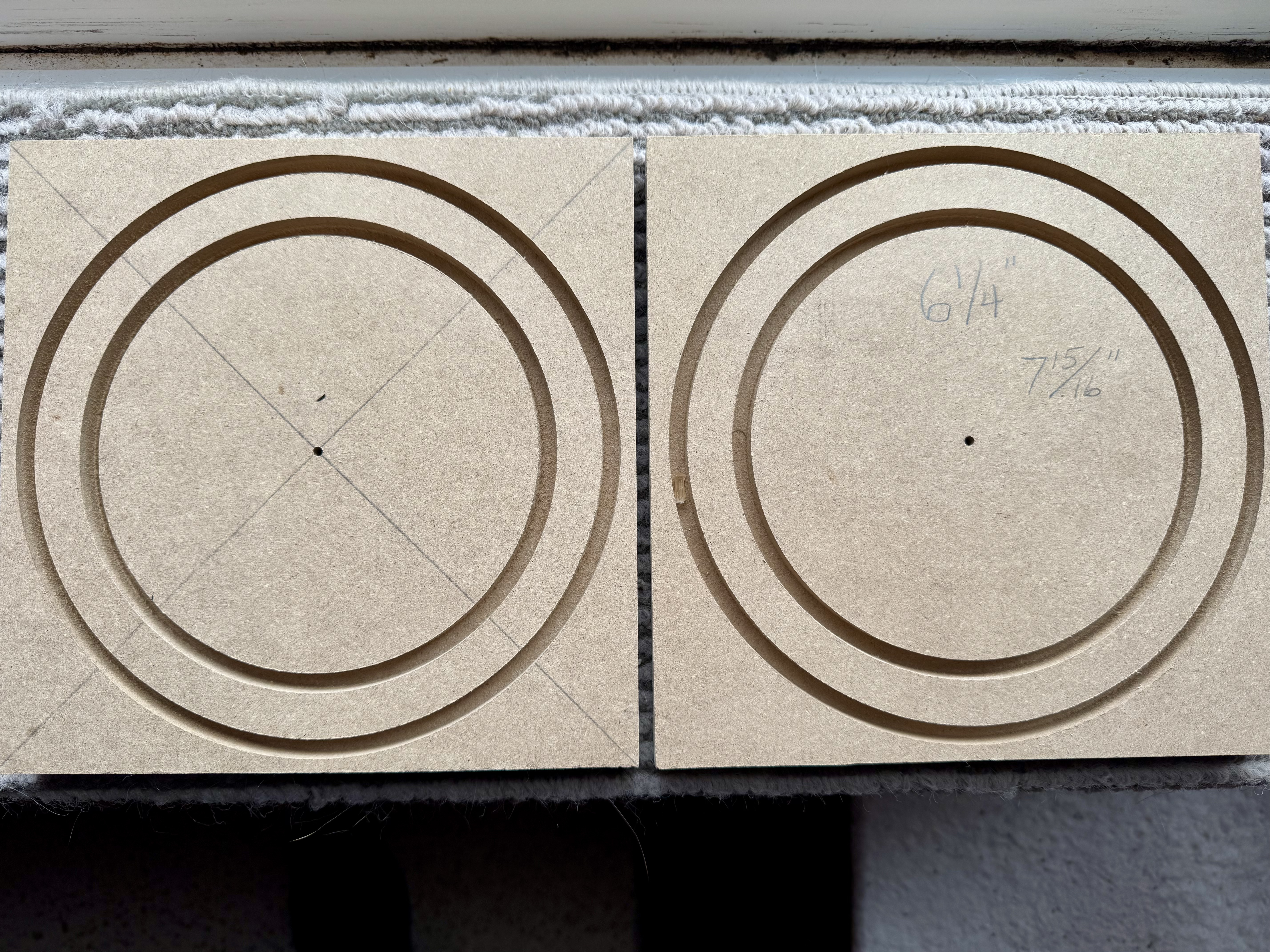 After sorting through a couple hardware stores worth of tubes and mailers I selected an outer tube with a 7-3/4” outside diameter and a Uline mailing tube with a 6-1/4” outside diameter. After cutting the tubes to a 16-1/2” length. Then I prepared the ends by routing 3/8” deep grooves in 3/4” MDF. I’ve left a bit of extra material around the perimeter because I’m not just tacking the tubes to them but making a permanent attachment. I can router away the excess at a later time, after the '“double tube” is cut in half.