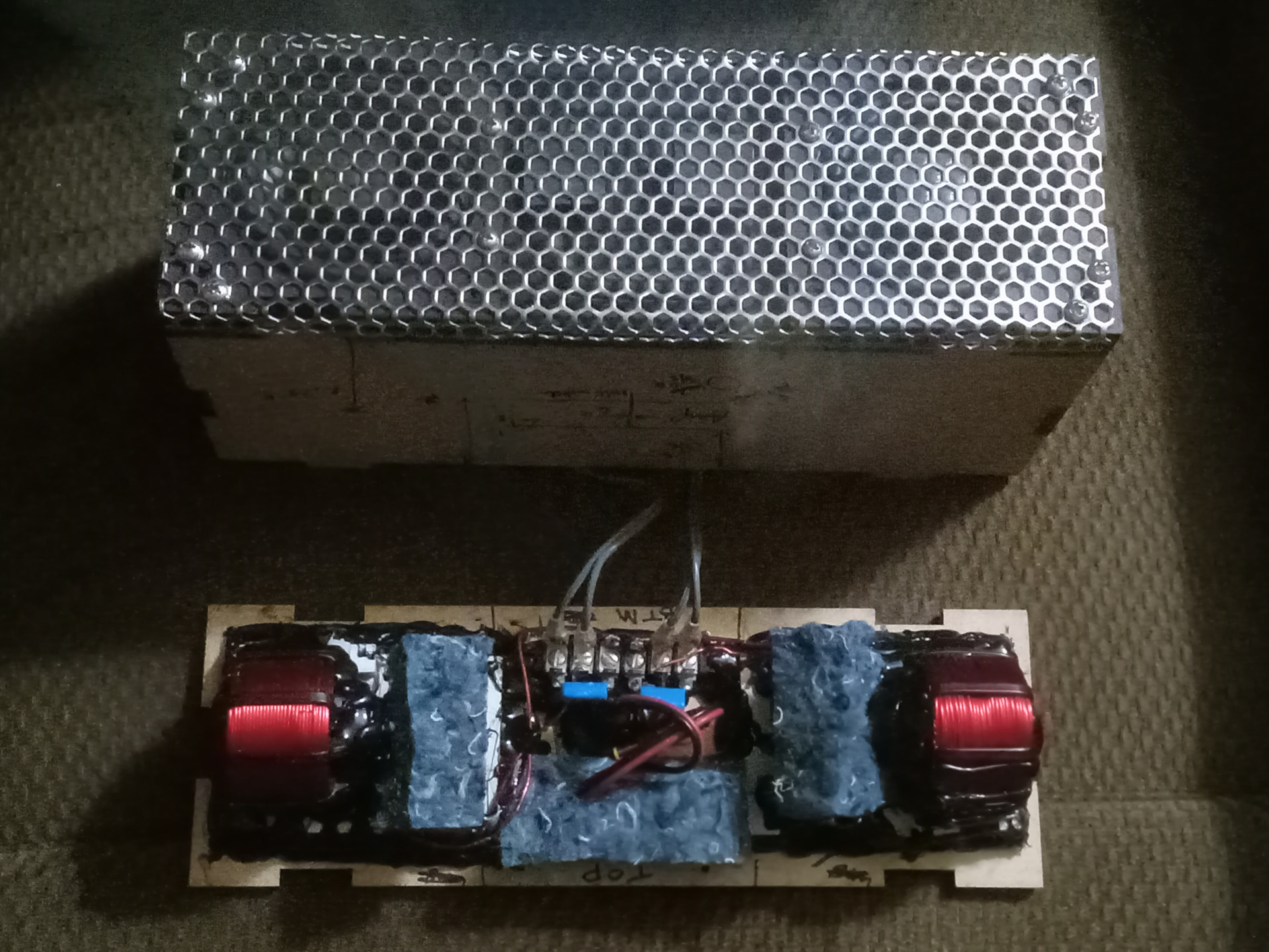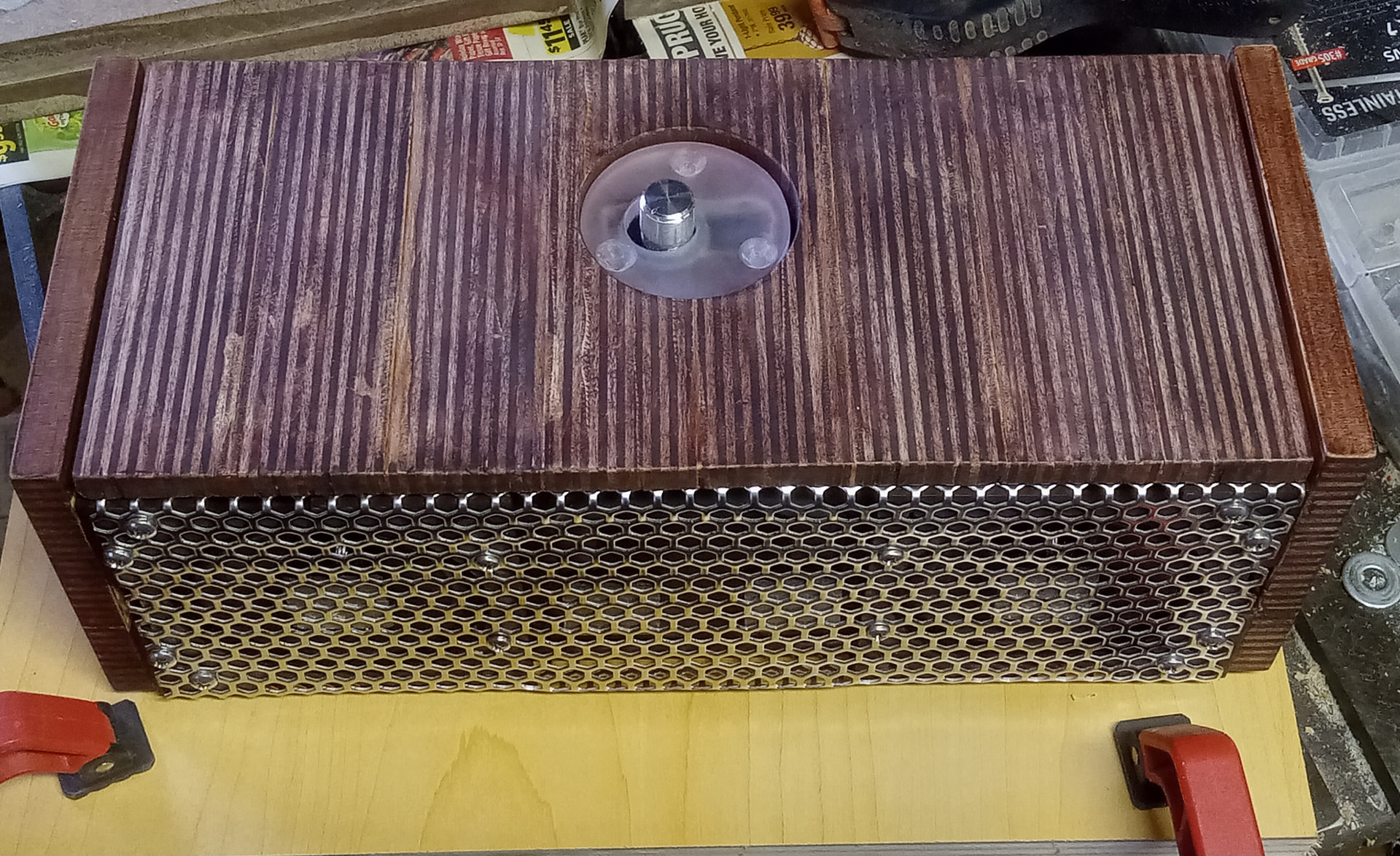 I’ve been working on this for the last couple weeks. The box was originally lazer cut for another purpose, but is applicable to this project. A pair of RS100P-8 are serving as widebands, surface mounted, and a front trim ring and aluminum grill are then mounted atop of them.