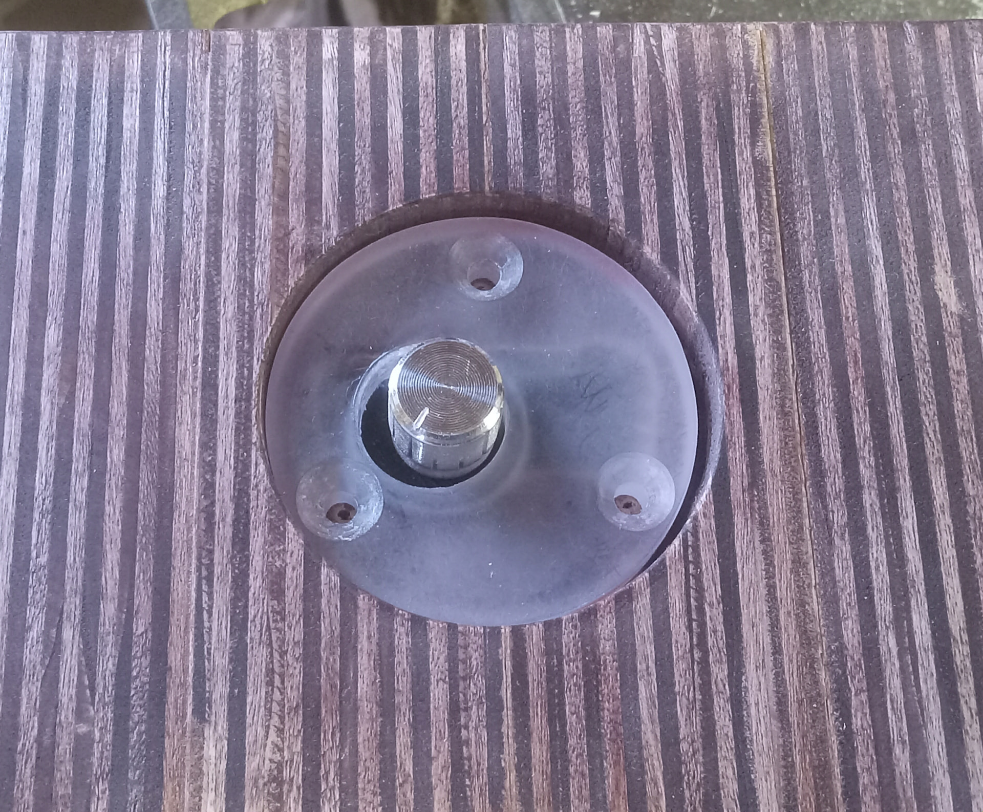 Had to figure out how to allow the blue pairing/power LED to show while looking at the boombox, and this is what I came up with. It also allows replacement of the amplifier should something go wrong. (Not shown is the black sealing gasket that goes under the amp puck.)