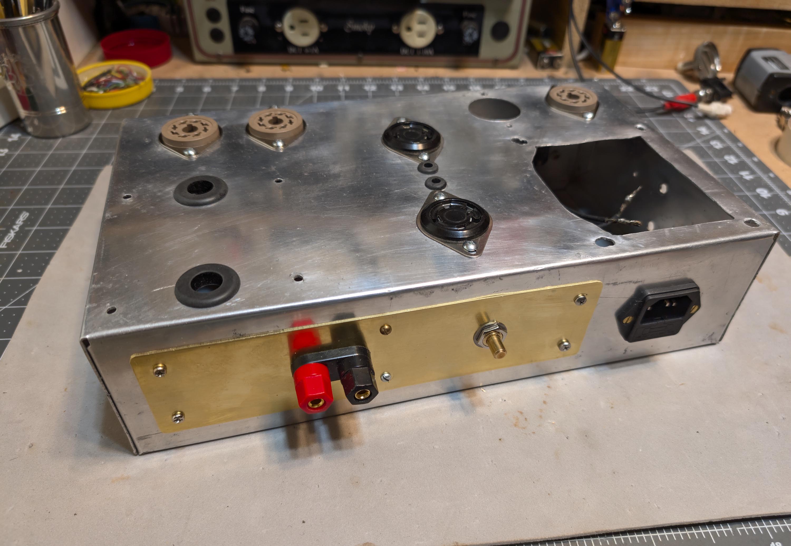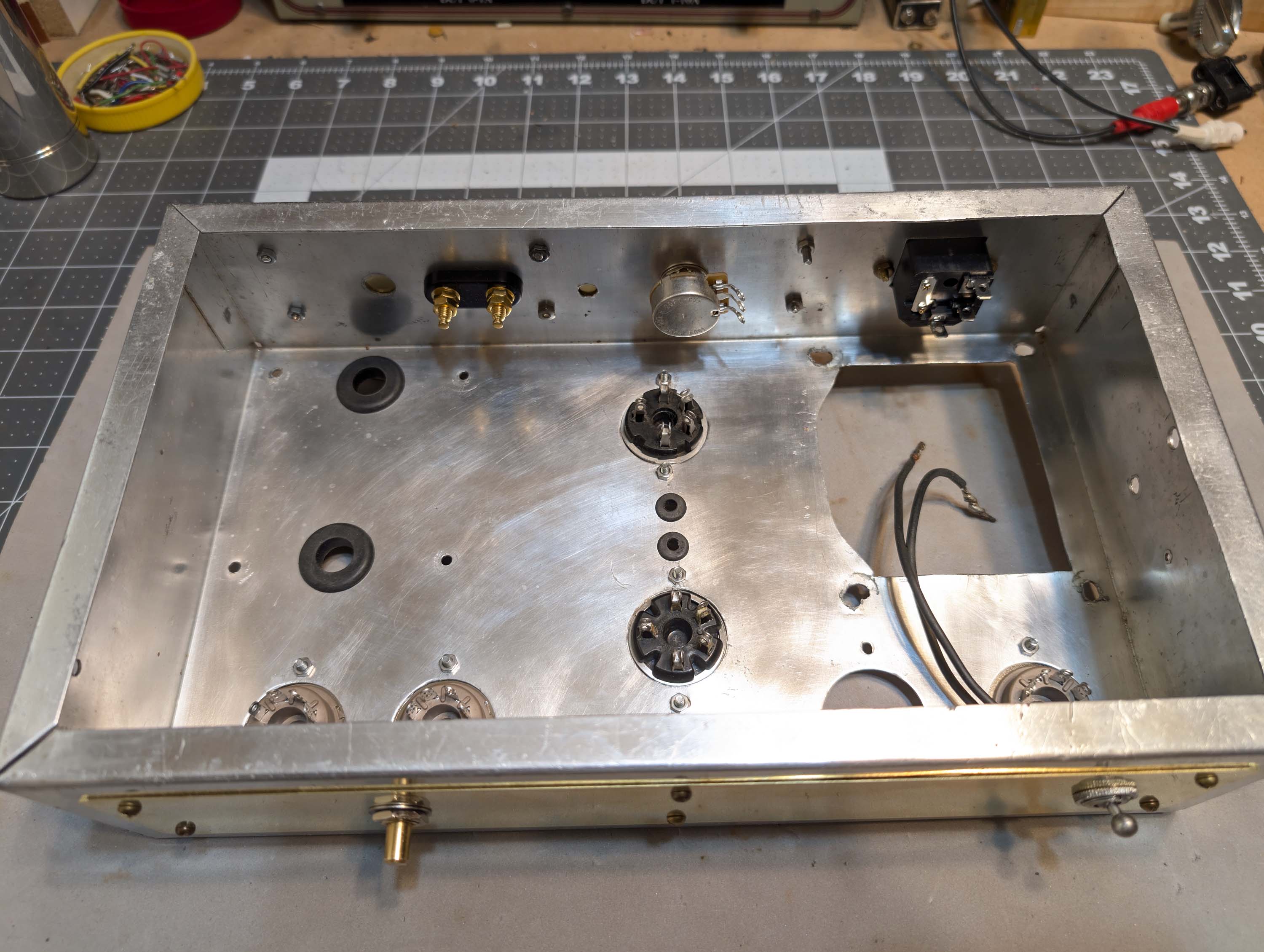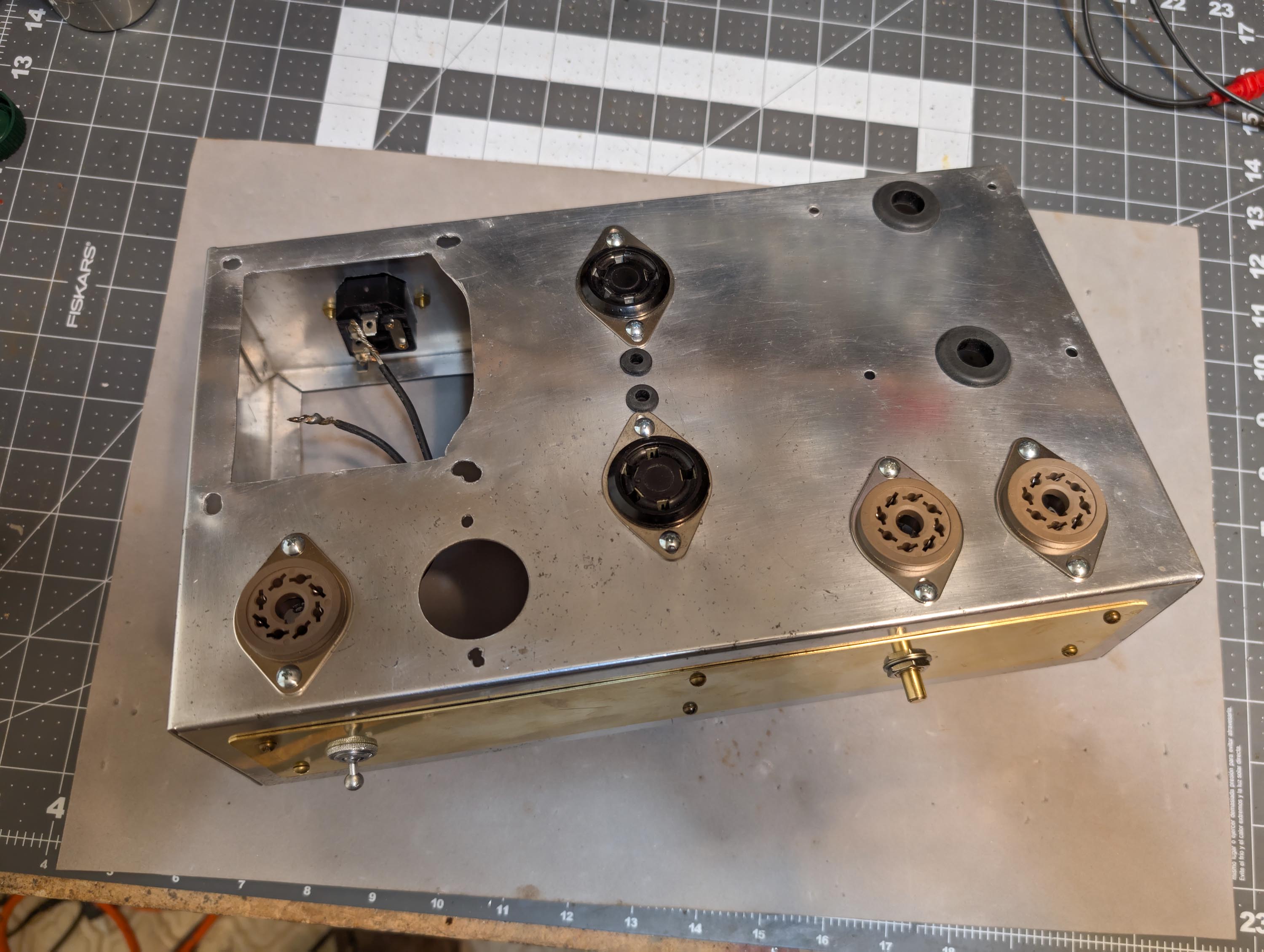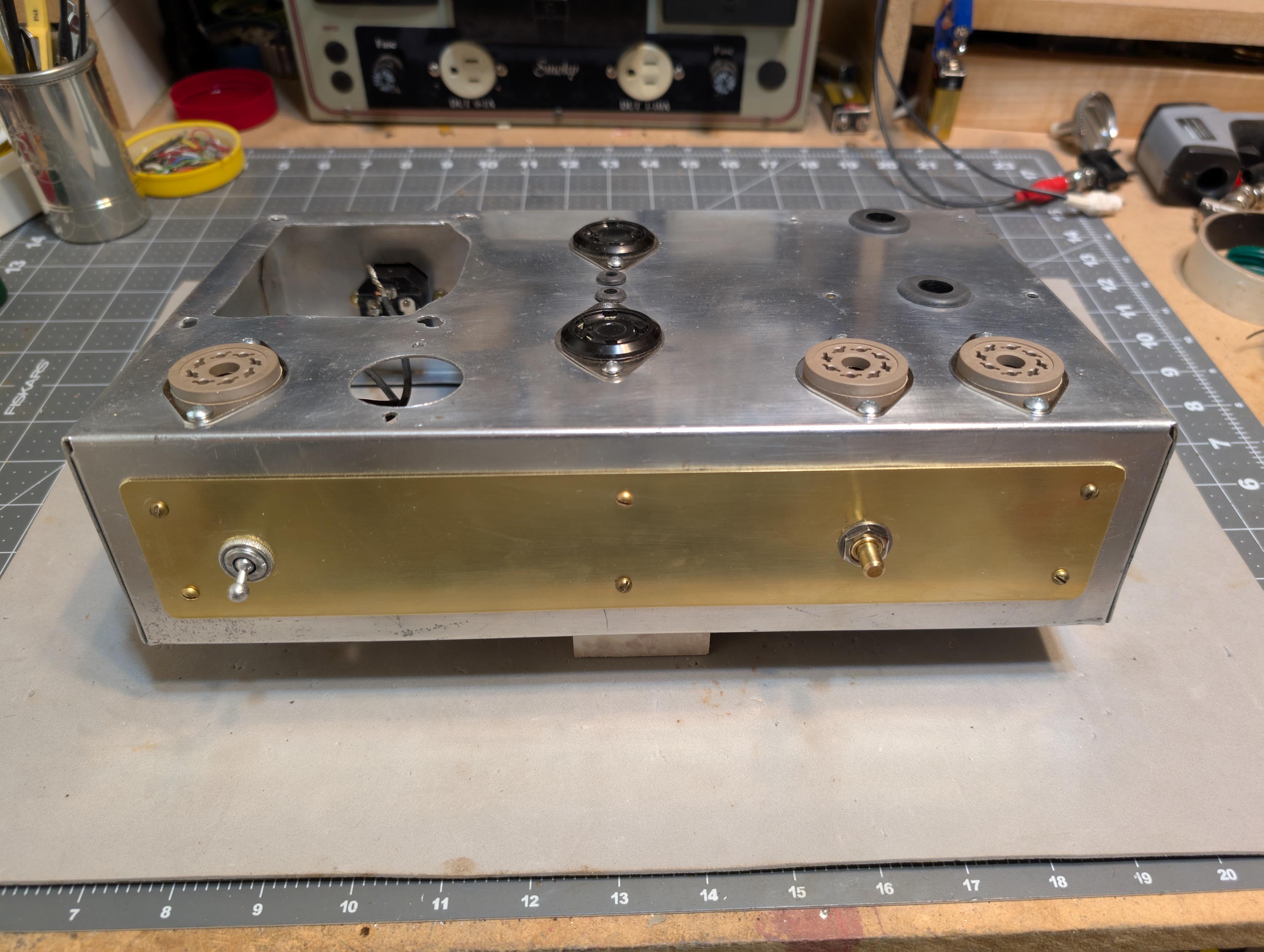 I widened the chassis wiring pass-through holes and added rubber grommets. I also cut a rectangular hole with my dremel and installed a new IEC power inlet with fuse. I covered the extra left-over holes in the front and back panels with 0.032 x 2" brass strip and then drilled it out for new pots and banana jacks. I then installed new and NOS tube sockets. The on/off switch was still good, so I re-used it. Don’t see switches like that anymore. Later on, I will add walnut side panels to dress it up a little bit and then make walnut picture frames to go around the brass strips.