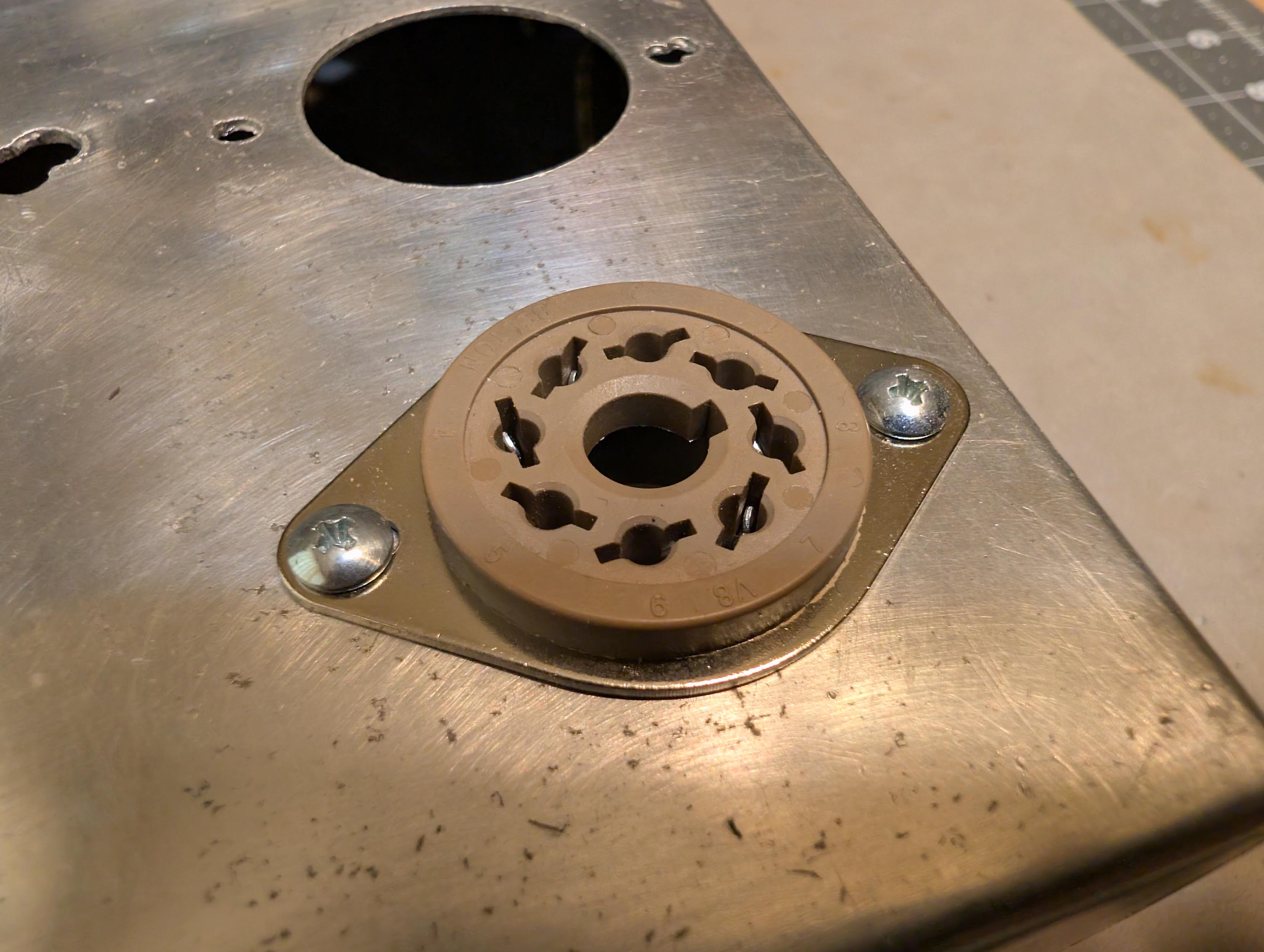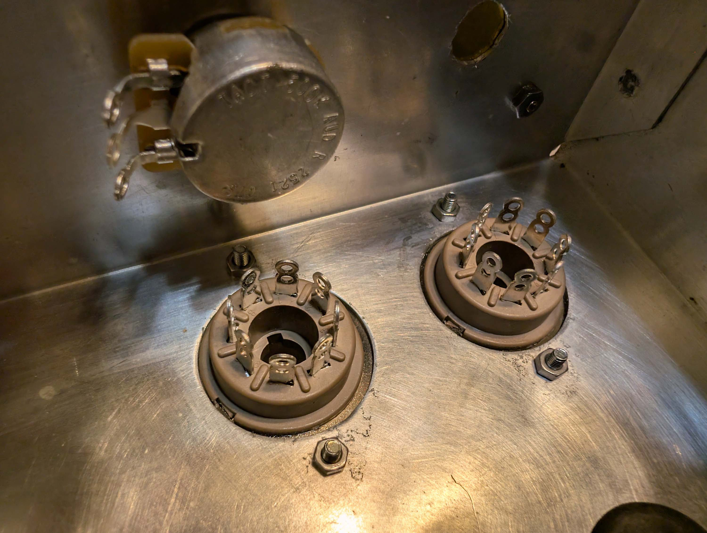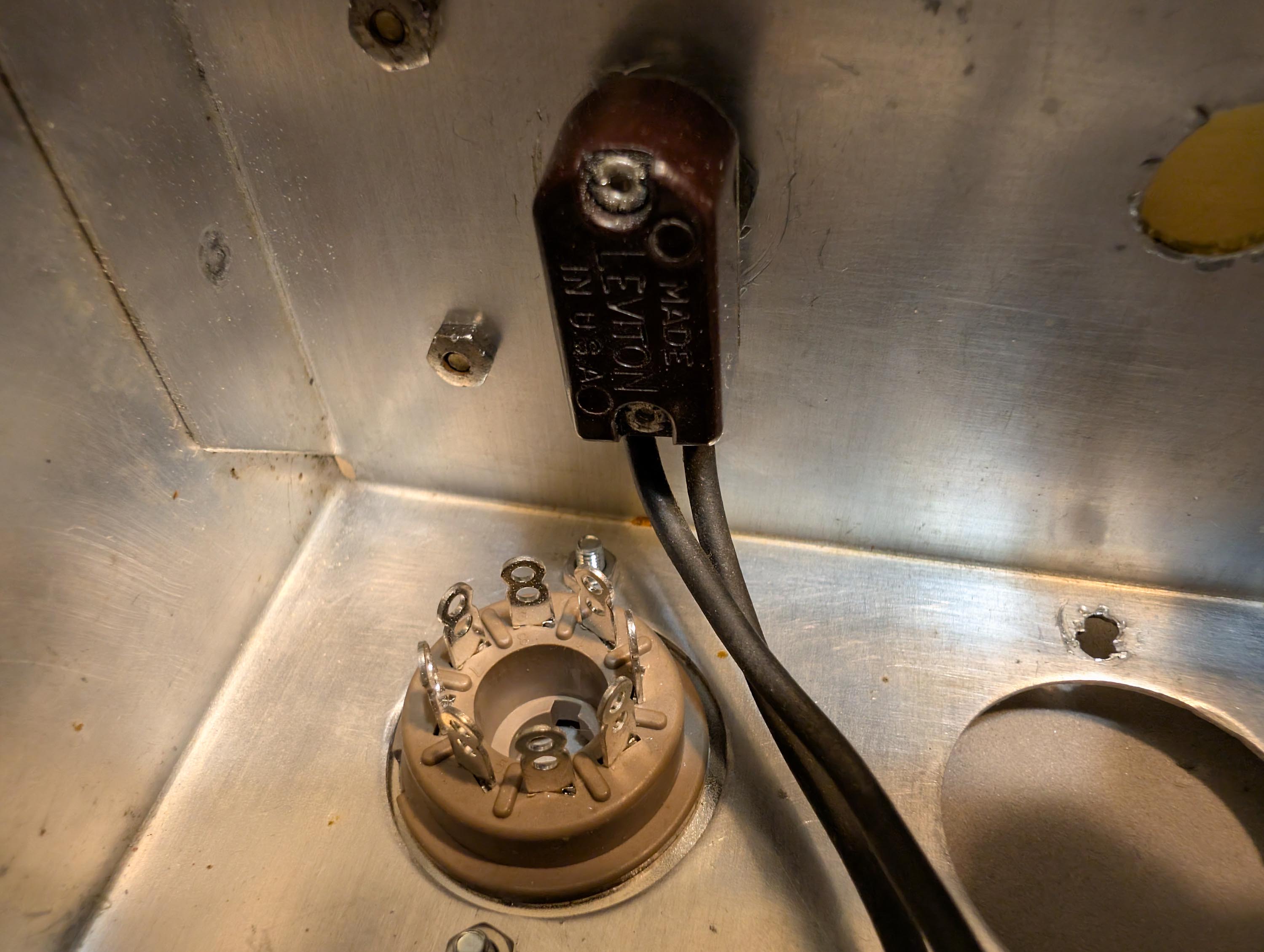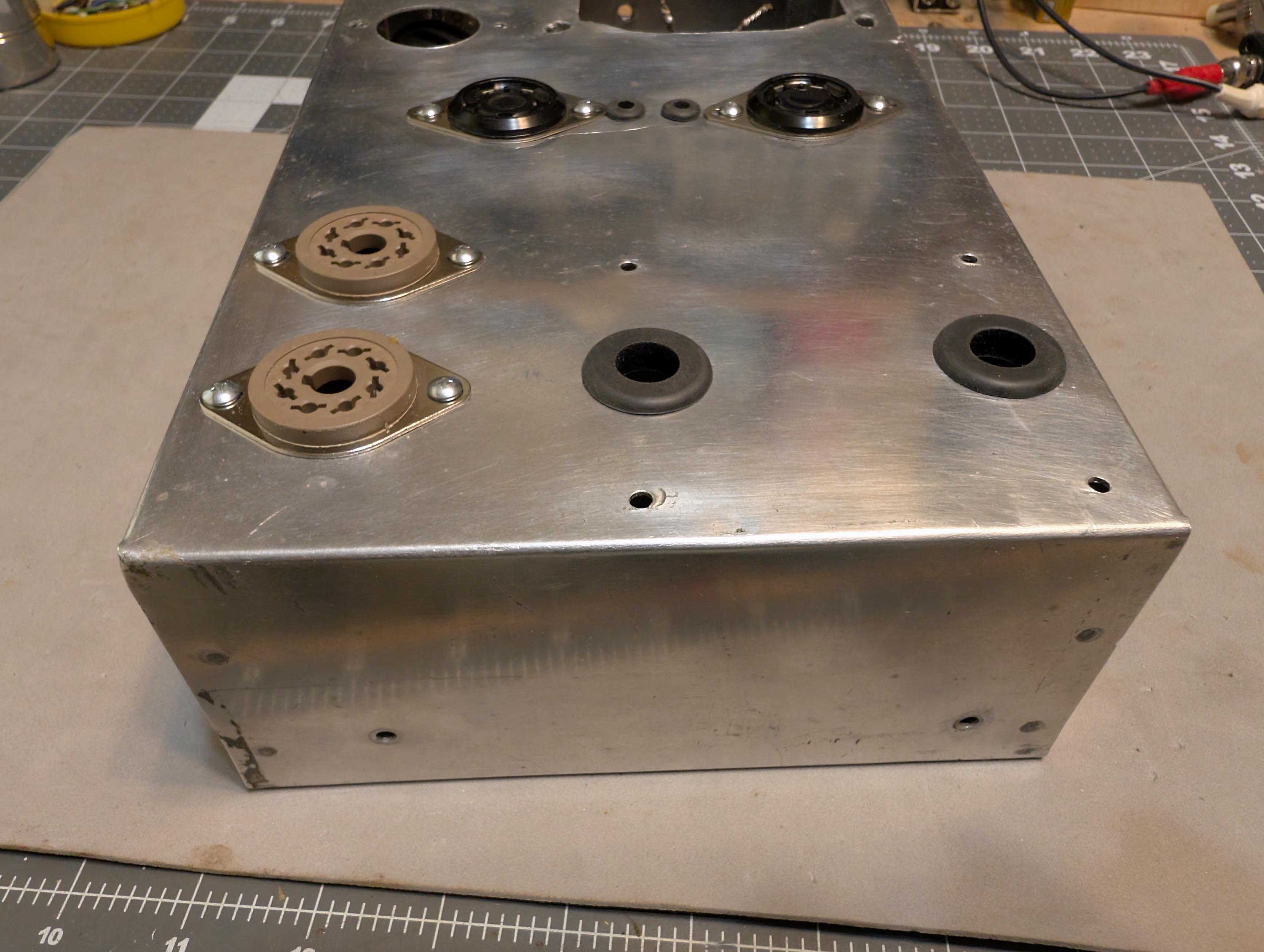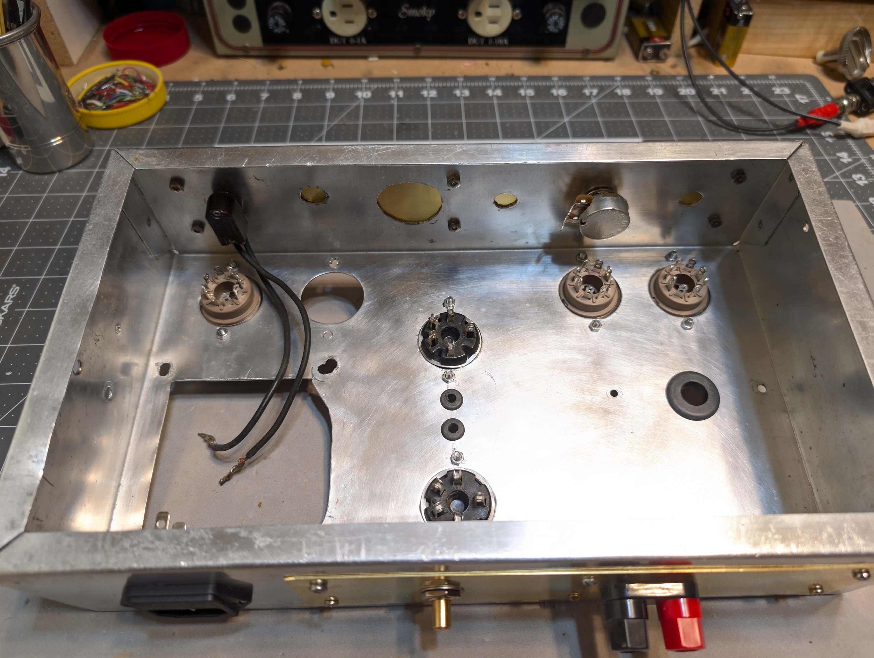 I widened the chassis wiring pass-through holes and added rubber grommets. I also cut a rectangular hole with my dremel and installed a new IEC power inlet with fuse. I covered the extra left-over holes in the front and back panels with 0.032 x 2" brass strip and then drilled it out for new pots and banana jacks. I then installed new and NOS tube sockets. The on/off switch was still good, so I re-used it. Don’t see switches like that anymore. Later on, I will add walnut side panels to dress it up a little bit and then make walnut picture frames to go around the brass strips.
