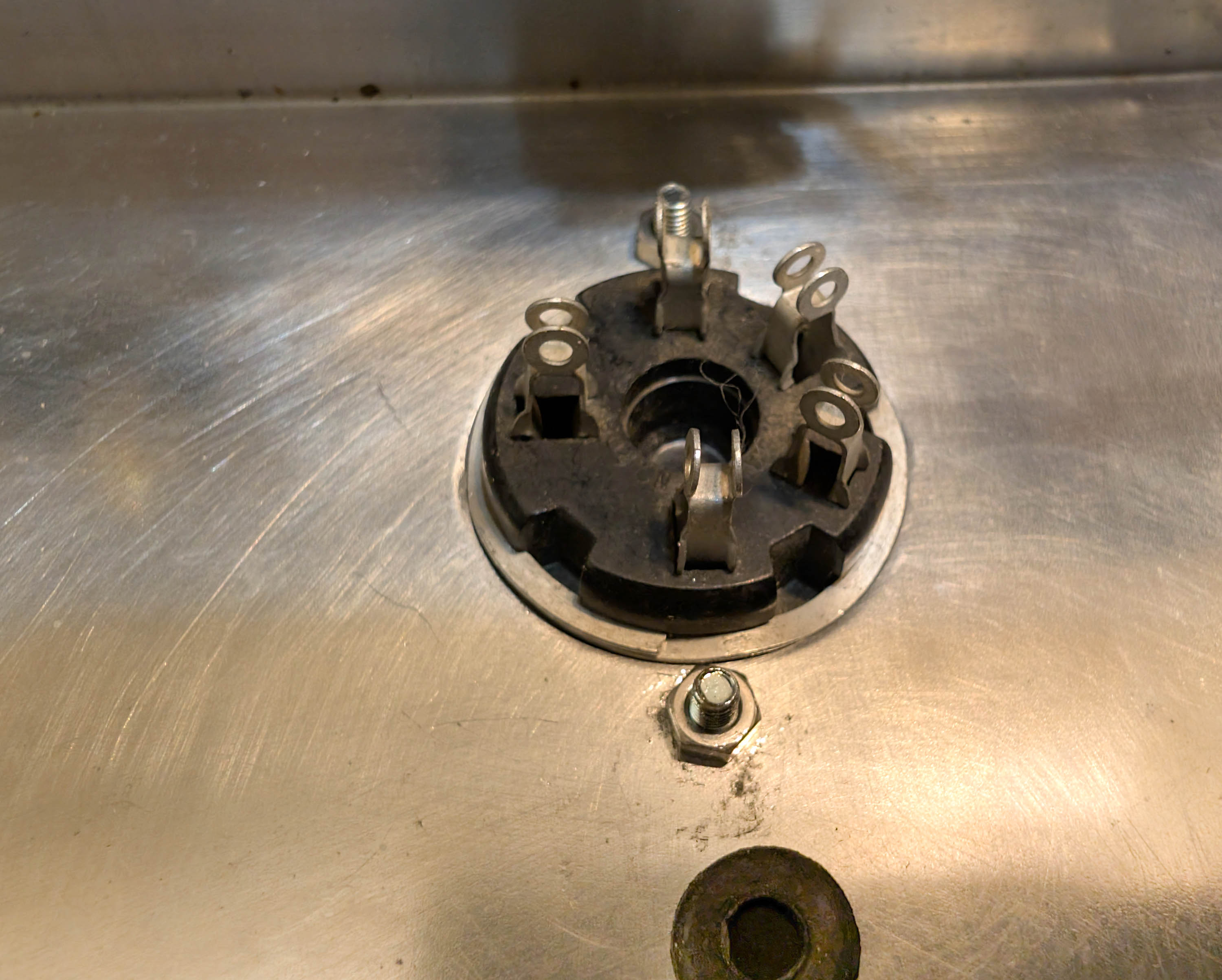 Made a little progress since my last post. I removed everything from the chassis and then cleaned and buffed it out. As you can see in the photos, many of the holes have been somewhat bodged over the years. But everything is still mechanically sound and once the transformers are cleaned up and re-installed, you will never see any of the bodged up mounting holes.