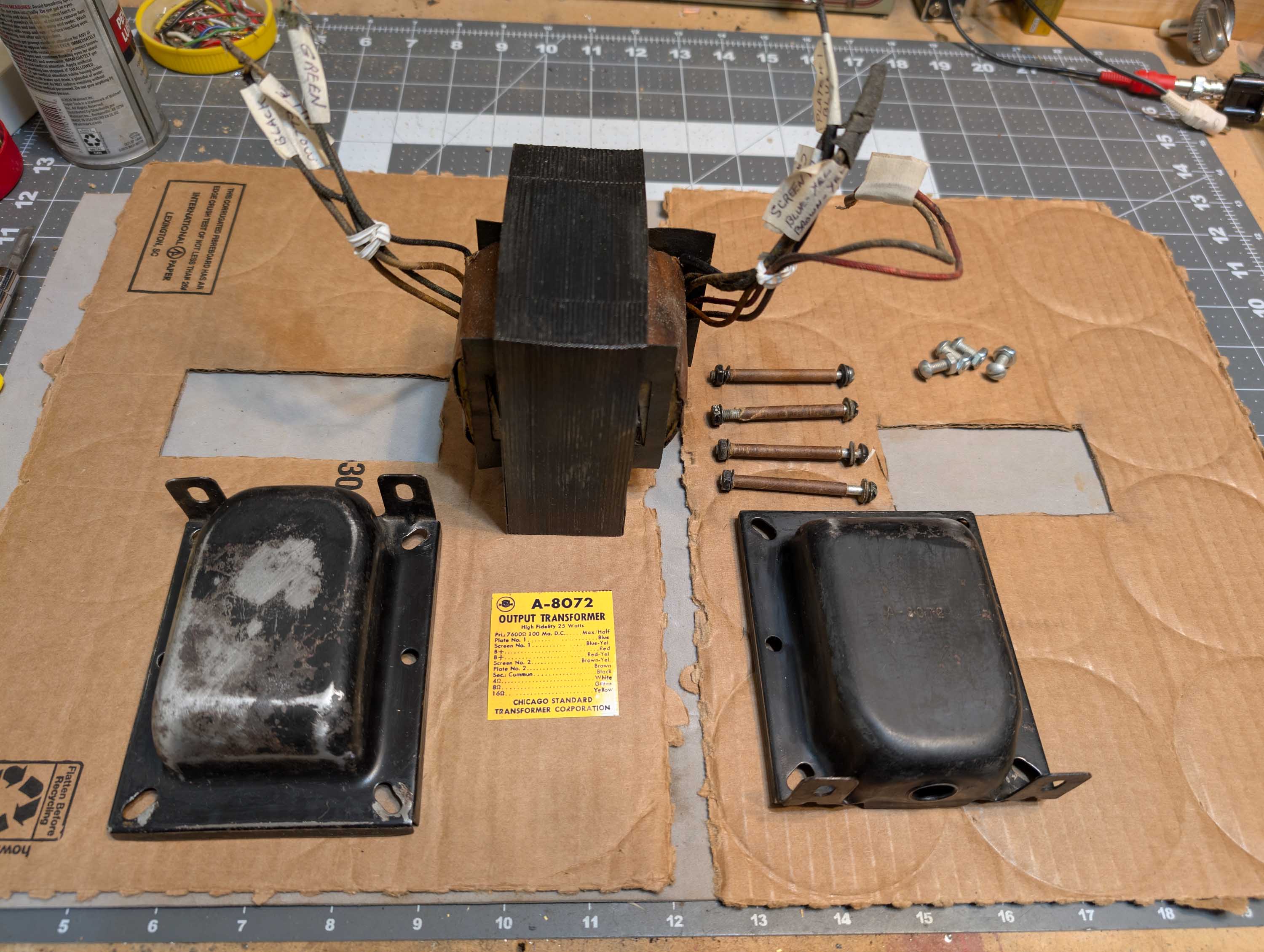 The original Stancor A-8072 wiring code label was destroyed during the cleaning and sanding process, so I made a new label in photoshop and printed it onto high gloss photo paper. I’ll stick this new label on with double-sided carpet tape after the priming/painting process is complete.