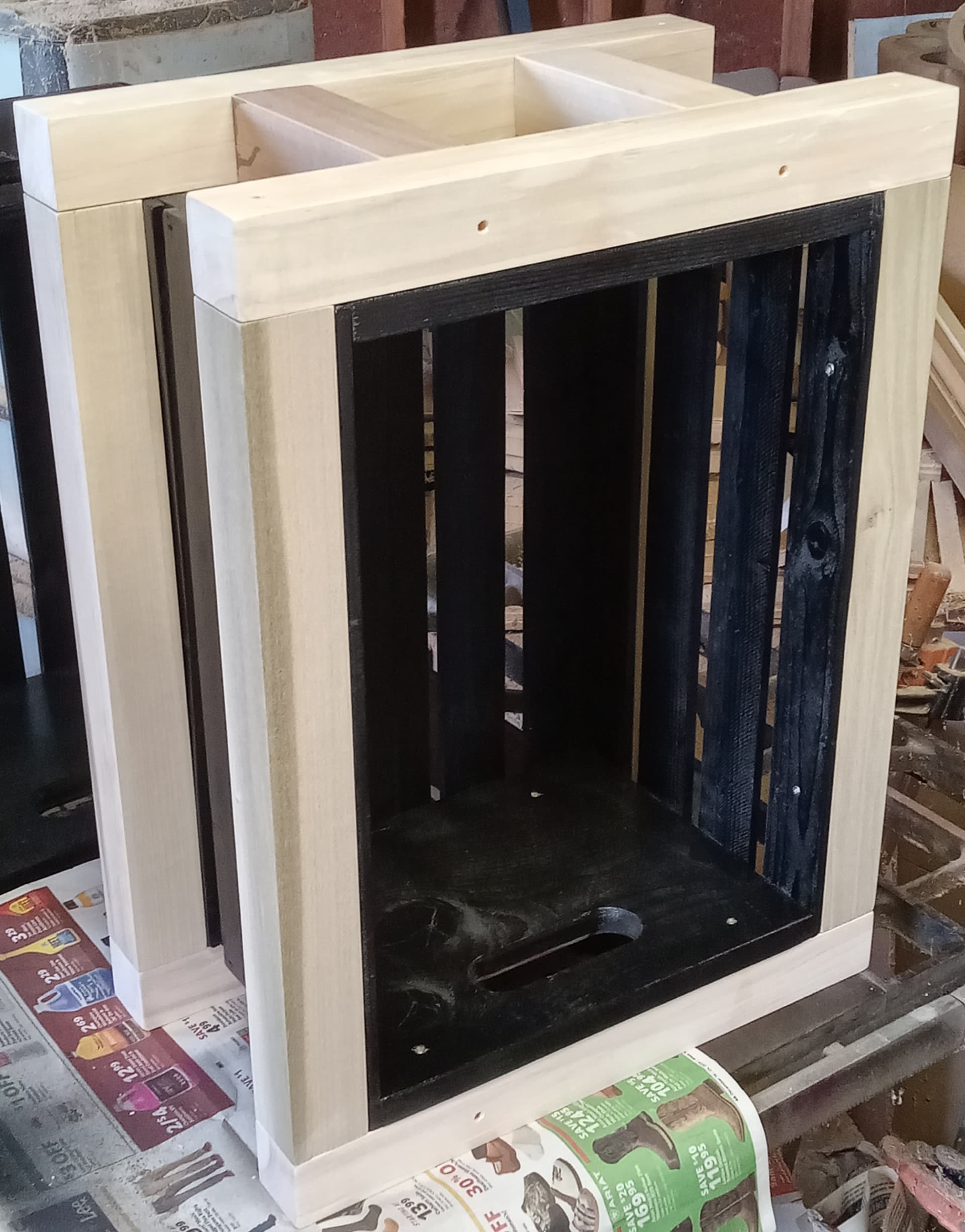 Both crates are painted and dry. I gave both crates and poplar 2x2 a good sand with 150 grit and laid on hammered black then gloss black on the crates. Used up 2 stray paint cans I had on hand.