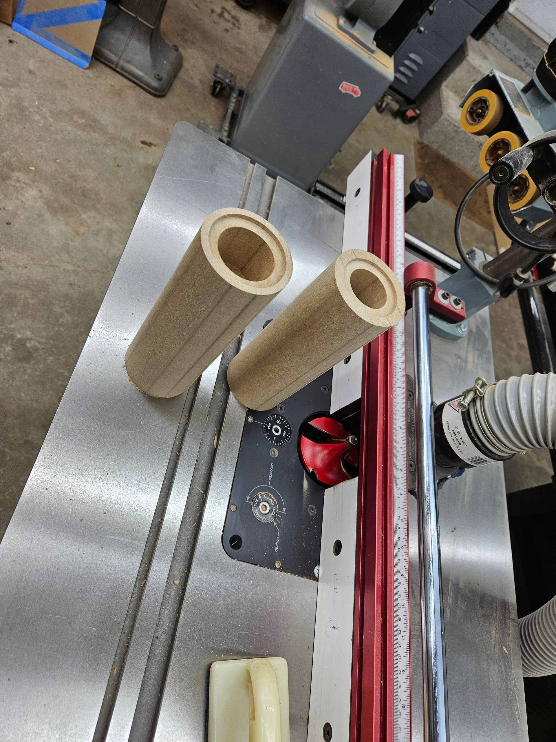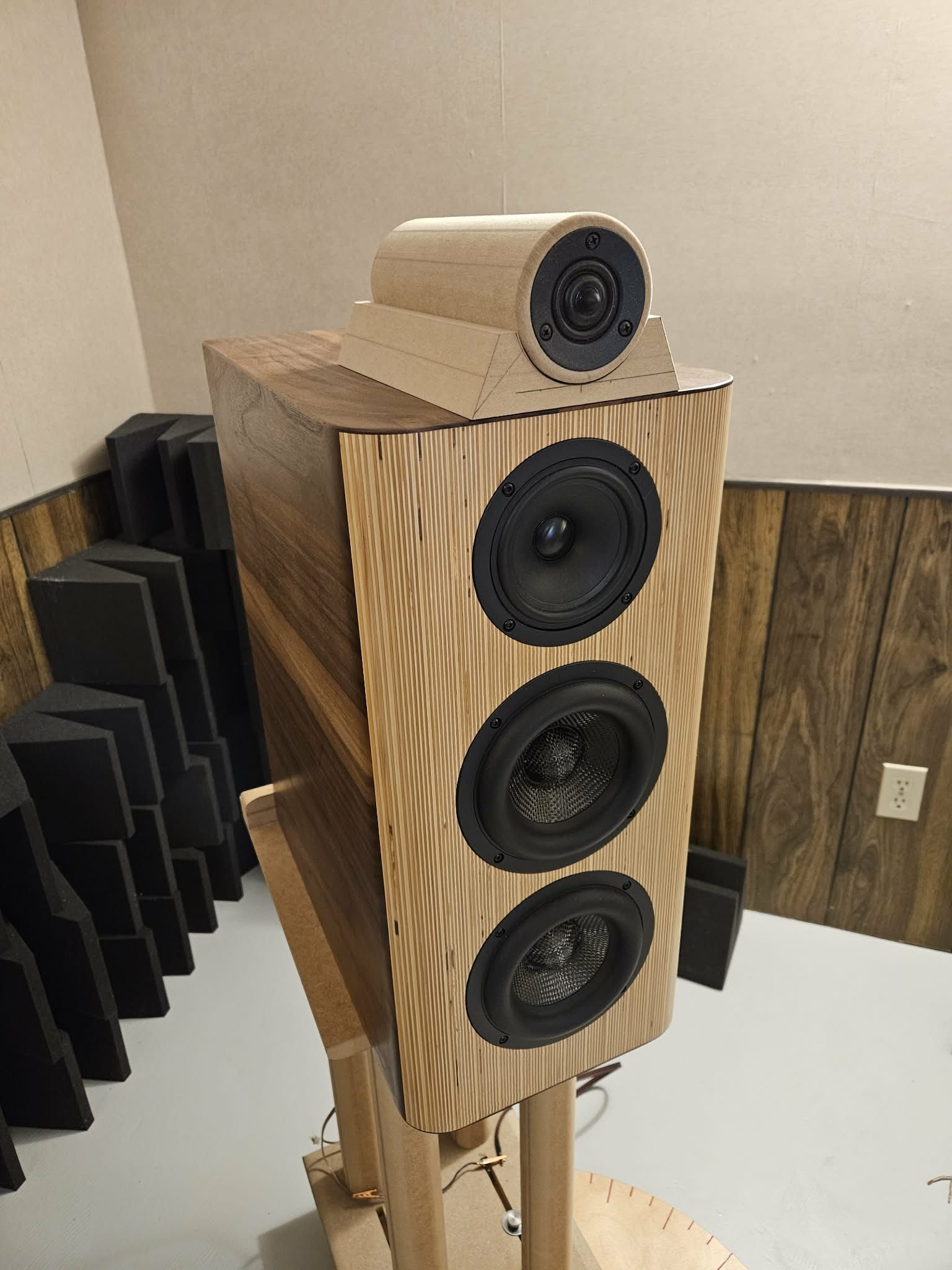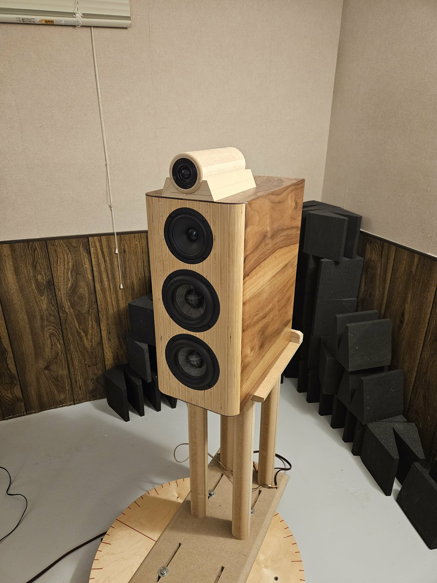 The tube is 4 pieces of 3/4” MDF glued together, rounded over all four sides with a 1.5” roundover bit. Top is drilled with a forstner bit for the tweeter body and the rebate is made with a router on jig for each size tweeter.