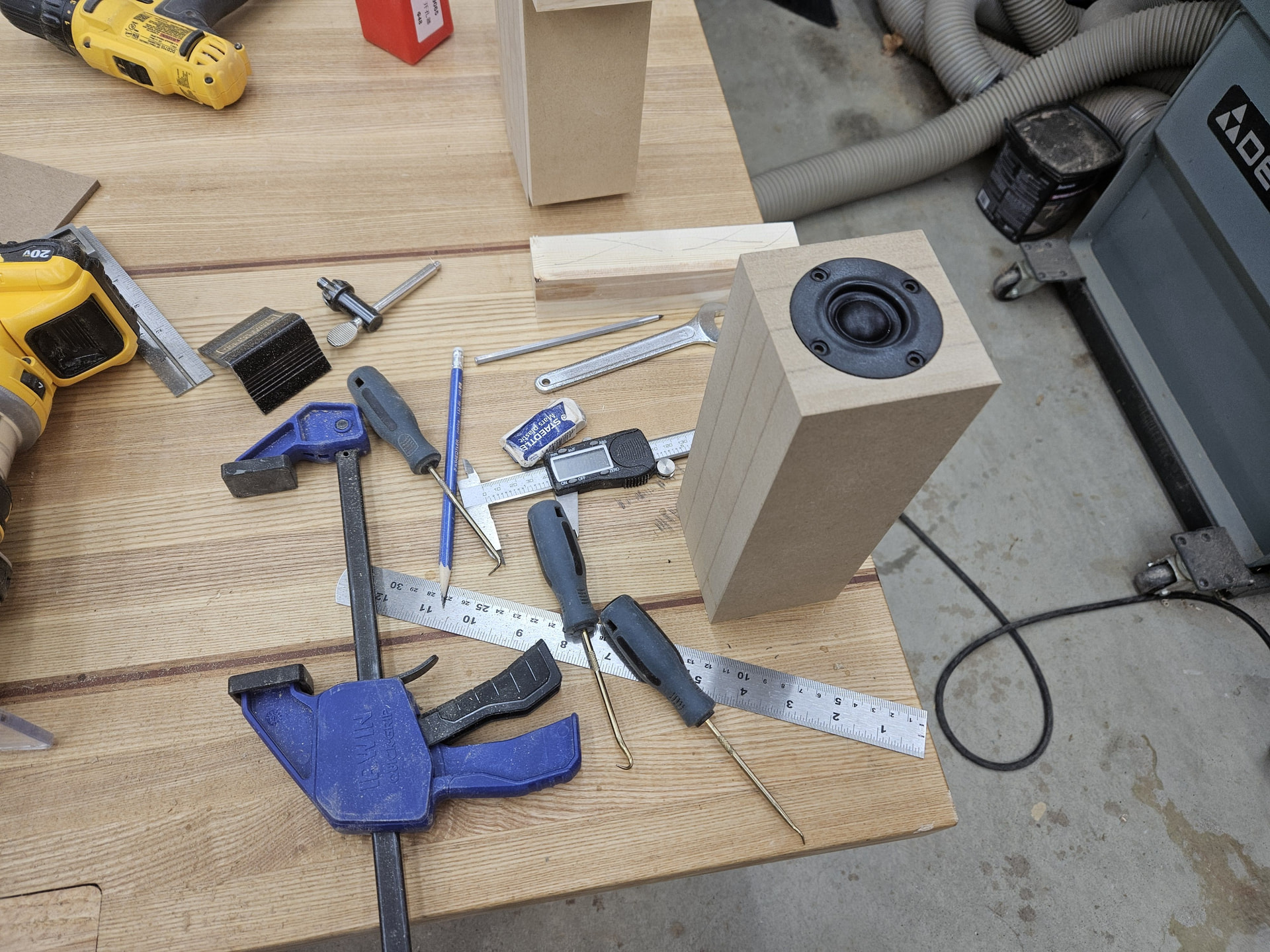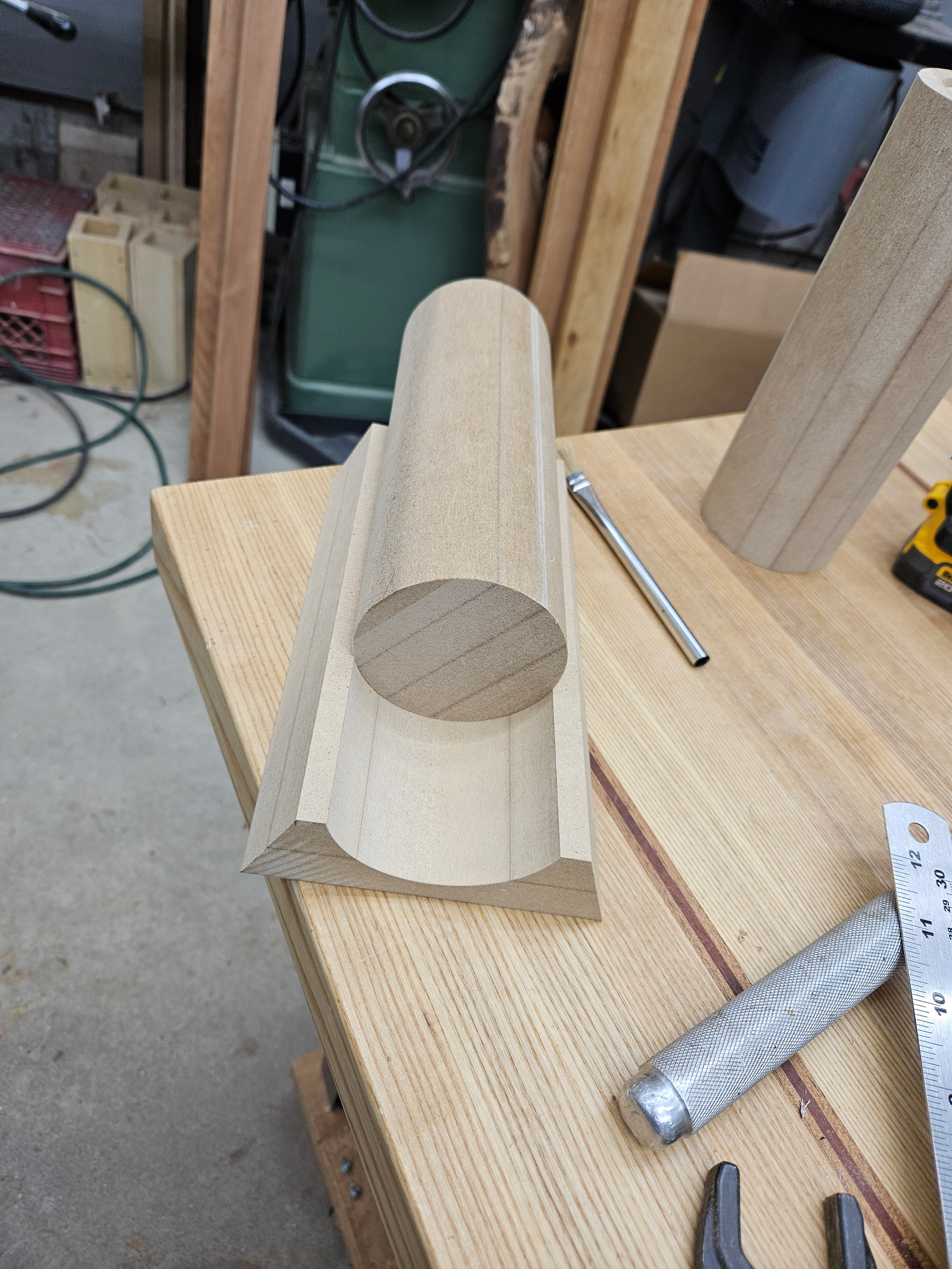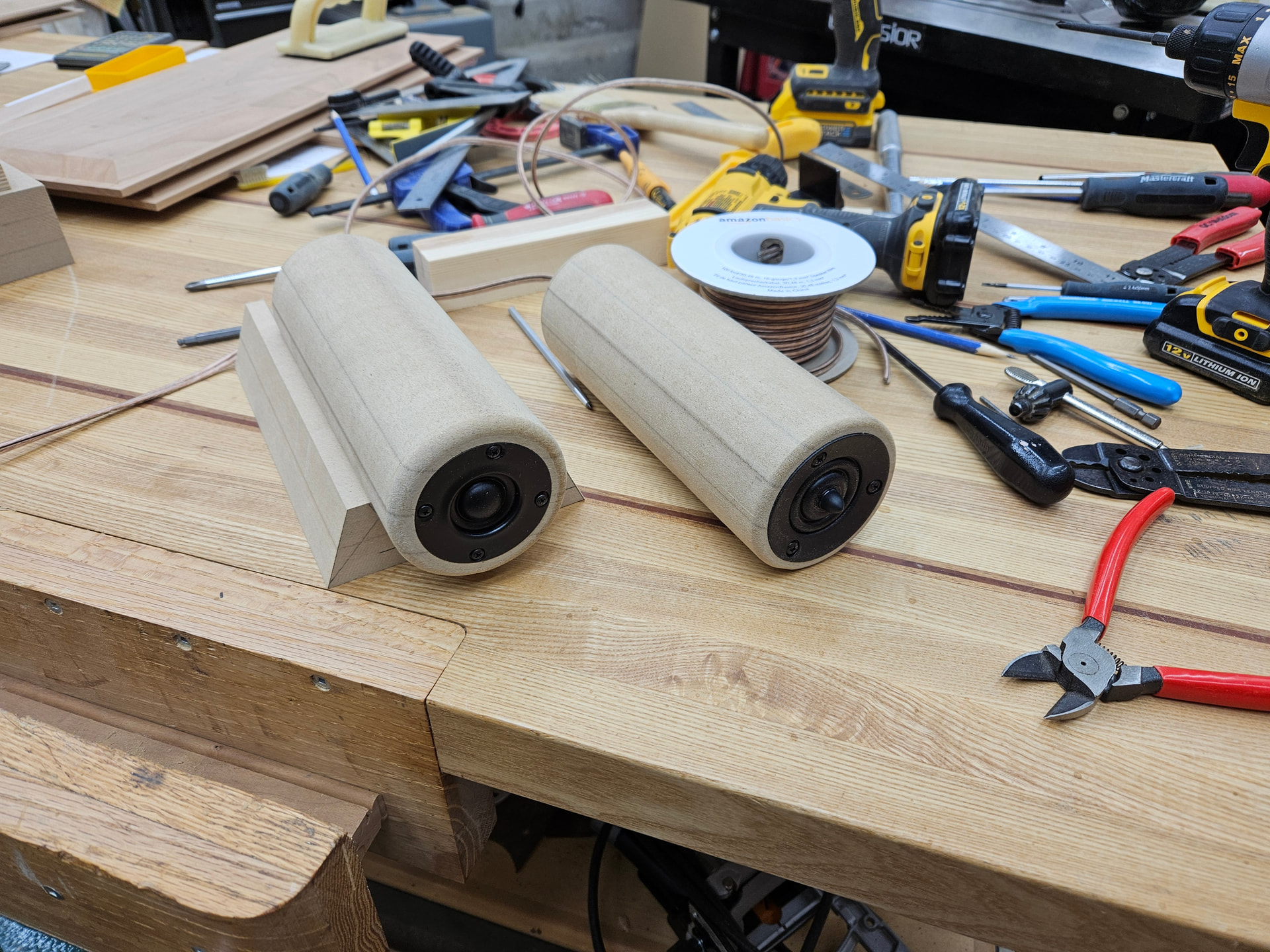 The tube is 4 pieces of 3/4” MDF glued together, rounded over all four sides with a 1.5” roundover bit. Top is drilled with a forstner bit for the tweeter body and the rebate is made with a router on jig for each size tweeter.