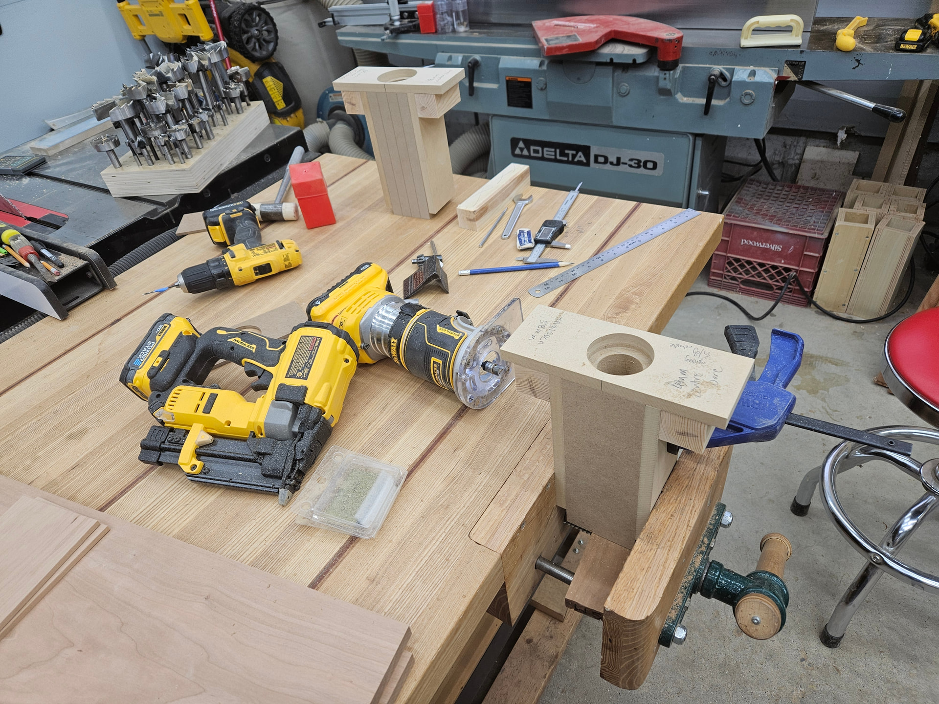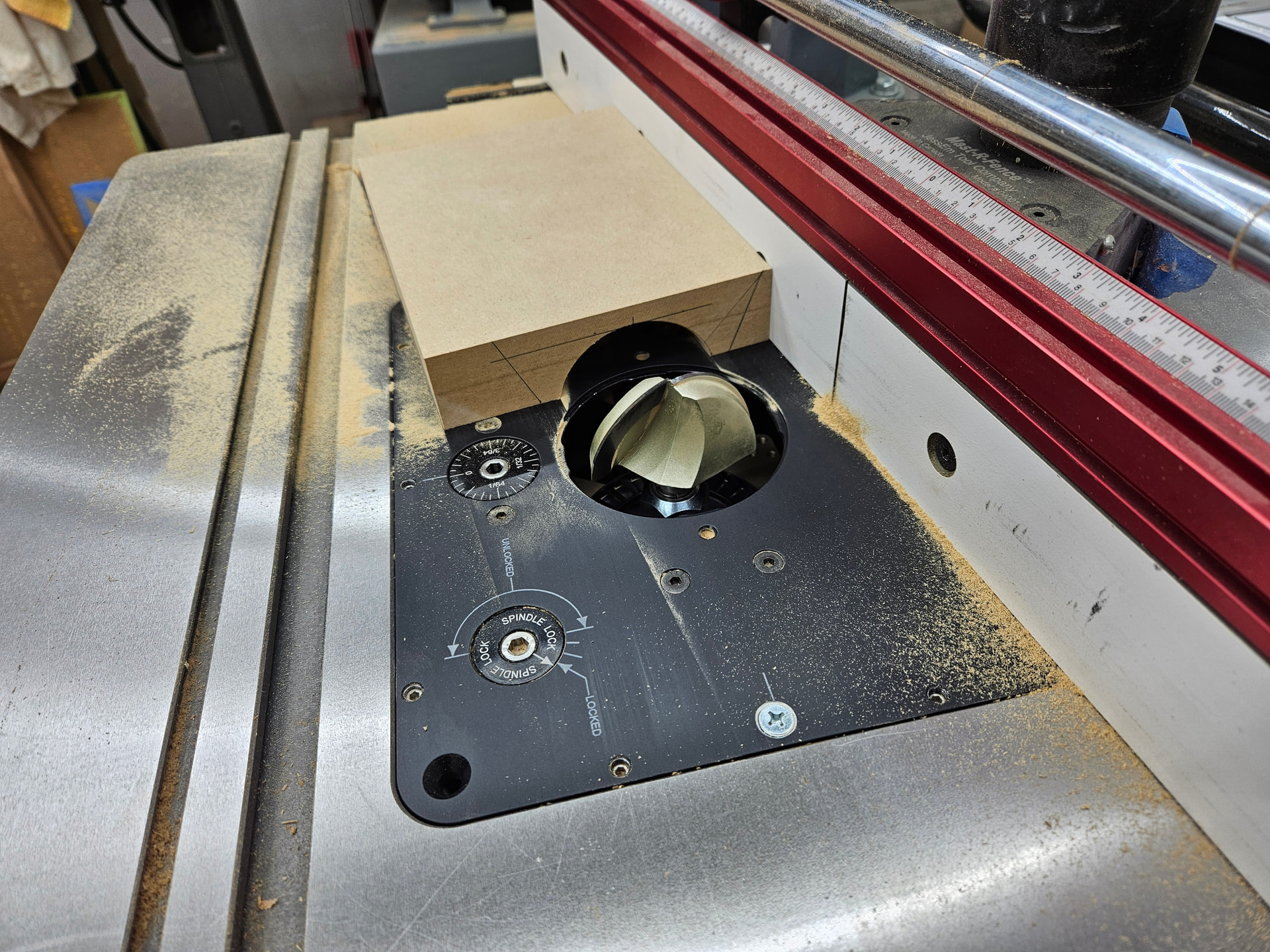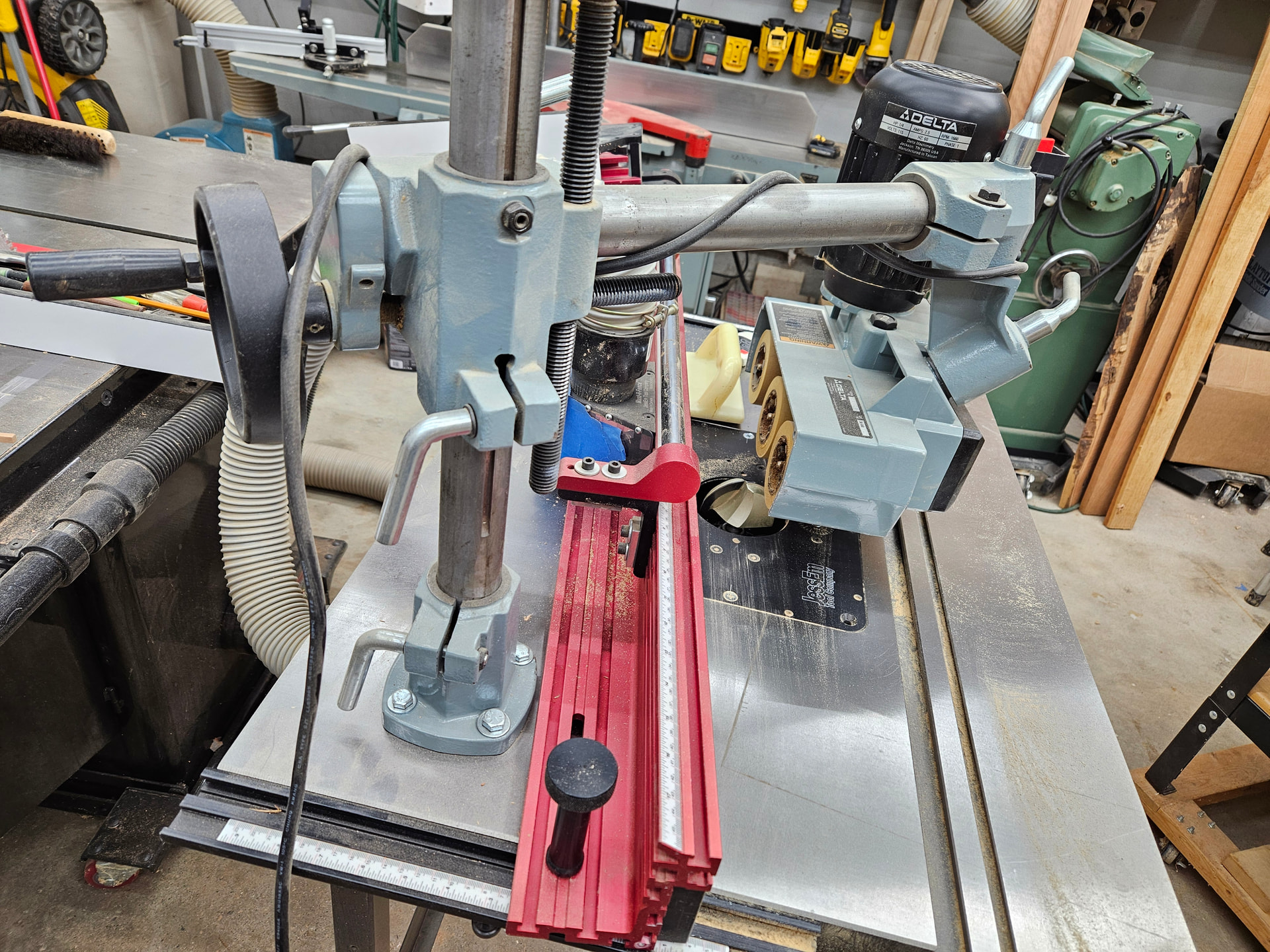 Thing with wheels on router table is a power feeder. The router table is the only machine that has ever bit me, so I bought it 20-25 years ago. I use it for repetitive cuts on long stock, like trim or cabinet door rail and stile stock.