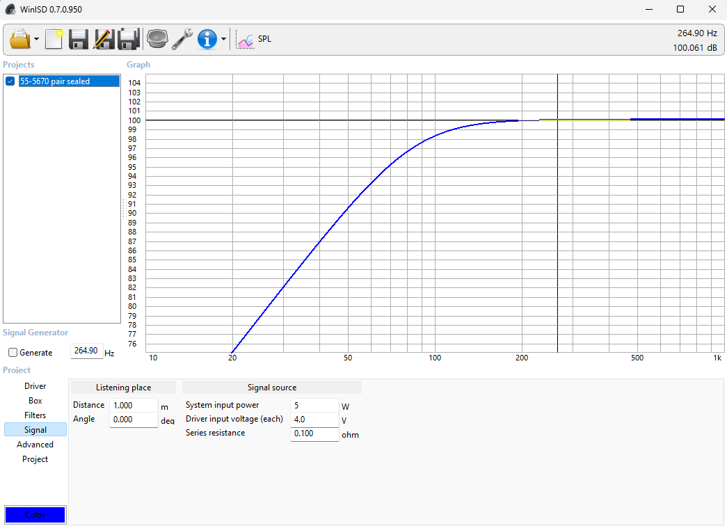 With a sealed box volume of 0.25ft^3, F3 is 72 Hz, but Xmax is reached around 10W. In 0.125 ft^3 (3.5L) the F3 rises to 77L and Xmax is reached around 12W but 15W is probably fine, and Xmax doesn’t go off to the races below a tuning frequency. So that might be the best configuration for a satellite speaker using this driver - sealed with box volume between 3.5L and 7L. Or ported, and accept the bump.