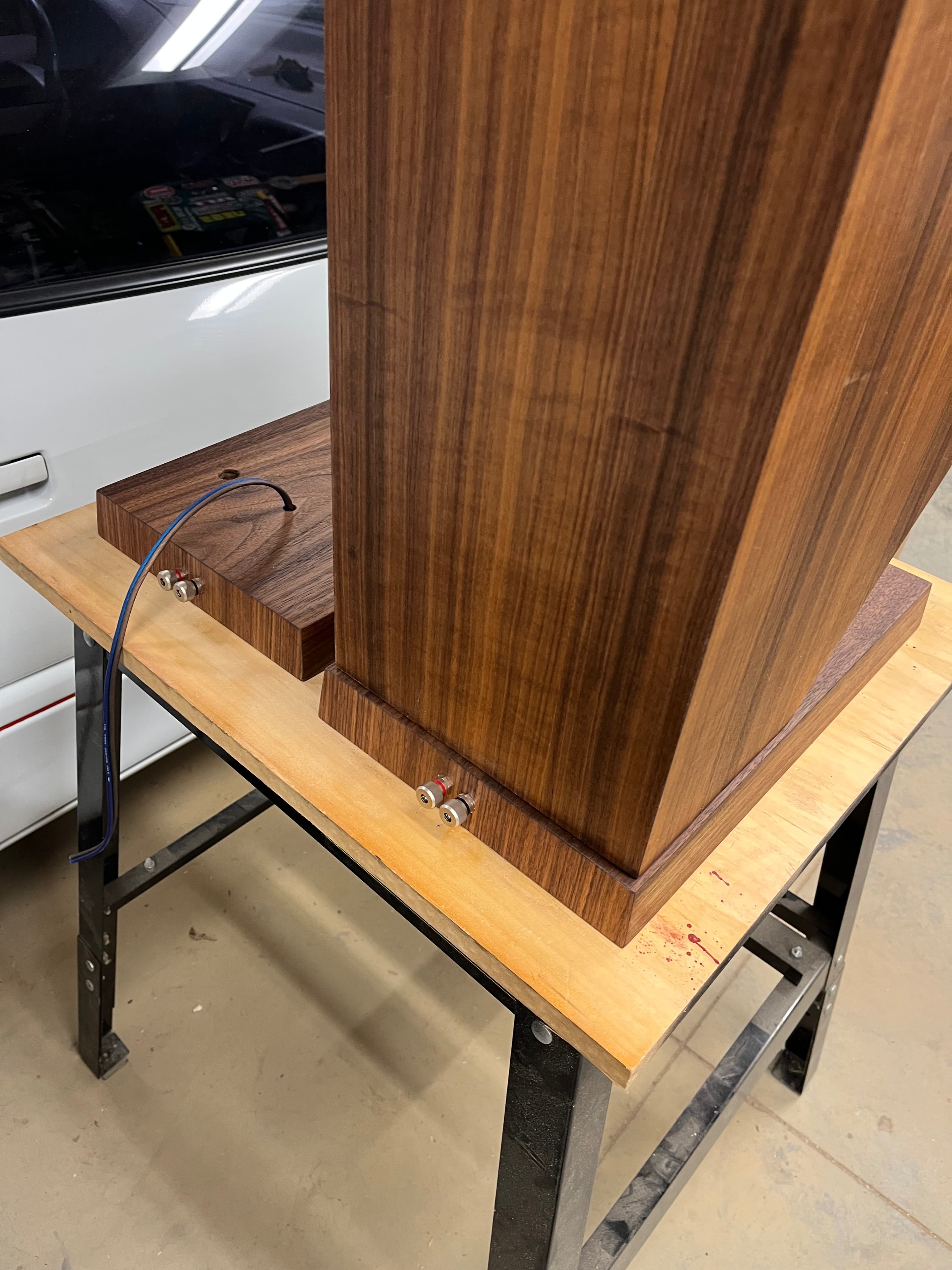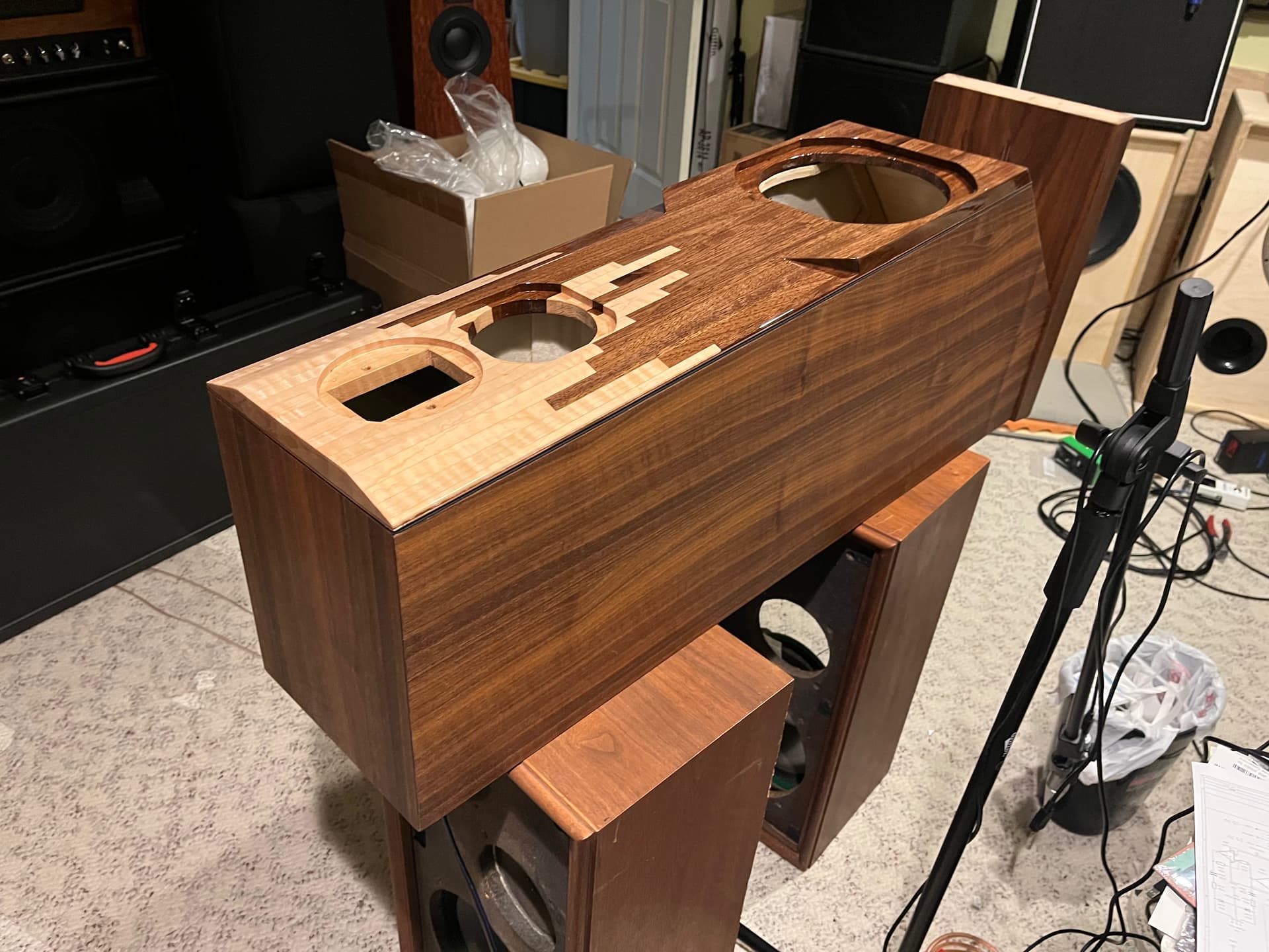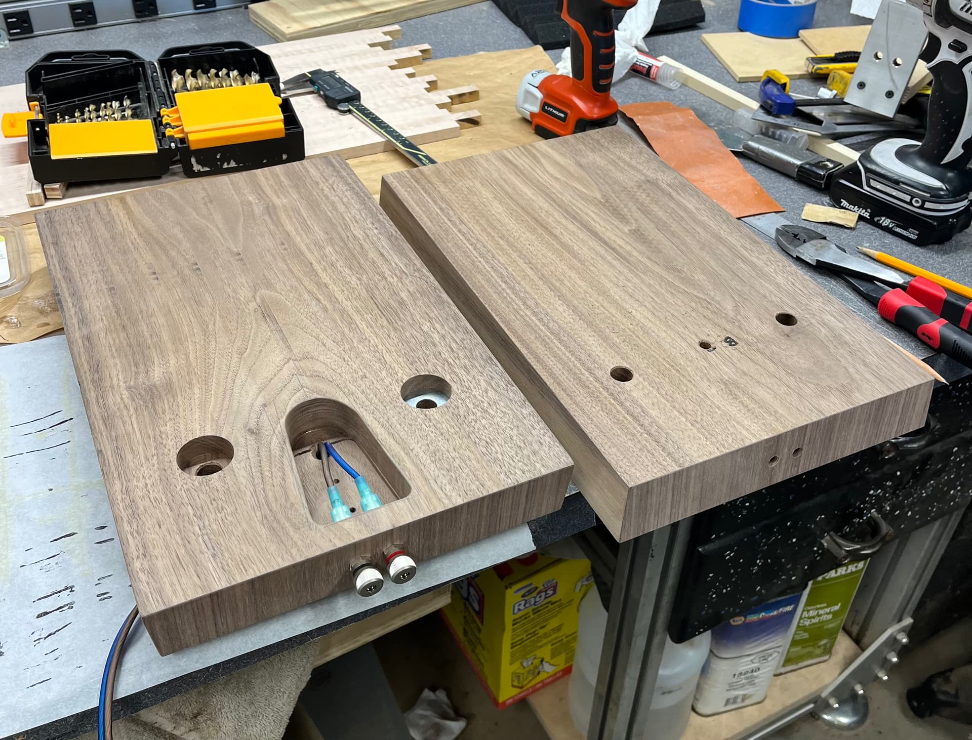 Got the finish on the bases. Input terminals and wire done. Inlays …inlayed. Mid enclosure packed and wired. Layers back to front… Rockwool, poly batting, denim, poly batting, denim, foam then felt around the outside.