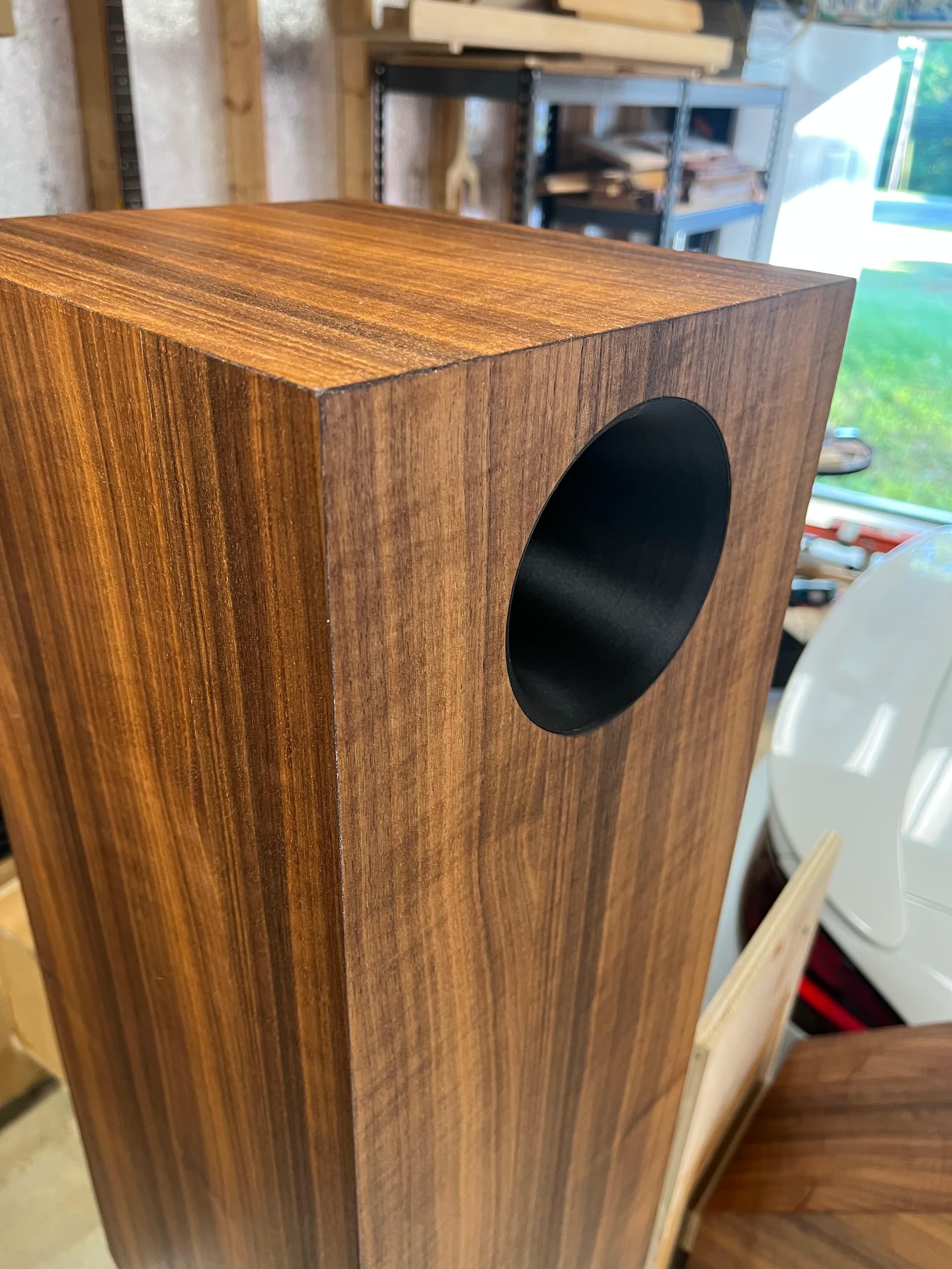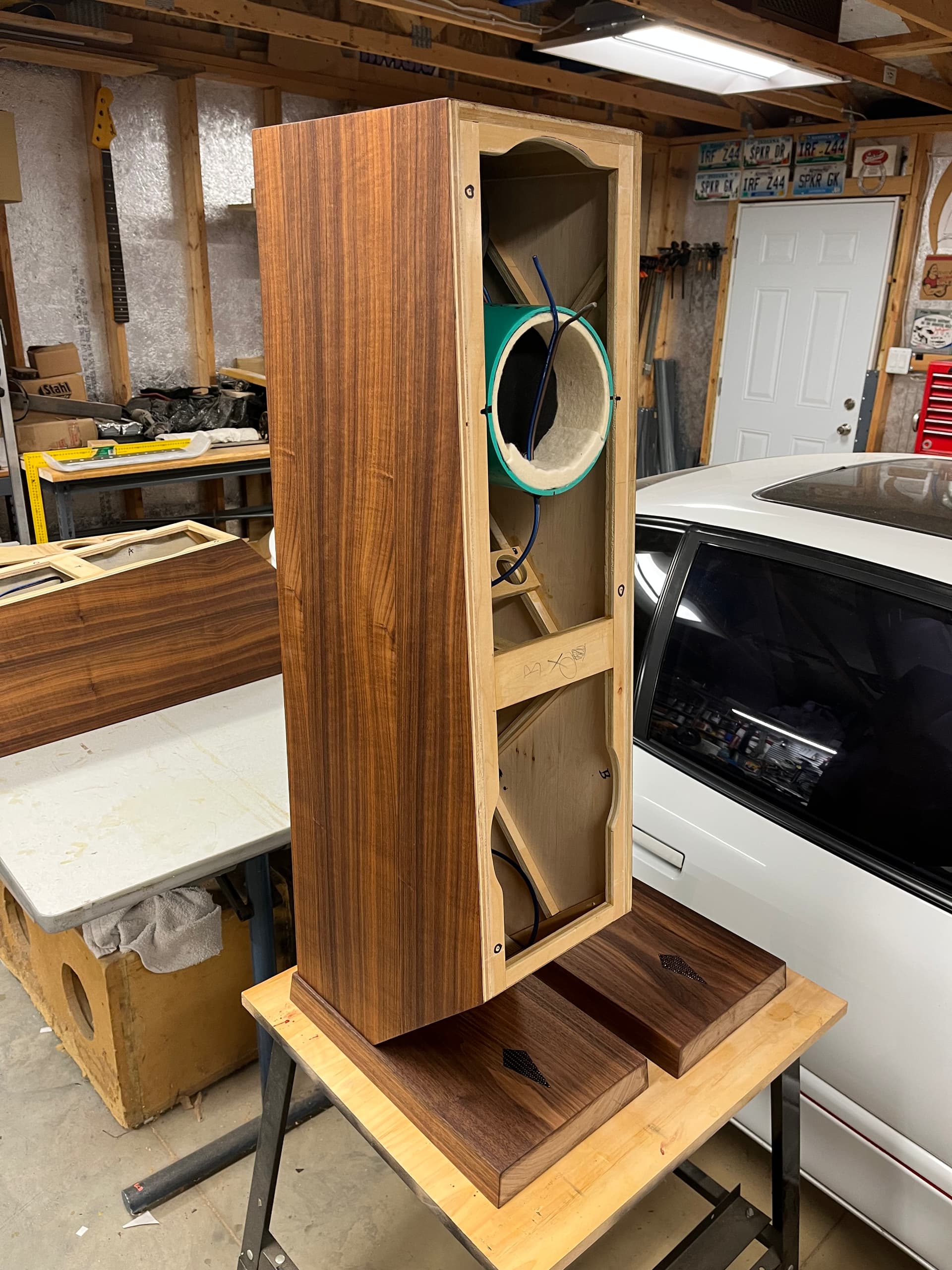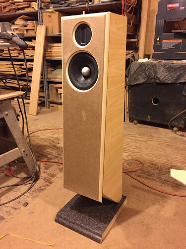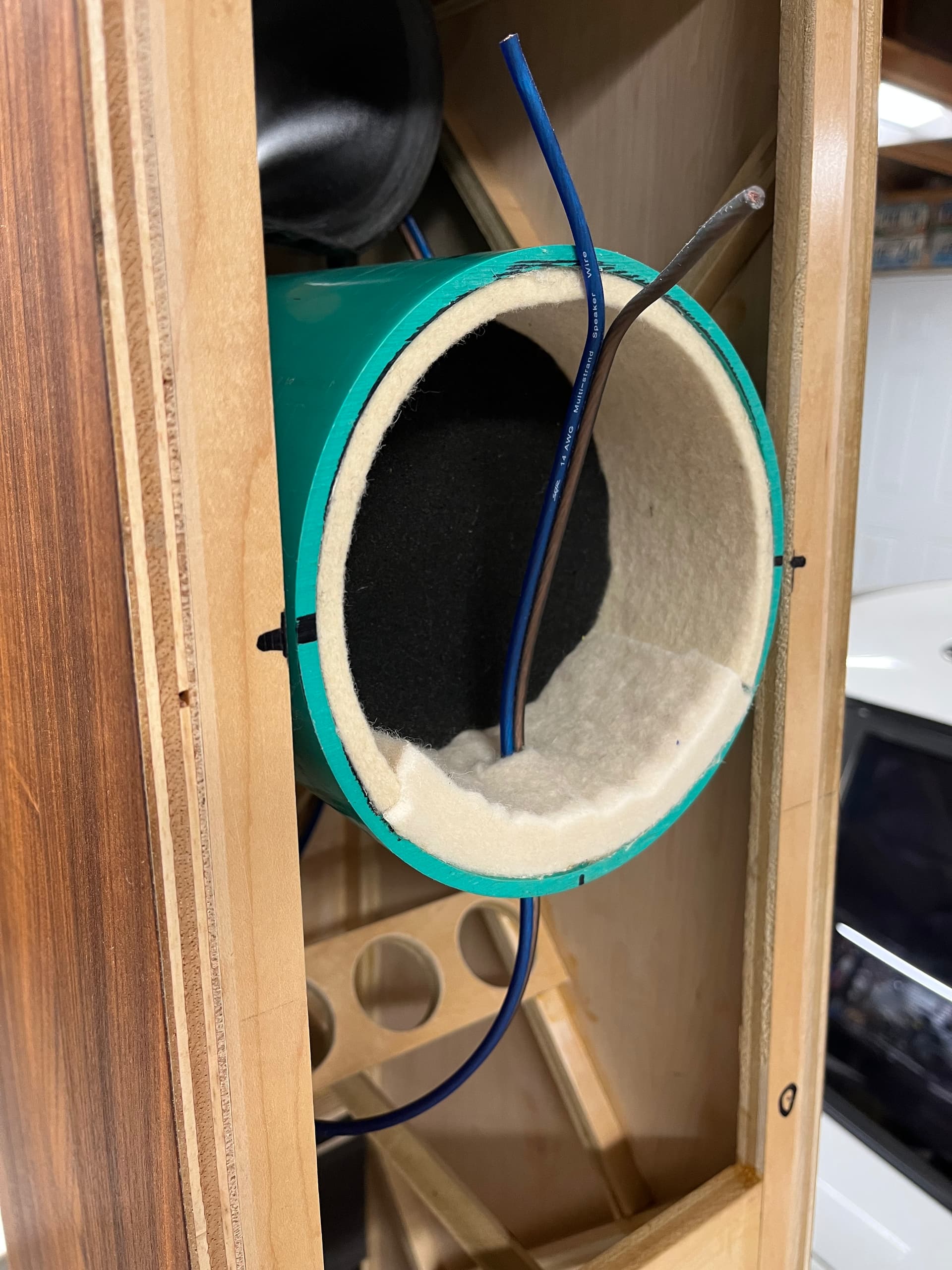 Got the finish on the bases. Input terminals and wire done. Inlays …inlayed. Mid enclosure packed and wired. Layers back to front… Rockwool, poly batting, denim, poly batting, denim, foam then felt around the outside.
