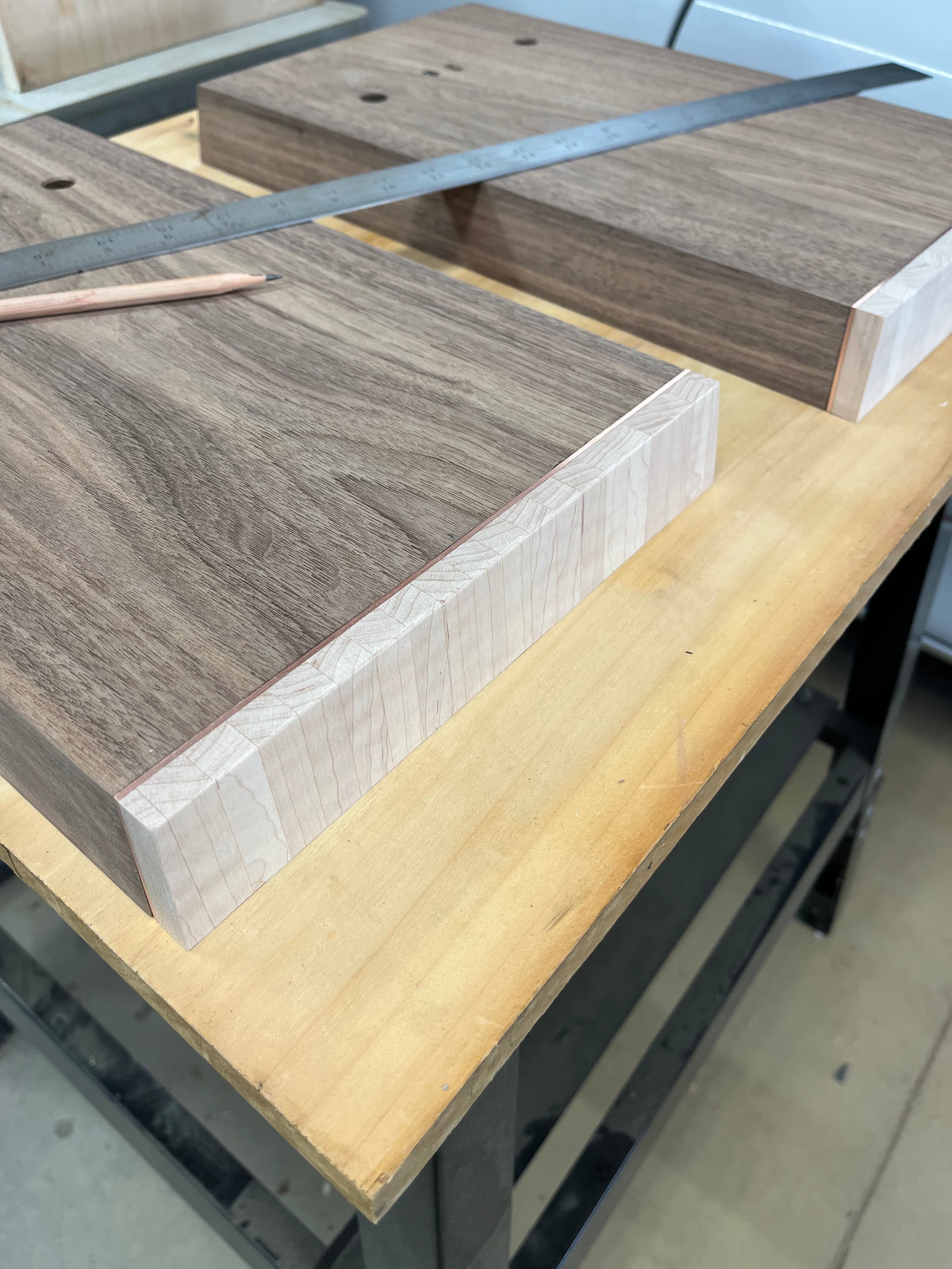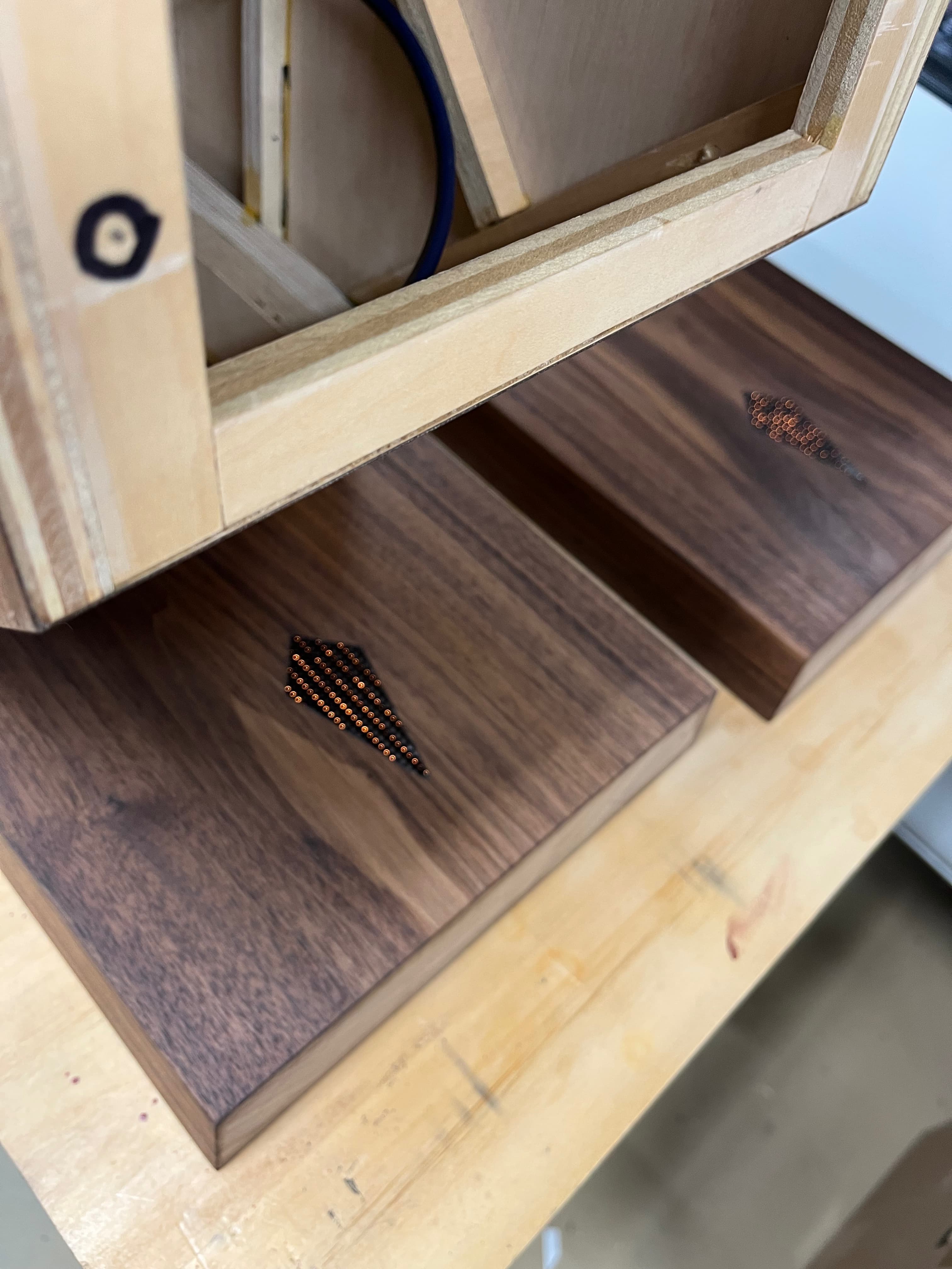 Made some trim pieces for the front of the bases. I cut strips of curly maple to match what’s going on in the baffle. Then epoxied copper to that to mimic the baffle as well.
