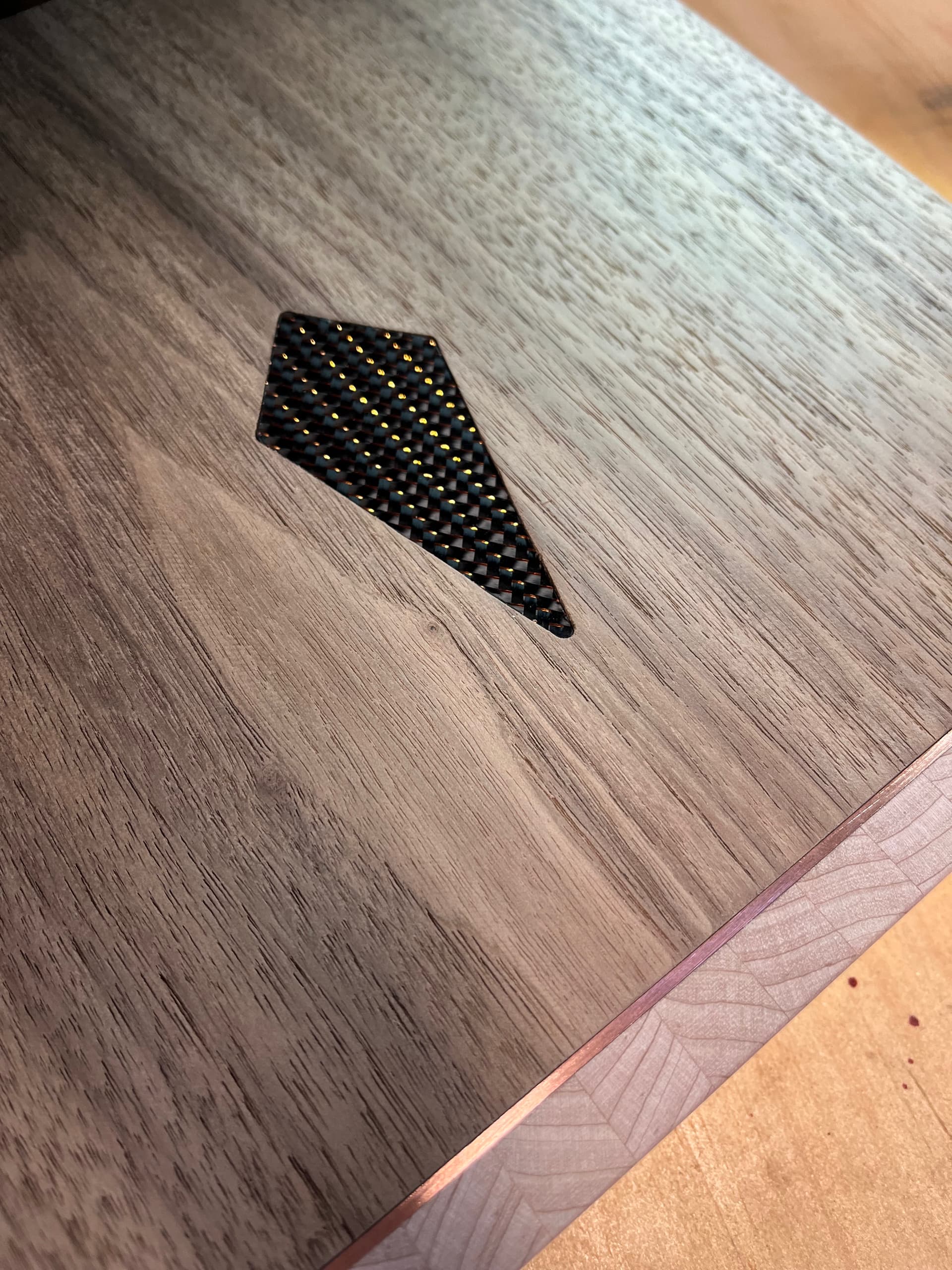 Then I put my diamond shaped inlay in. I’ve done this in most of my builds and use a different material in each one. In this case, I used some leftover carbon fiber/copper I had from the baffles of the Invit8tions.