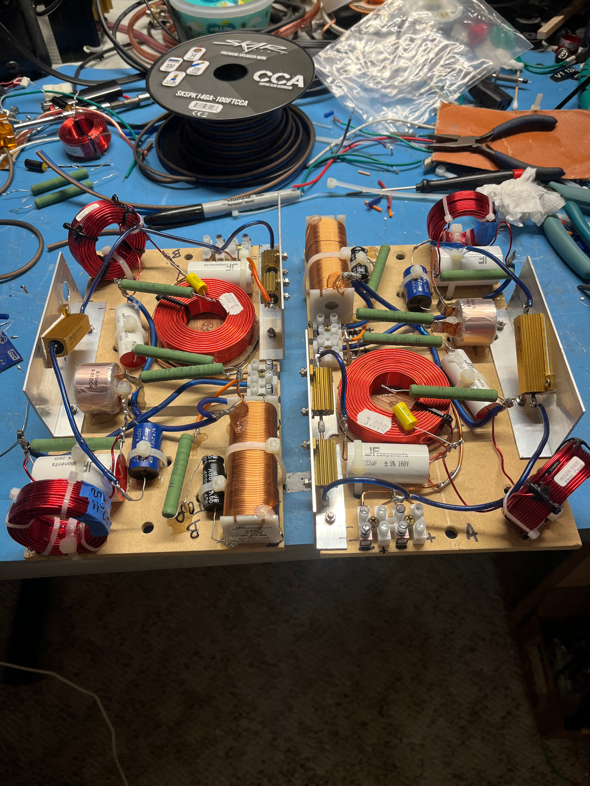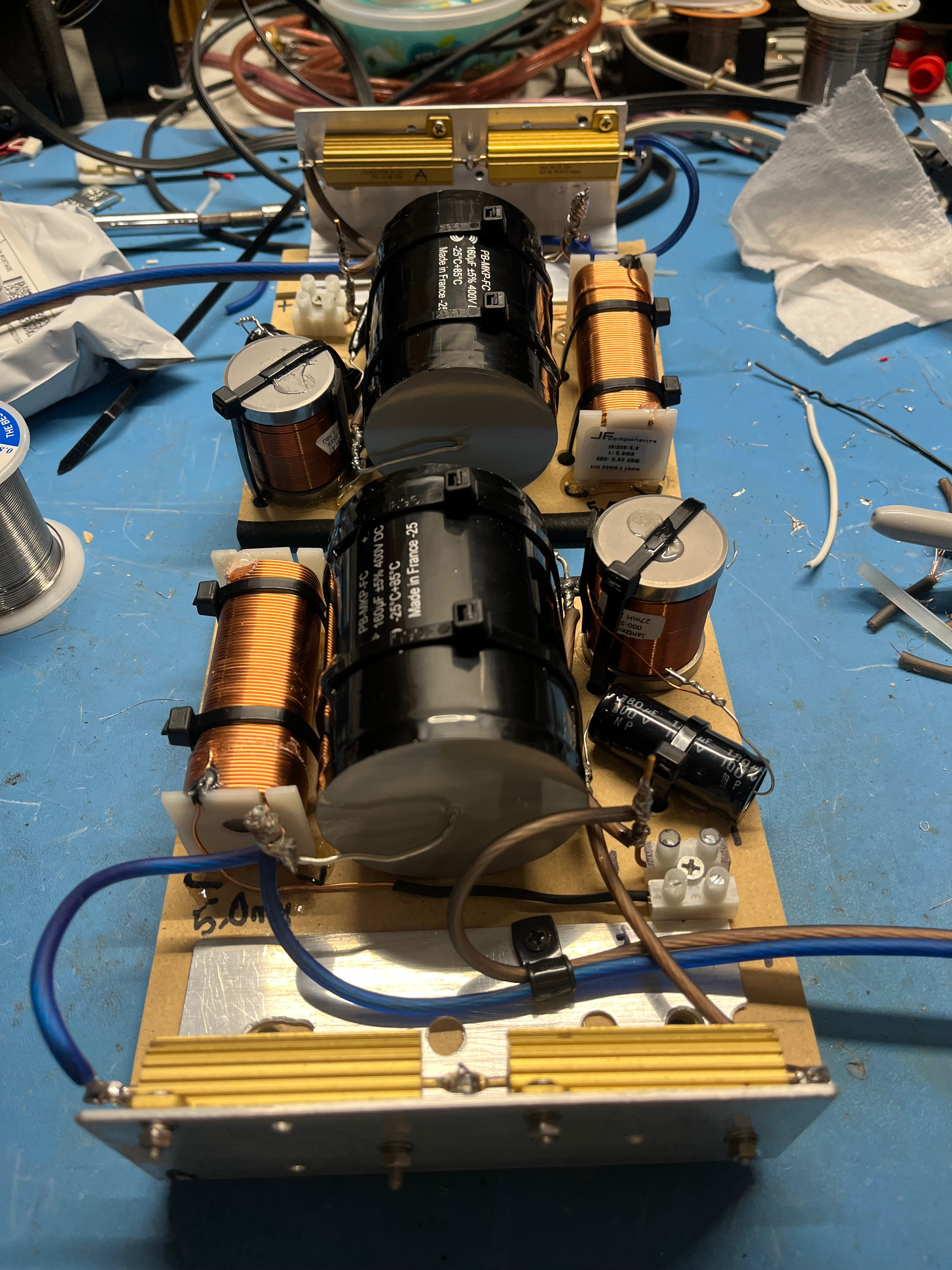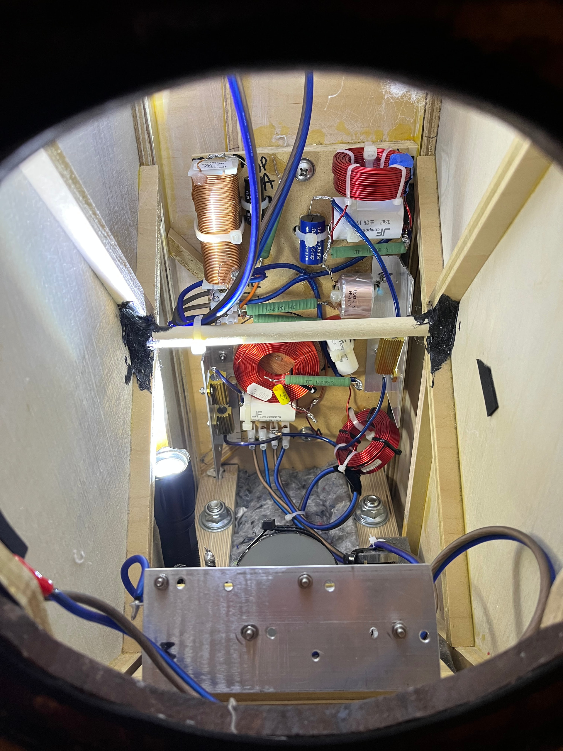 Originally I had a 6dB HP on the mid, that required notching the Fs. I later switch to 12dB and raised the xover point. Probably could have ditched it, but it kept everything smooth down there. Tank on the LP coil for some minor break up control.