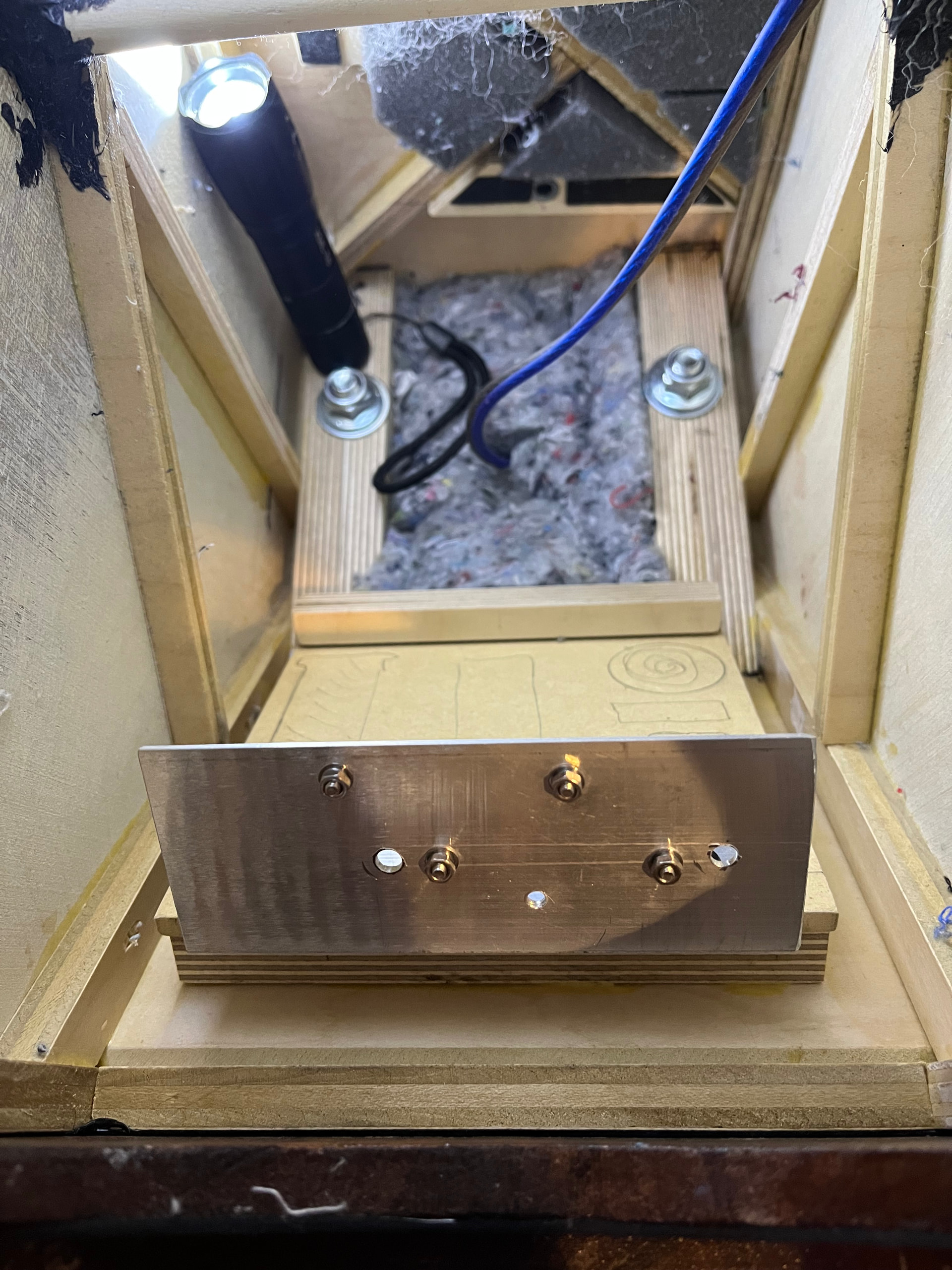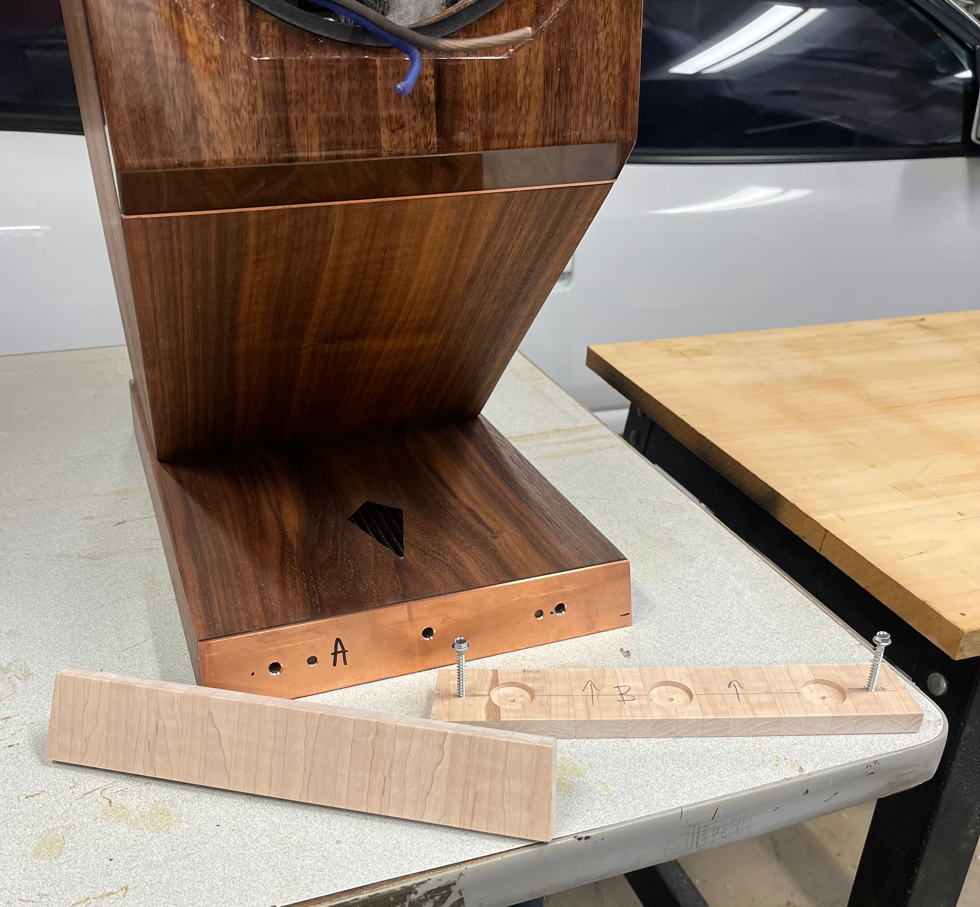 Working on the front base trim. First iteration no worky. Gluing copper to wood is NOT a good idea… thermal expansion. So copper piece separately glued on with the urethane sealant. The maple piece will be off for clear, then also glued on with said sealant.