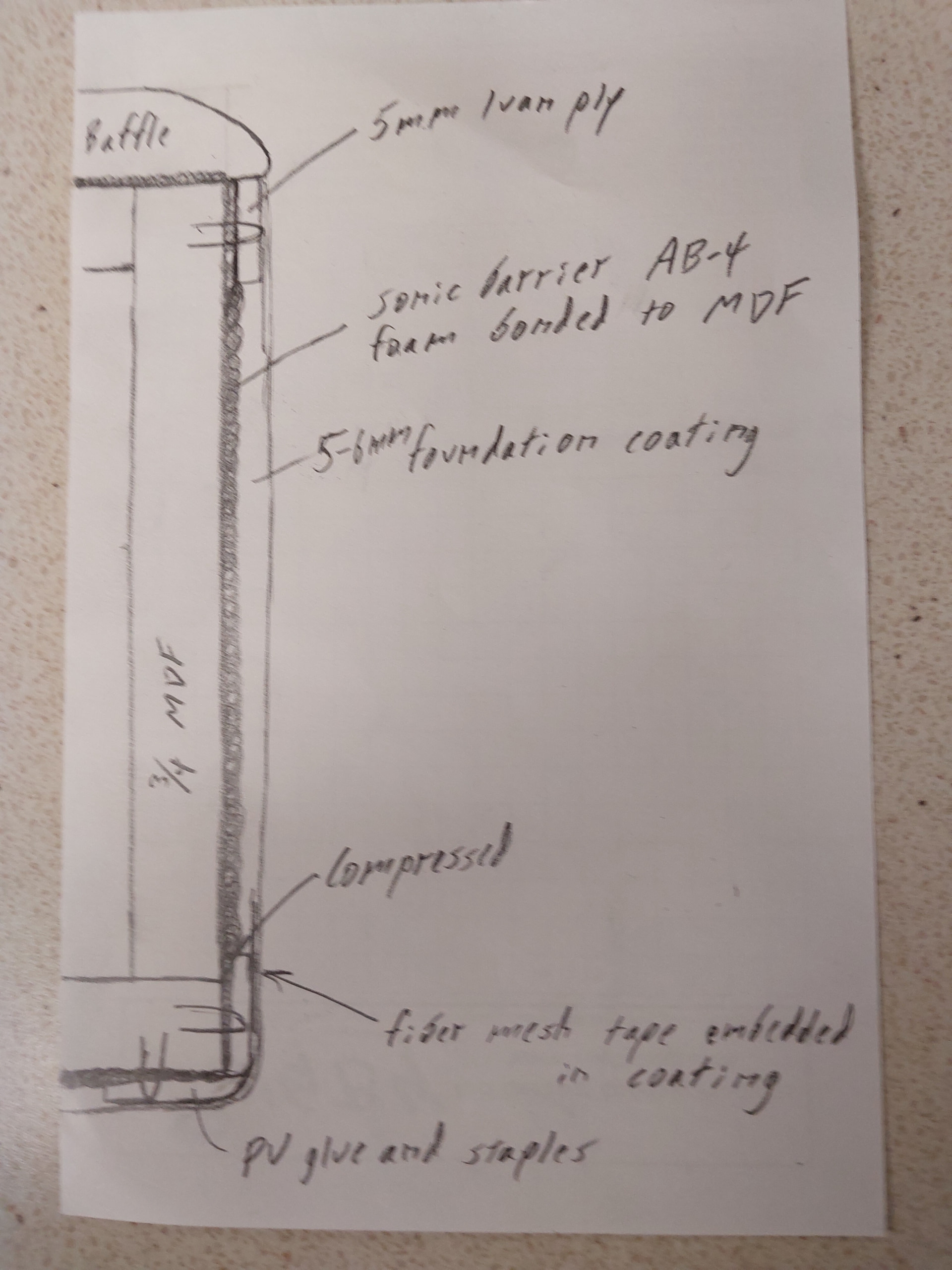 Second, I’m recommending 1/4" recycled tire rubber sheeting between layers. Also I would use a mdf, rubber, baltic birch layering to further control sound/vibration transfer.