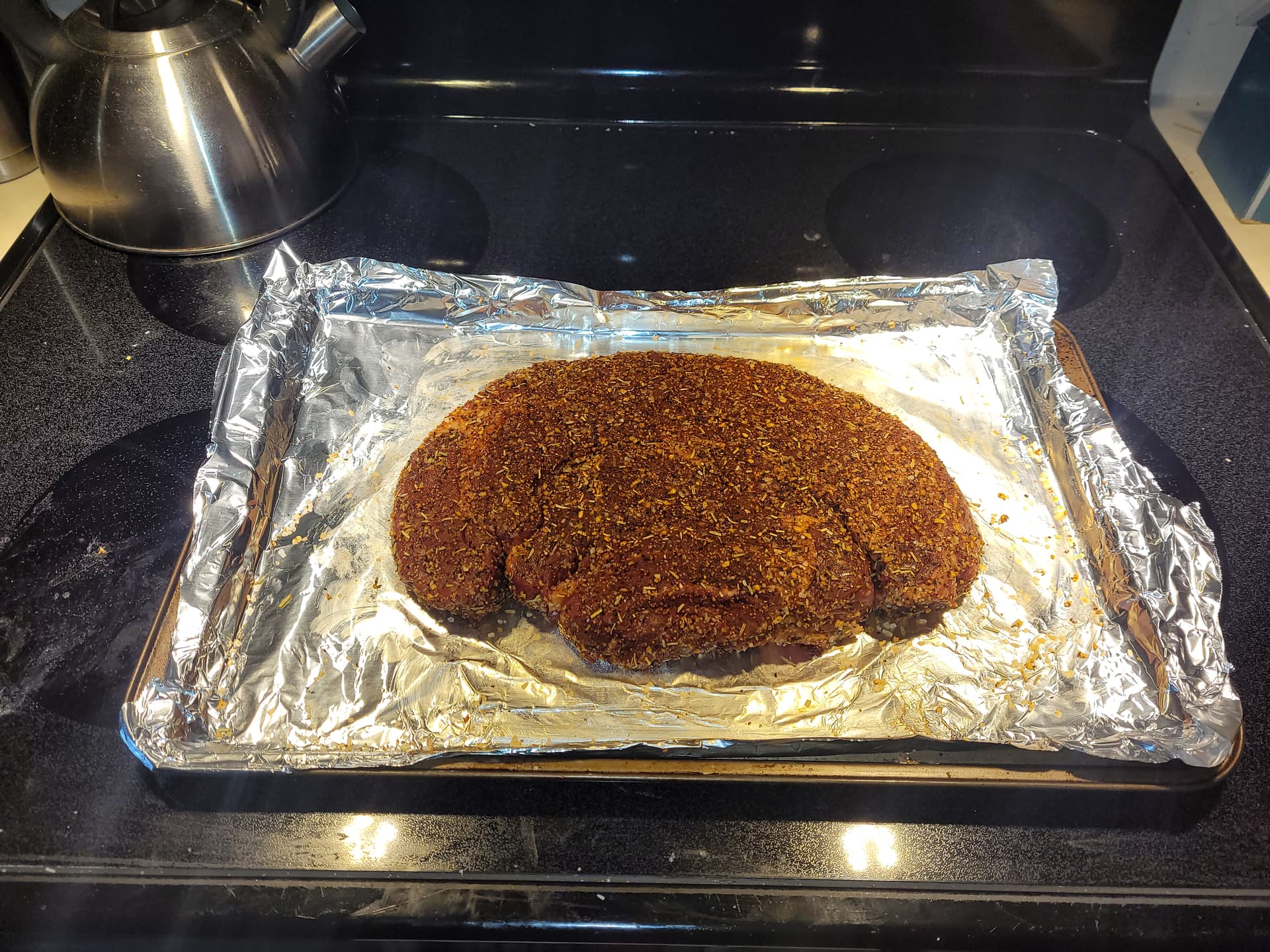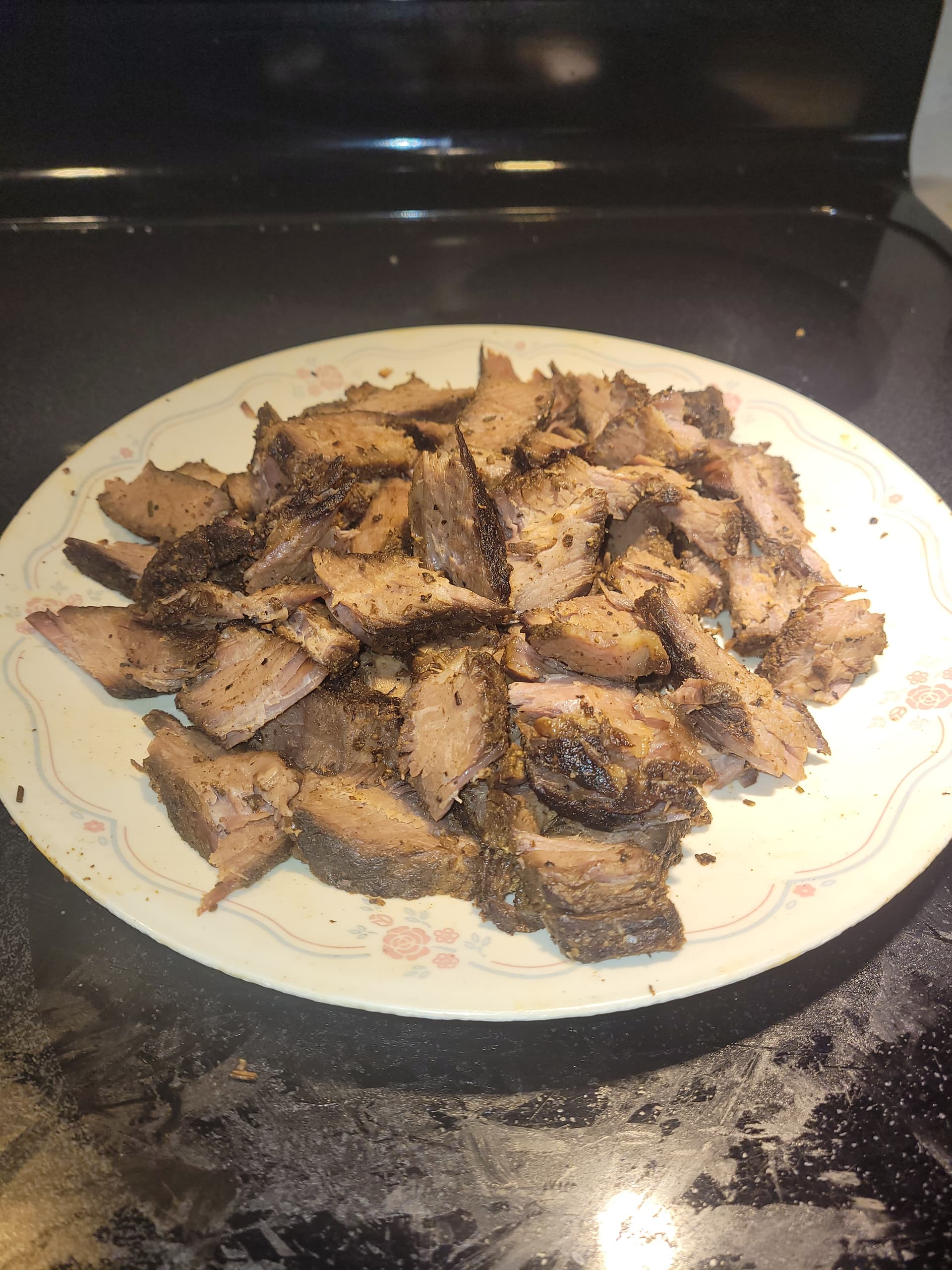 My Son and I are smoking our (my) first beef product in my electric smoker. Poor manās brisket, a 3 pound chuck roast. The oak, pecan, and hickory chips are just starting to make smoke. Should be in the smoker in a few minutes. All dry rubbed up: