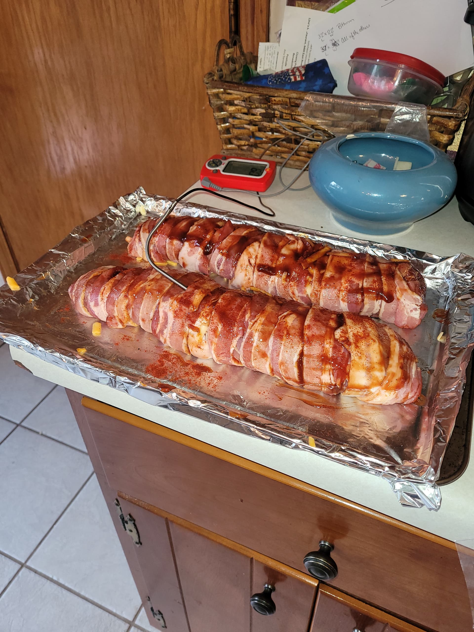 Cold and snow flurries here today, so I decided to fire up the smoker. Nothing fancy⦠just smothered two pork tenderloins with Sweet Baby Rays, spinkled with cheddar cheese, then wrapped with bacon and a little more BBQ on top.