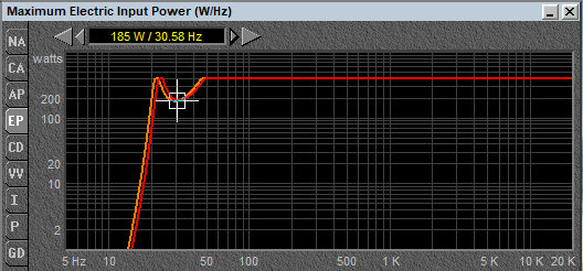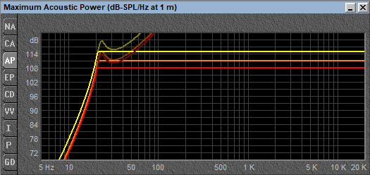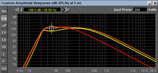 The red line is the GRS 12SW-4HE, the orange is the RSS HF sub that shows a very slight advantage. The yellow trace is the MX12-22 which appears to like a smaller box and / or a little higher tuning. I also modeled the Ultimax II, which looked very similar so I didn’t end up saving it.