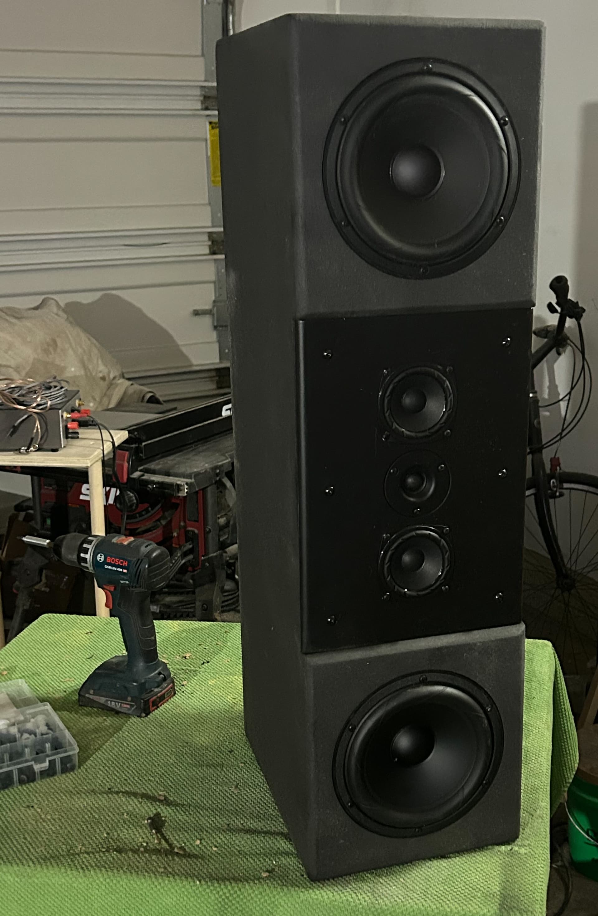 EDIT - adding image of one assembled. Dark gray primer, figure out color later. Speak-on on back of cab for the mids paralleled and tweet, then wires hanging out ports on back for woofers. Likely install binding post and wire up woofers in so can tinker with port tuning easier later. Yeah doubt see any measurement diff, think it will be more if visually nags me.