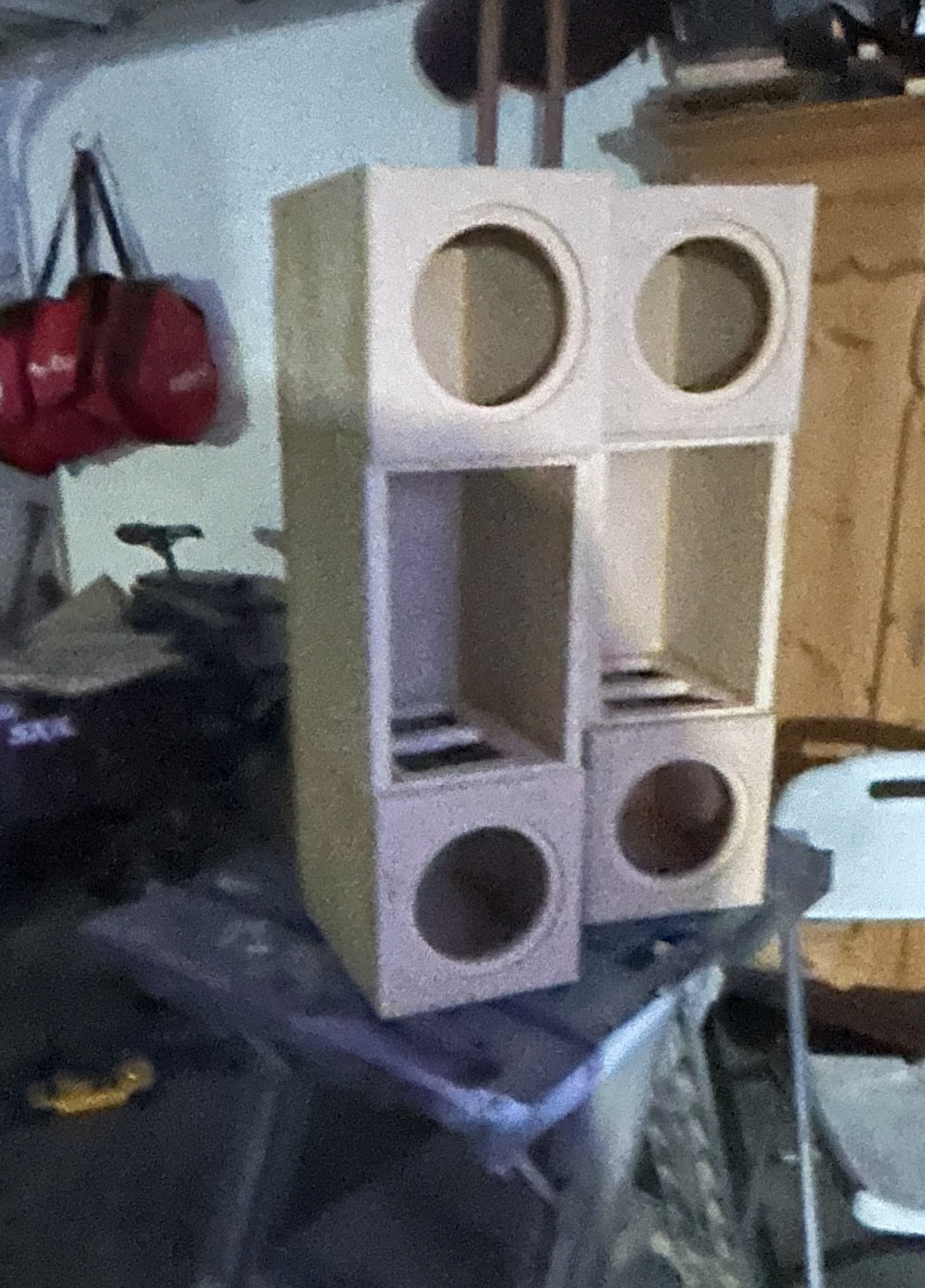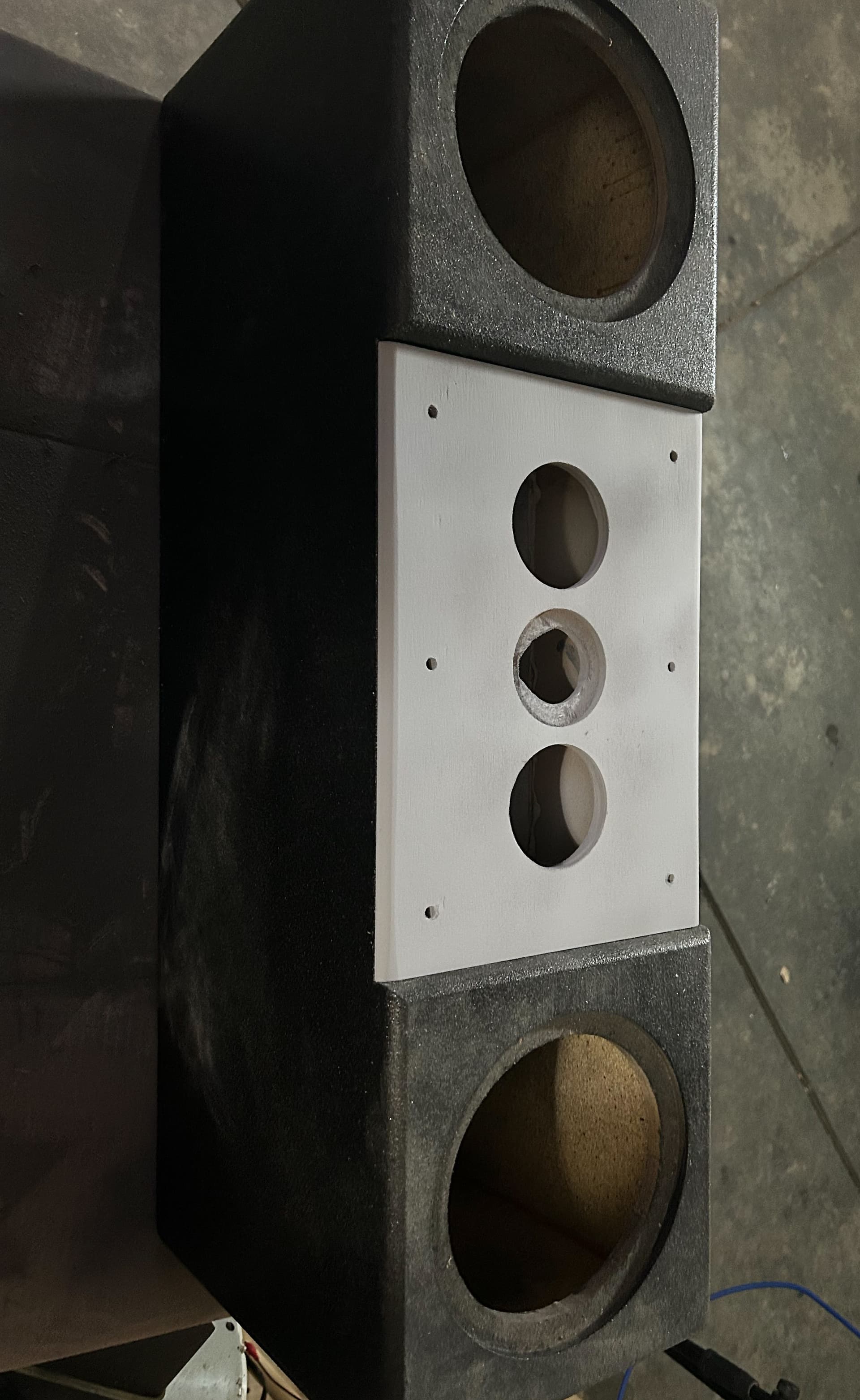 Blurry ass photo from dark sans flash. Now to glue on ‘holders’, using 3/4 strips of plywood to glue n clamp to left right middle baffle opening. Made self a pilot hole template to hopefully repeat mount holes - any recommendations as know number of yall (like versabox and others) for re-usable cabinets?