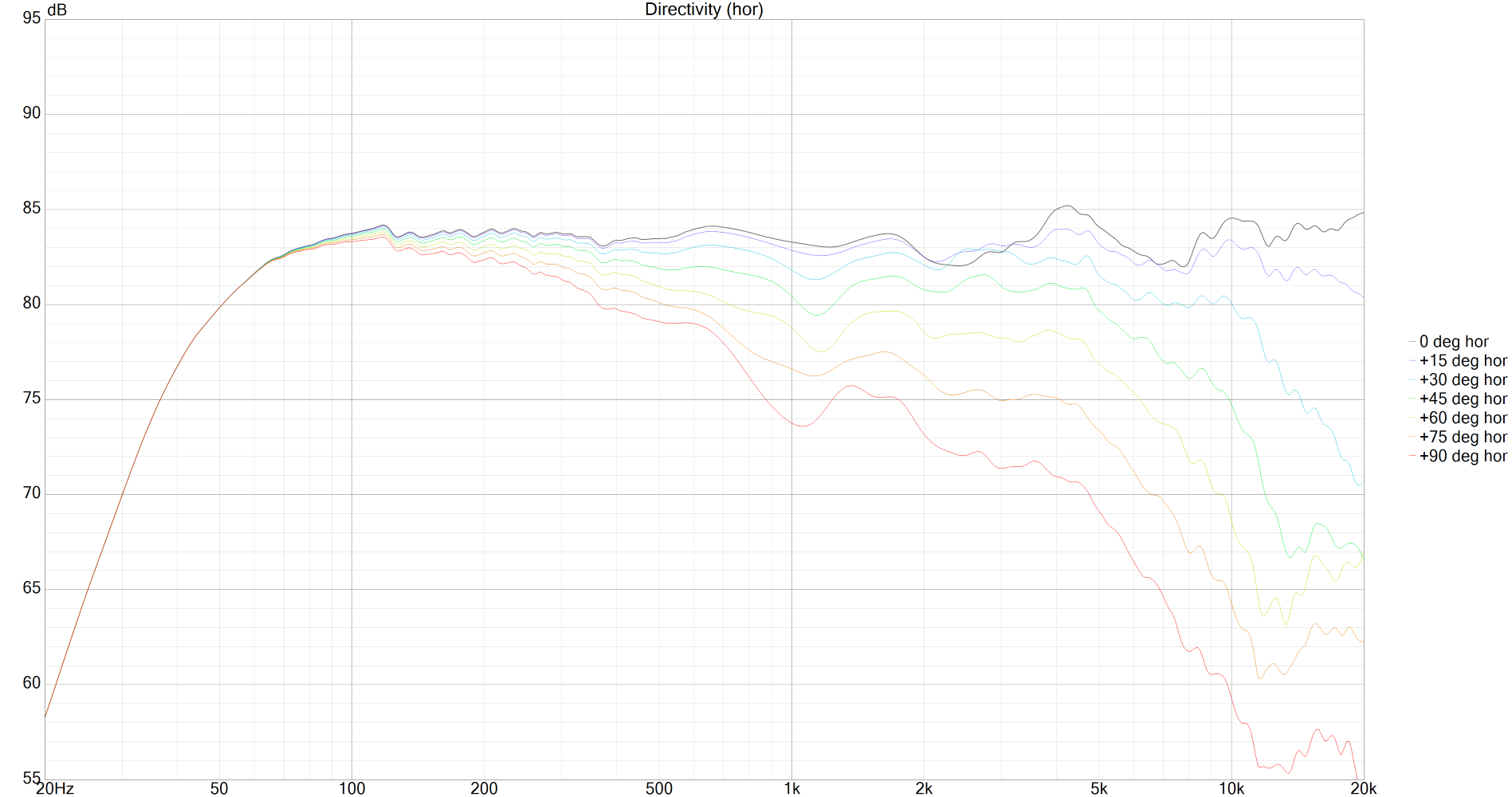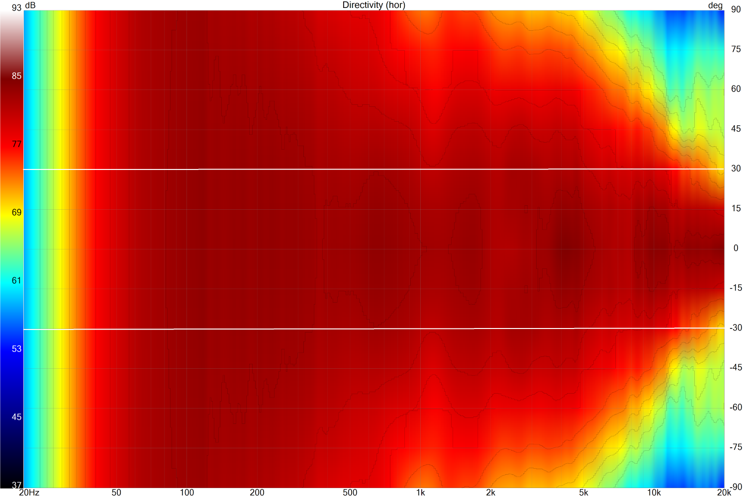 The reason I ask…I have a hard time drawing very concrete conclusions from the LINE graphs, other than I can see obvious areas of concern. I can see any obvious errors in the on-axis curve, but clearly, if I am looking at off-axis angles 0-90, I care about the directivity in general, sound power, etc. I find the POLAR graphs much more useful. In the example below (just one of my speakers I quickly loaded into VCad) I have the line graph and I know I have some elevation at 4kHz. But in the polar graph, I have set my contour lines at 2dB (I could have set at 1dB or 3dB if I thought it was more helpful). (The white horizontal lines are just edited in with MS Paint.) I can see that if I care about 2dB deviations within a fairly narrow window of +/-30 degrees, I probably want to bring down not only the area at 4kHz but also 1.5kHz and 10kHz. However, I can change my contour lines to 3dB and look at +/-15 degrees, as in the third graph, and maybe I don’t actually care to change anything. (Sorry, the contour lines are pretty hard to see and I can’t make them thicker.) Of course, at some point, it comes down to actual listening with your ears, but in my case I probably trust measurements a little more than my ears.