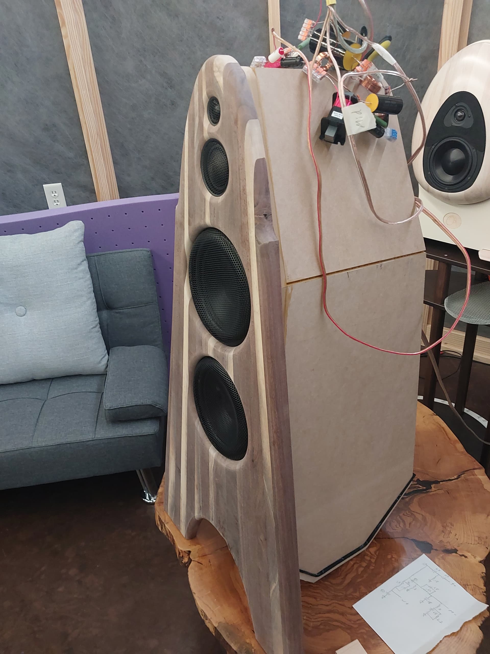 Progress today. Some things need to be changed. They have much higher sensitivity but they sound shouty compared to my Morel two way. The rear mounted nature of the design caused some reinforcement in places that seem impossible to remedy. I intend to make a low profile measurement stand for large speakers that I can stuff away under a futon, and retake some better polars. I measured the woofers together