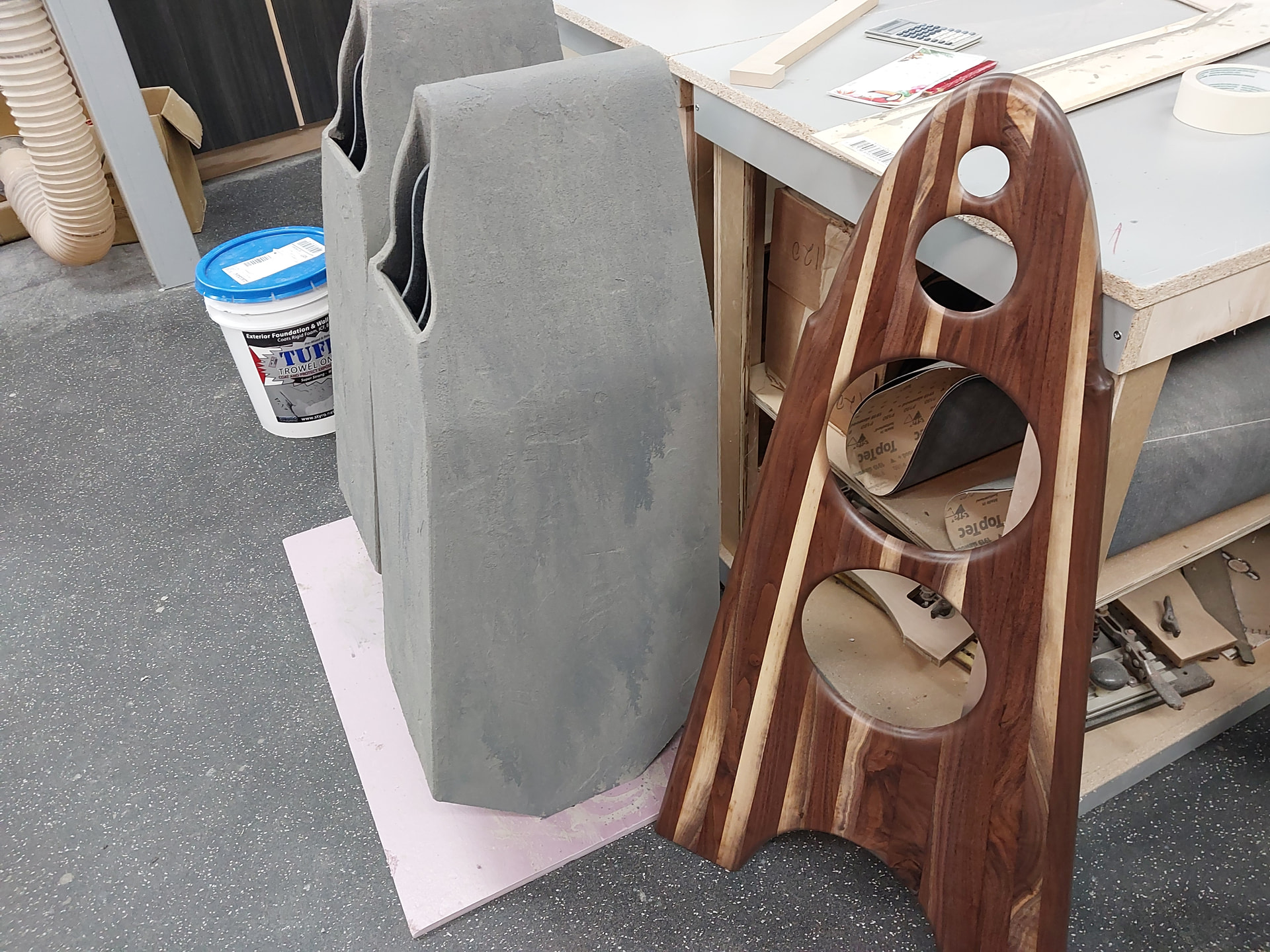 Second and final coat of stucco foundation coating. Some of the sprayed on grey will be either covered by a darker grey or sanded away. I am going for a distressed masonry look. The baffles are close to done. I think low sheen on the baffles 15-20 % gloss