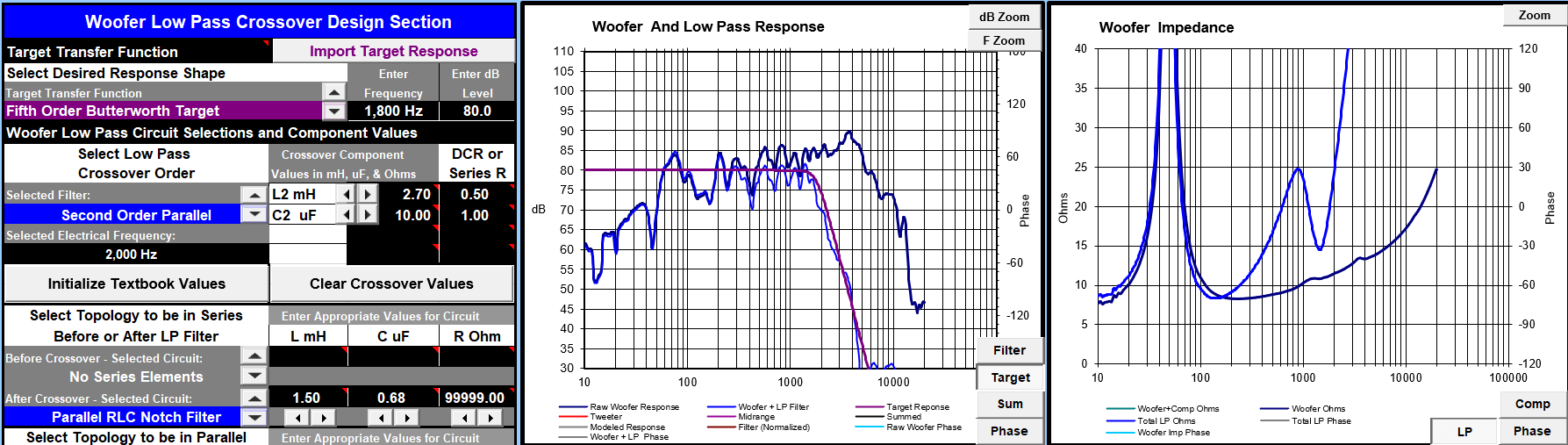Here is the simulation below. I was able to keep the sensitivity at 81-83dB, but that is about the most you can expect from a long-throw 7” 2way made for power and low bass extension in a small box. If it were 4 ohm impedance, that would add about 3dB to the sensitivity, but it’s not. The tweeter was managed 4 with parts. The woofer was not as much a champ when it came to trying to blend well, and took twice the tweeter’s parts count. Parts total is 12 in this simulation. The 150Hz dip is floor bounce.