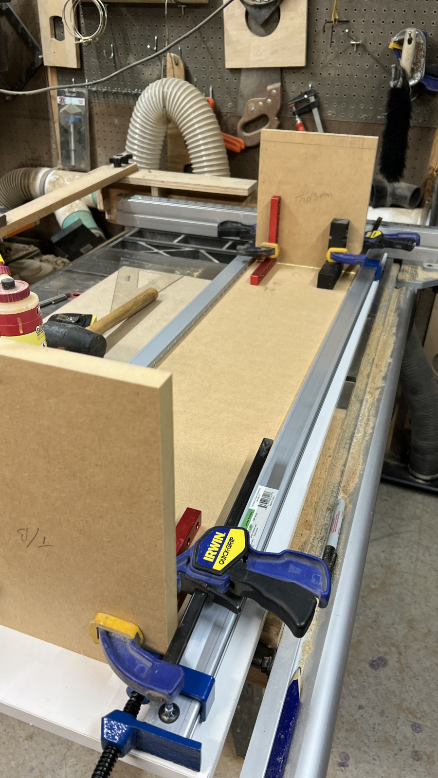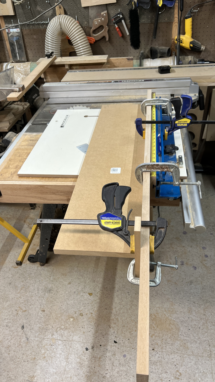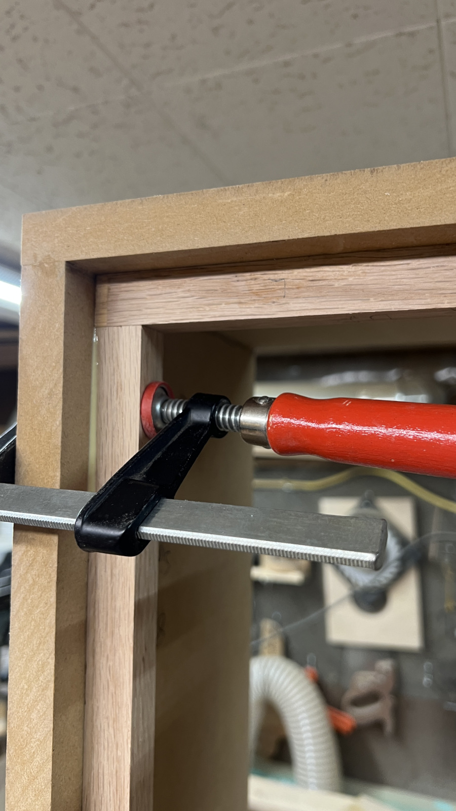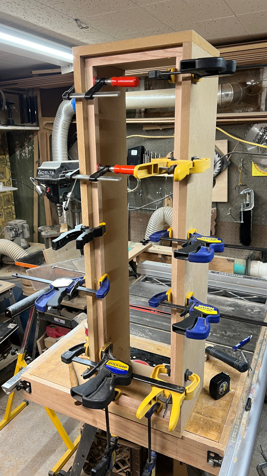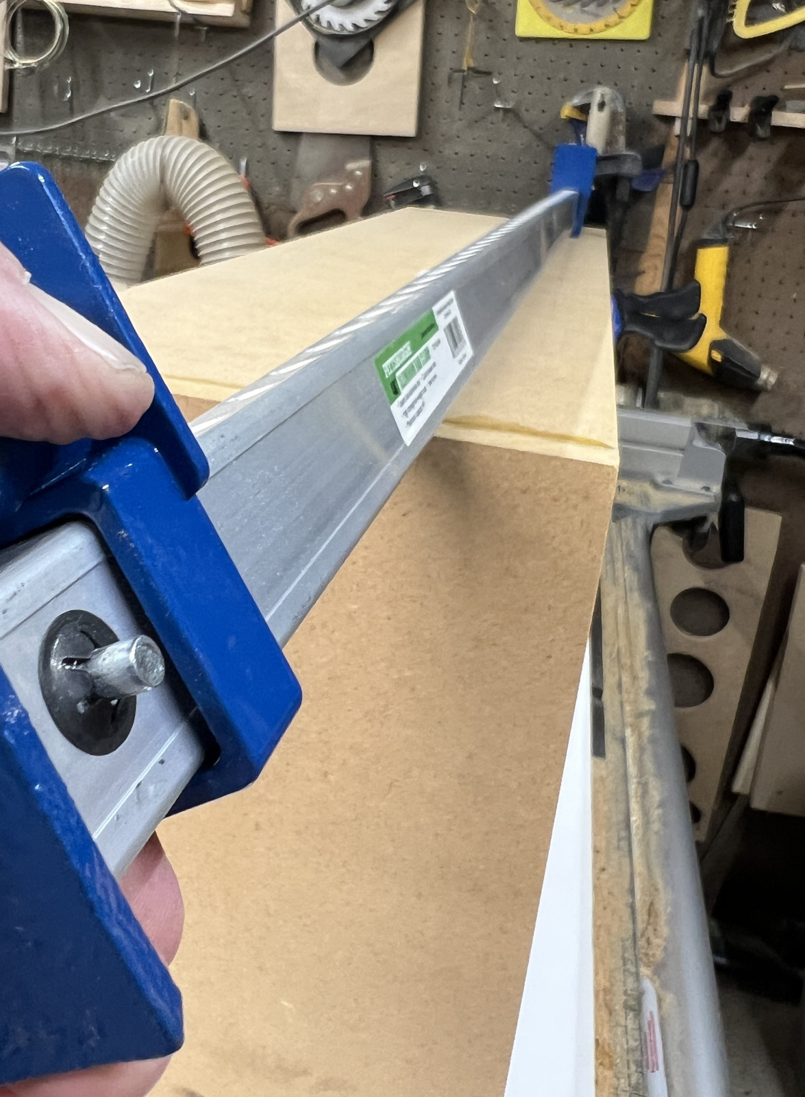 I decided to pick up some of the cheap 48” Harbor Freight bar clamps since I didn’t have any over 36”. I could have linked a few shorter ones together, but that increases my odds of something slipping while the glue dries and I know better than to press my luck. The reviews said these clamps are pretty sketchy. I agree! They flex and twist easily and I’m amazed they didn’t just break when I tightened them down. I bought 4 but may take the unopened pair back.