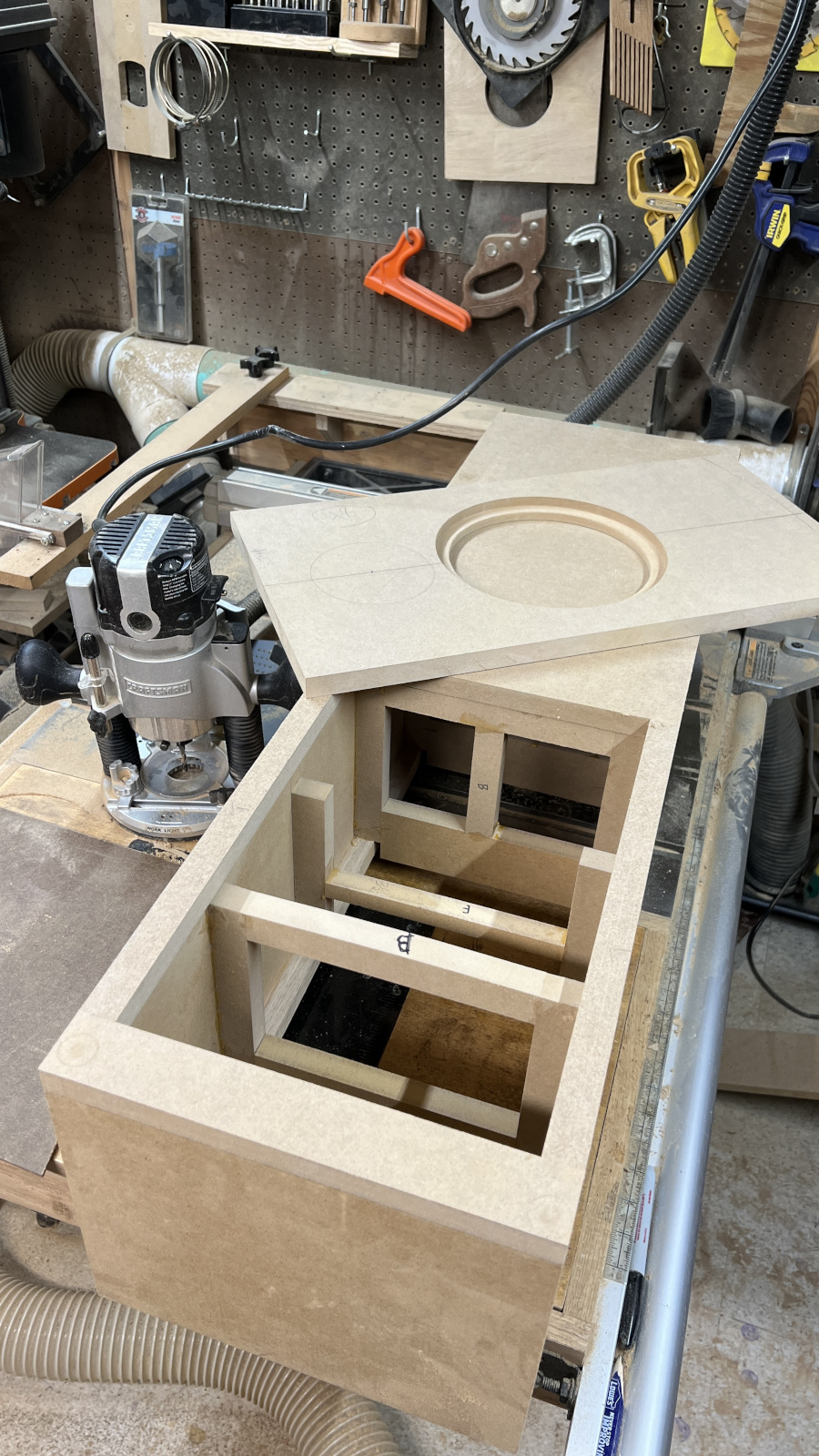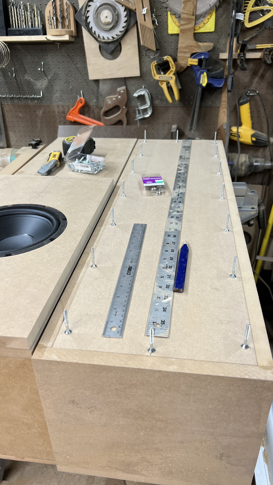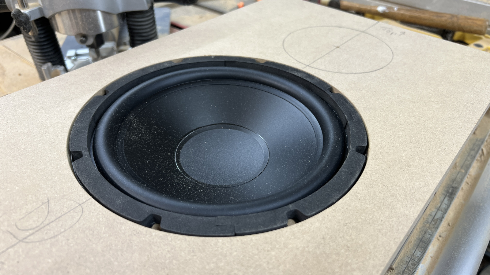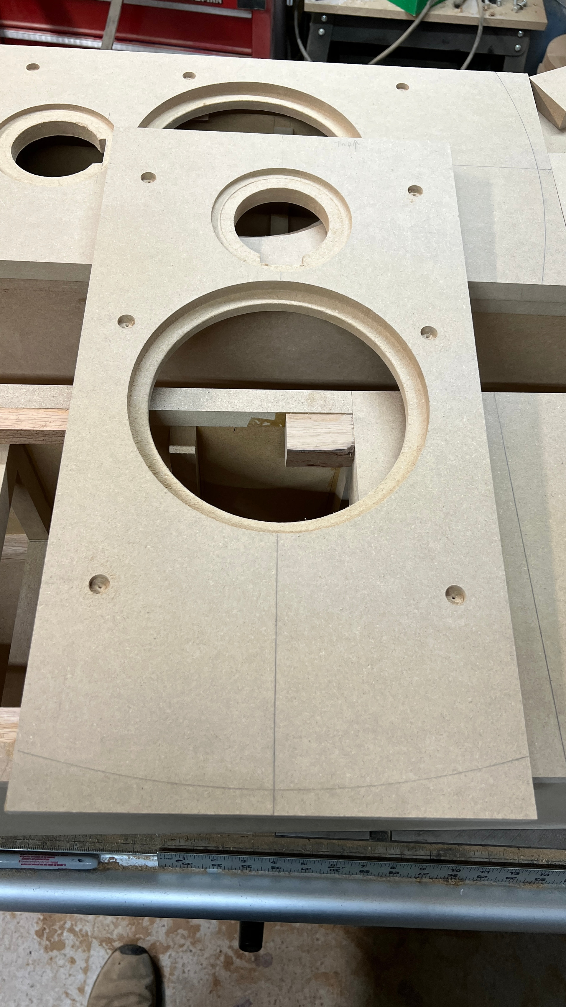 Started on the baffles today. Got them sized up, laid out the driver placement and got the woofer holes cut before dinner. I haven’t managed to screw anything up on this one yet, but I still have quite a bit of work left, so I’m not going to rush things. Measure twice - maybe even twice again!