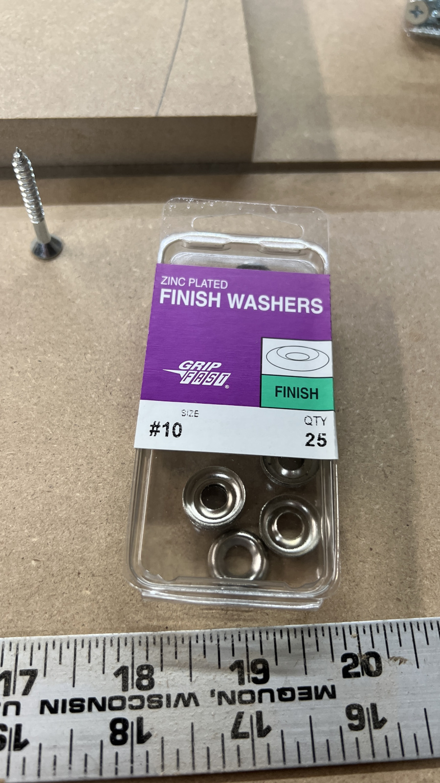 I vote for finishing washer with matching screw. Package says zinc plated on the washers but they appear to be chrome or nickel plated. I know its on the back but I bought 100 of these for a job and didnt use them. I doubt I ever will. They are #10x 1.25