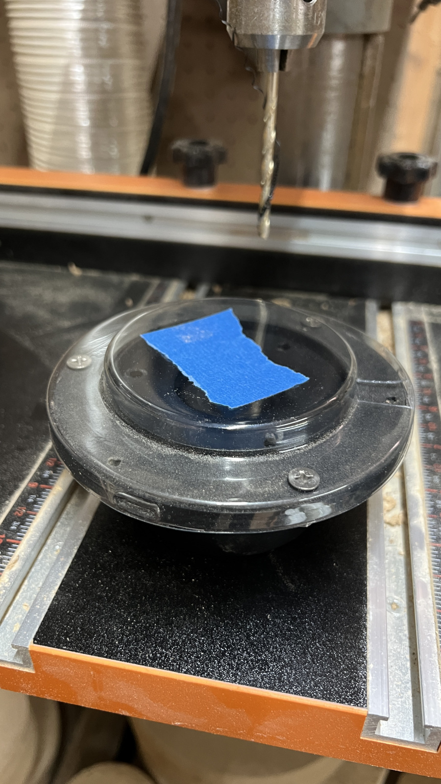 Craig had said he drilled 3 more holes in his Silkies. Sounded like a good idea so I took the faceplate from one of the duds PE had replaced and used it as a template to drill out the good pair without taking them apart. I used the plastic shield from the packaging to keep junk from getting on the domes.