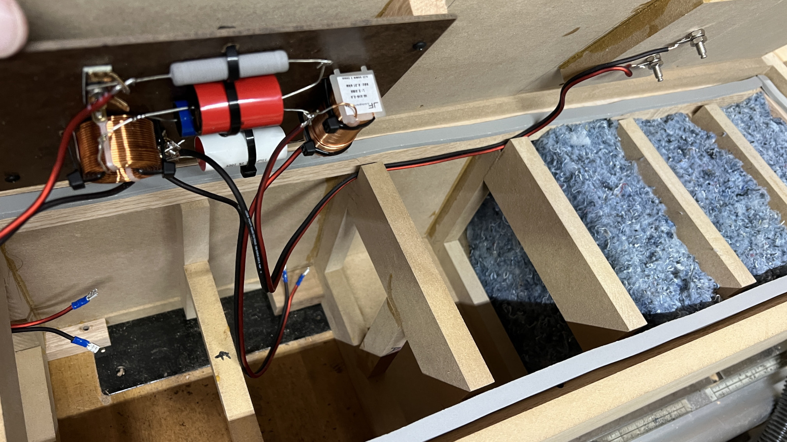 I used some of the insulation I bought from Mark in Ankeny to stuff the bottoms of the cabinets. Maybe too much?? Routing the cables from the binding posts to the crossovers along the gaps in the bracing was not something I planned - just dumb luck!