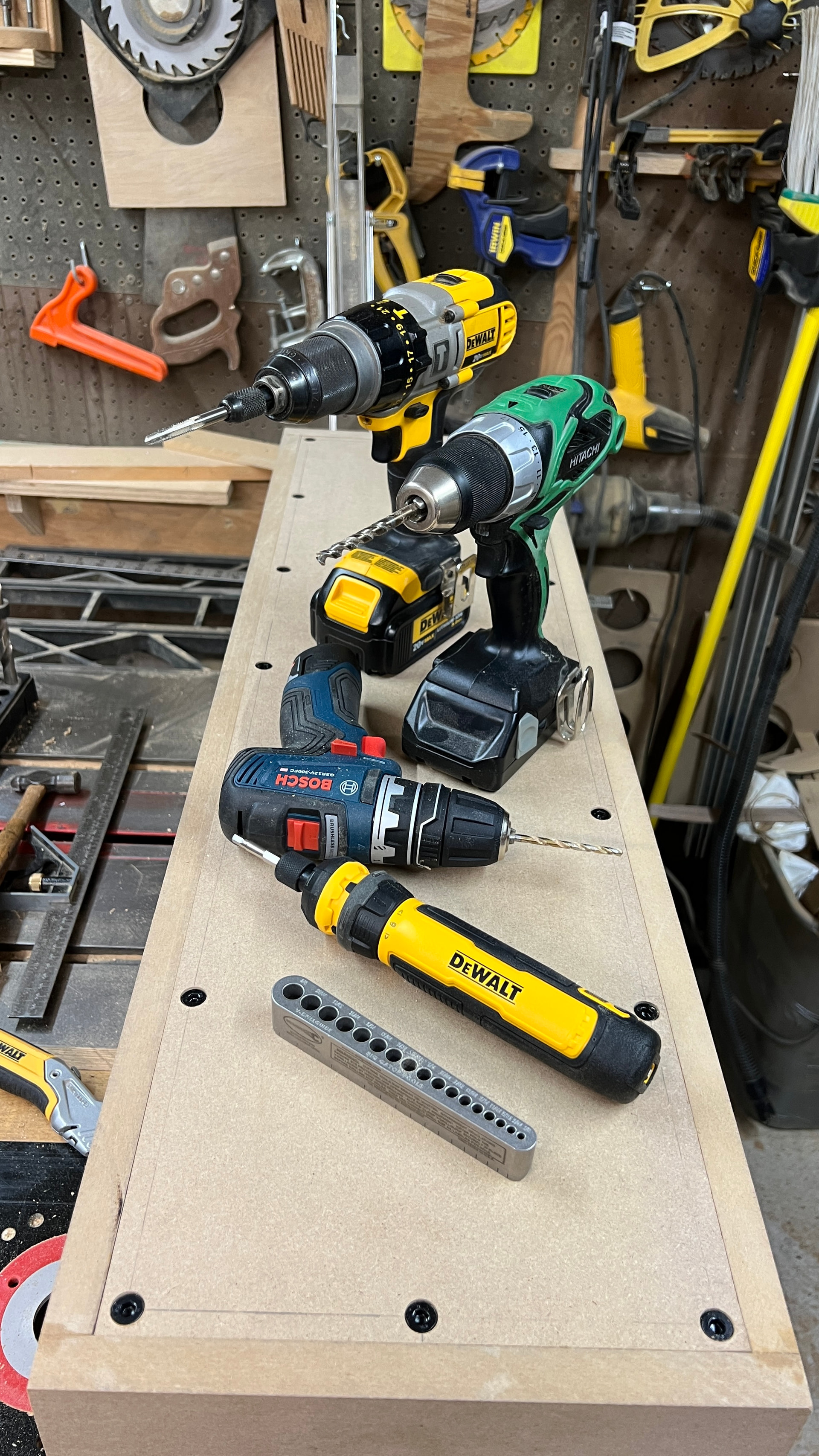 I woke up at 3am yesterday. Drilling is quiet enough and my shop is at the other end of the house, so my wife didn’t hear a thing, despite the 5-step process. Started at the drill press with a Forstner bit and then 3/16’s pilot holes in the back panels. Then with the backs in place, used a drill guide and the little Bosch to drill down through the oak runners. Tapped the holes with the 20v Dewalt on low speed, then finished by opening up the holes in the panels with the old Hitachi. The little Dewalt screwdriver has enough torque to pull the backs into place.