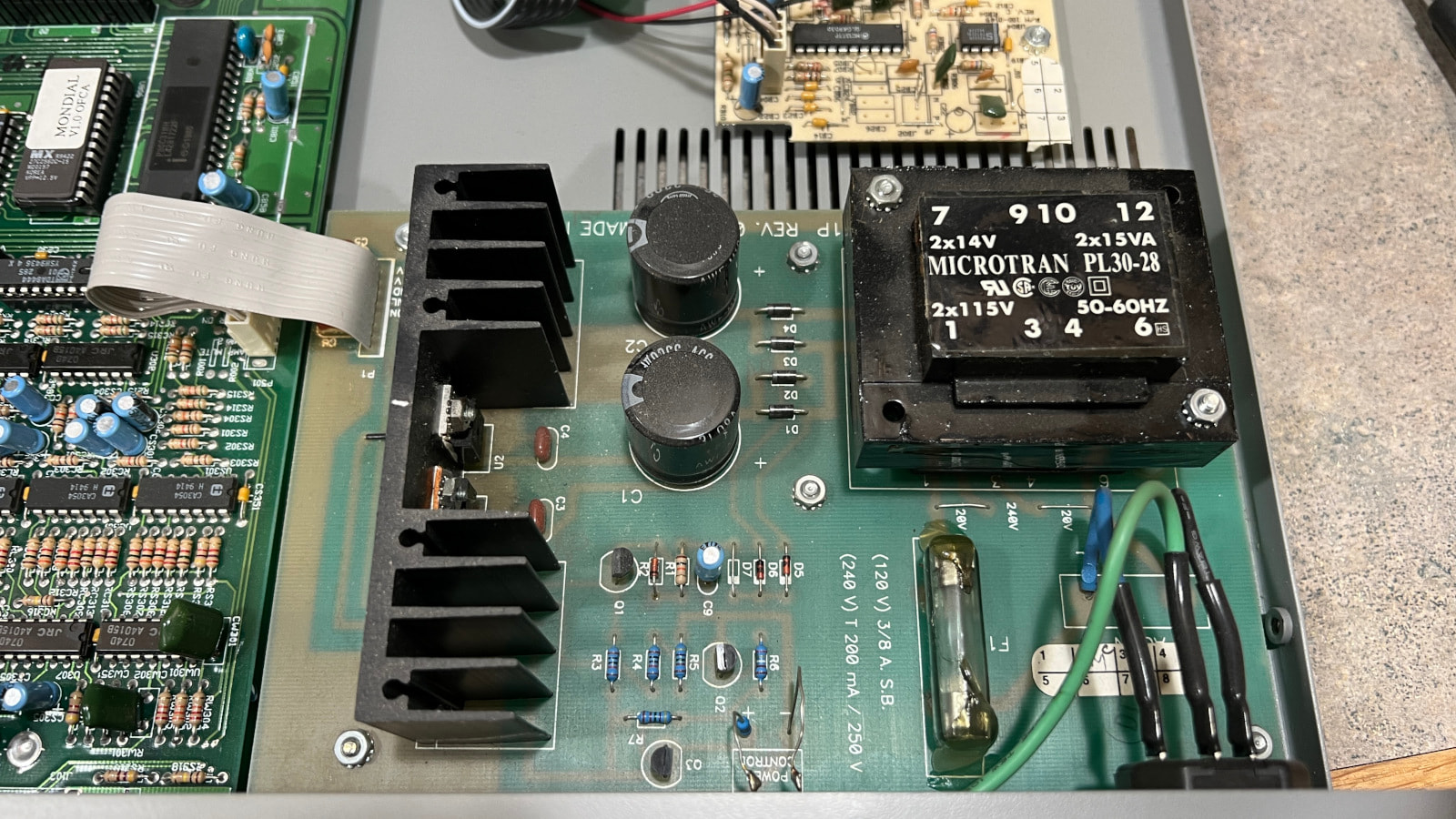 Surprise, surprise - the power transformer does work for this board! The secondaries measure 18-0-18, despite being marked as 2 x 14v. Probably not enough current draw to pull it down. 18v is a little high, but luckily the regulators are not working hard at all.