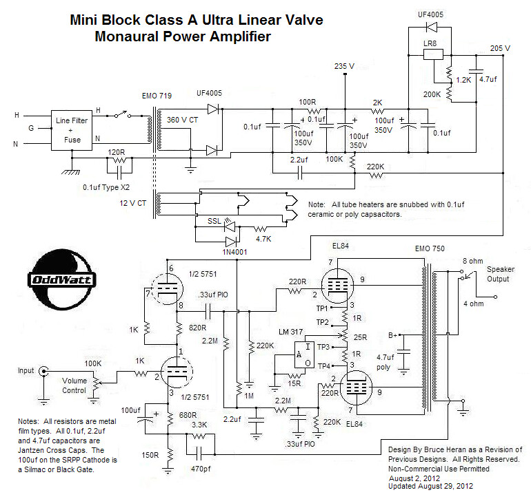 The front end is a very close ripoff from a circuit John Broskie (tubeCAD) published. It’s actually very similar to many other EL84 push-pull driver/splitters I’ve found. I don’t care for that SRPP front end used in the OddWatt circuits.