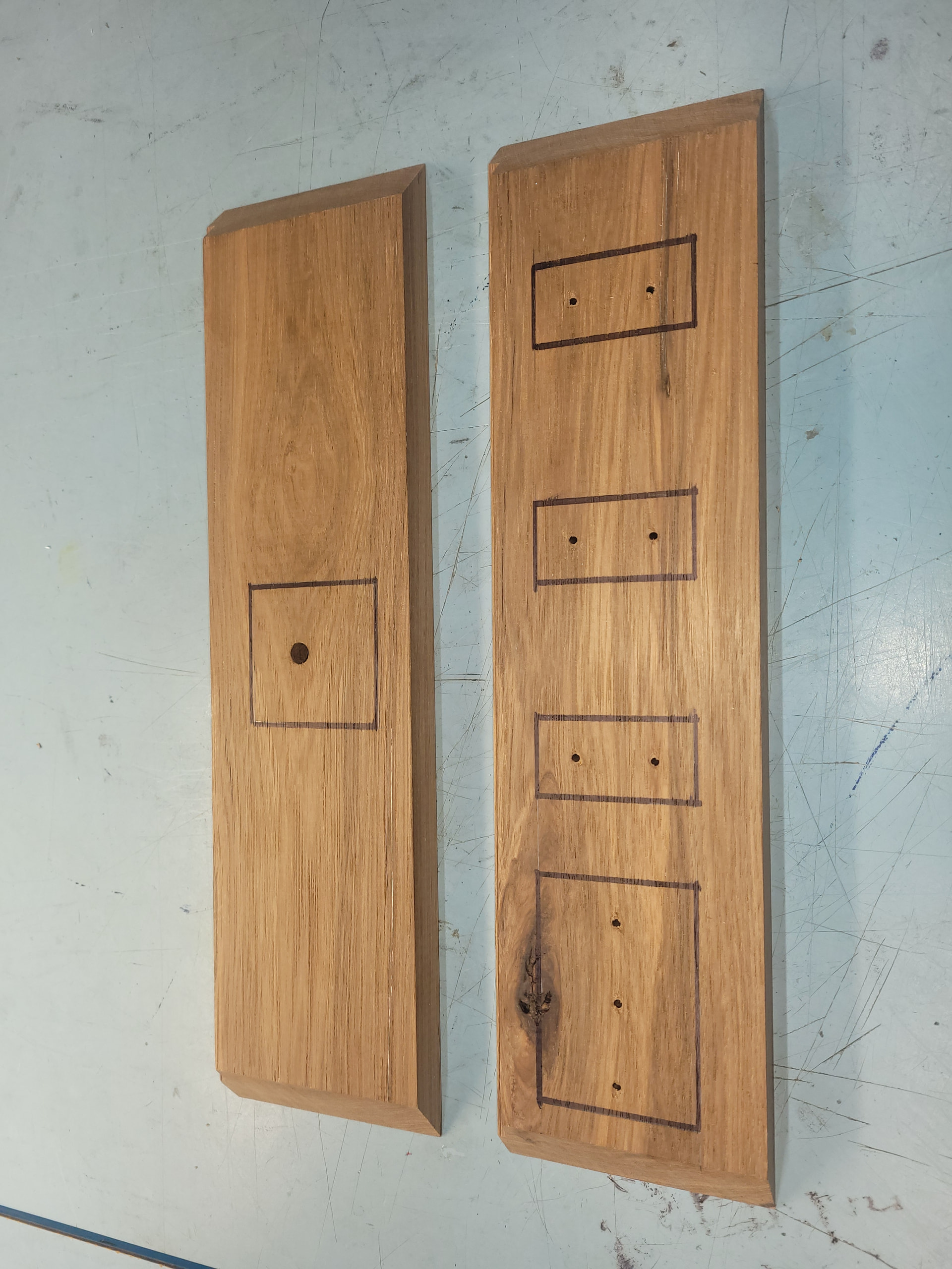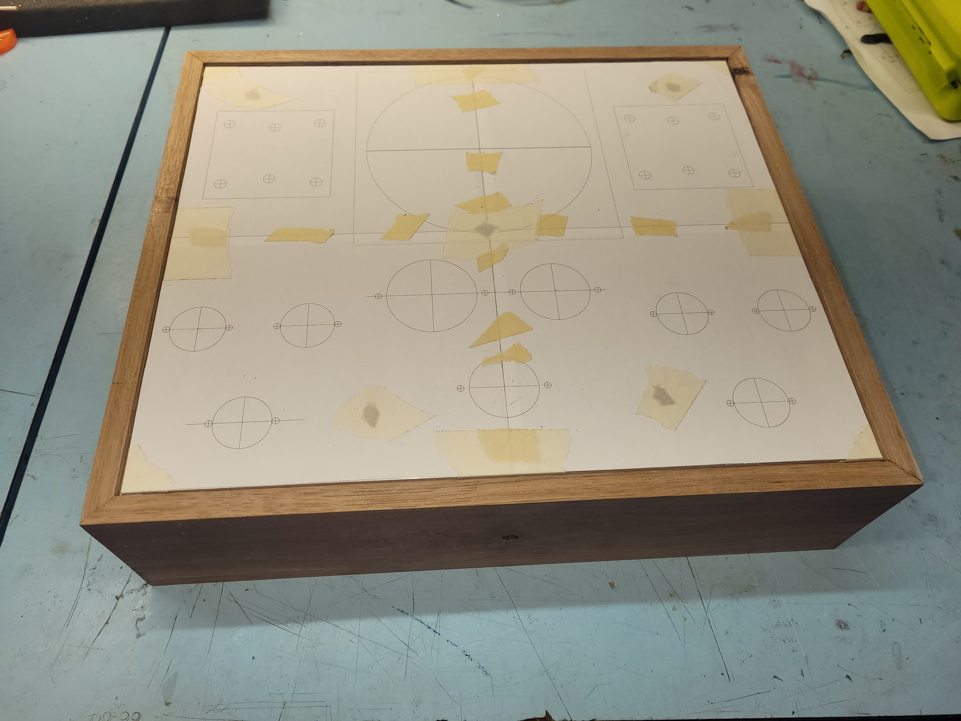 I had some time after work to locate and drill the pilot holes for the RCA input jacks, the volume pot, the speaker output 5-way terminals, and the power switch/fuse holder/IEC input jack. Then I marked where I need to plunge down and bore out material with the router: