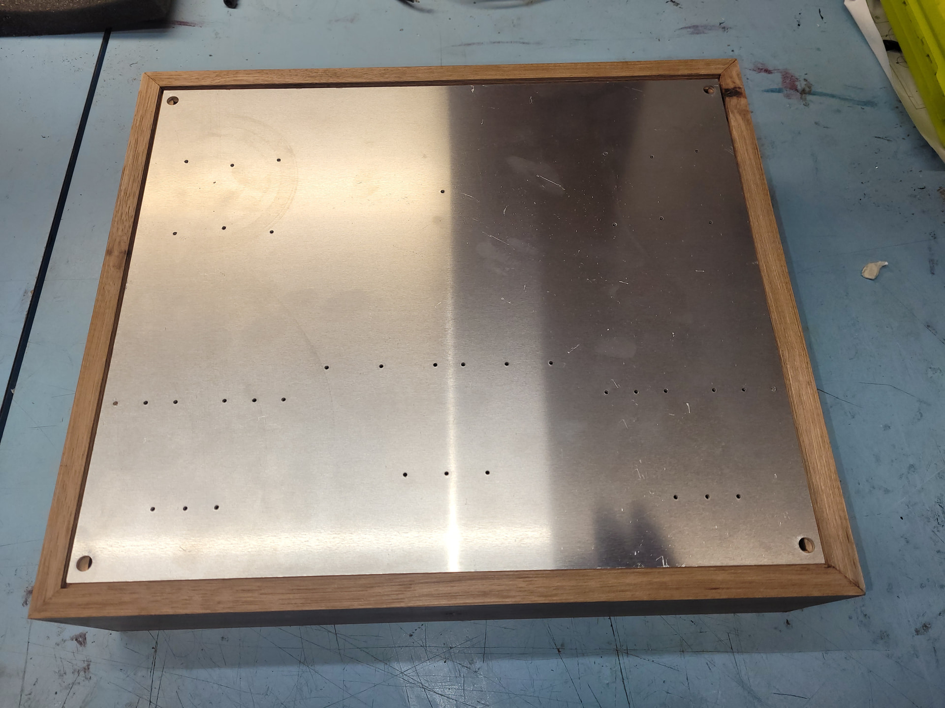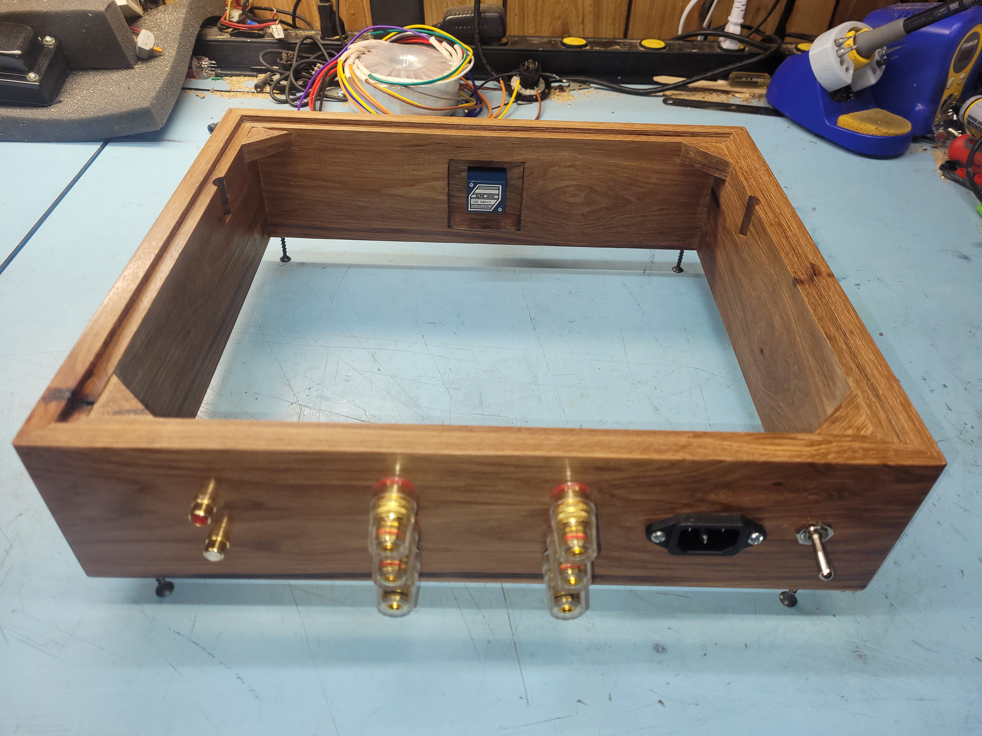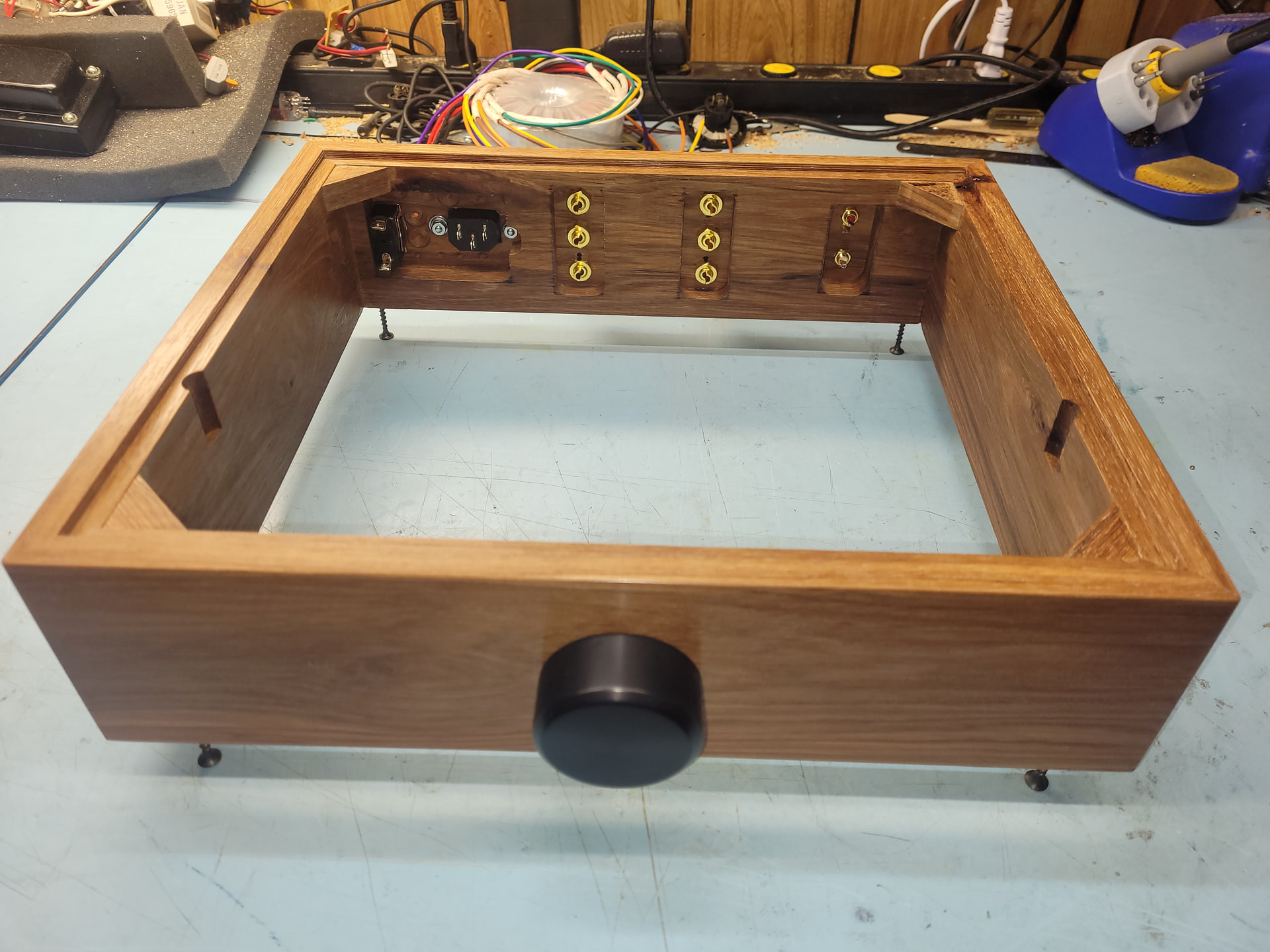 Please excuse the messy work bench. I was able to complete the finish on the hickory case and start installing terminals and such: