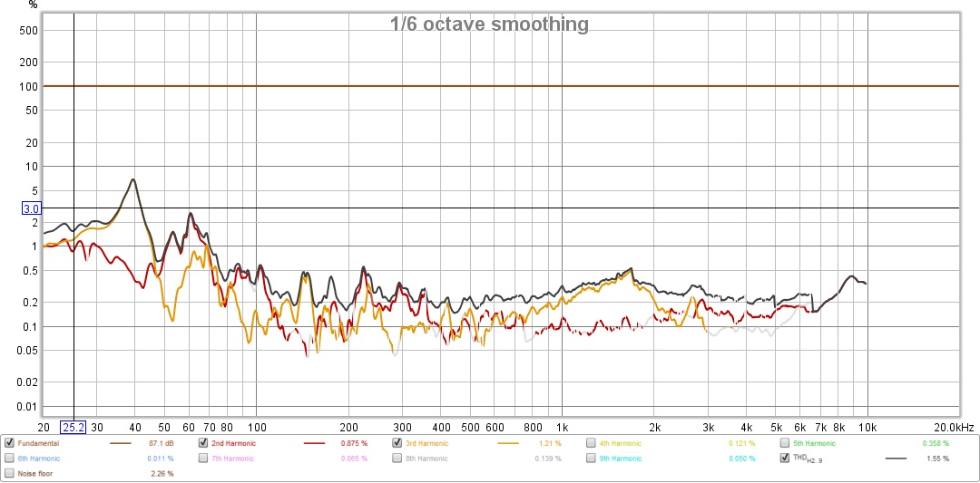 Ok, so I put a crossover together today. Didn’t even use XSIM. Just through some parts at it and it seems to be very good. Drivers are easy to work with. Looks like it is 94 db at 2.83 volts. With about 5 volts going to it, it was doing about 100 db. Distortion at 2.83 volts was mostly down in the 0.2 percent range and 2 percent at 20 hz!