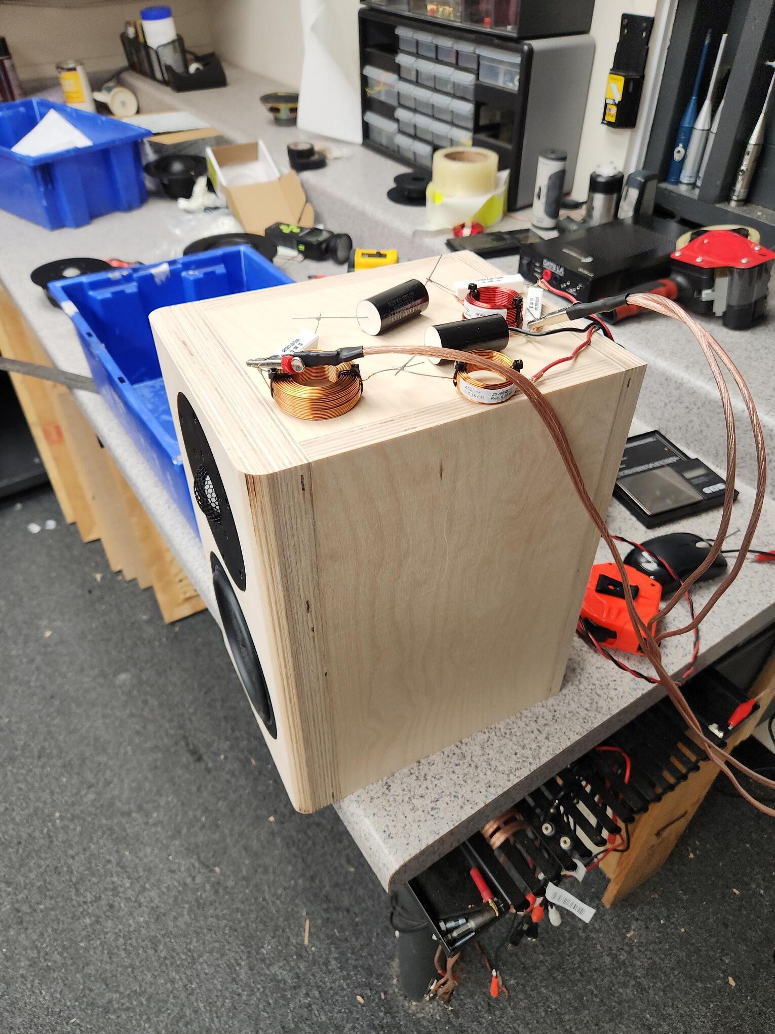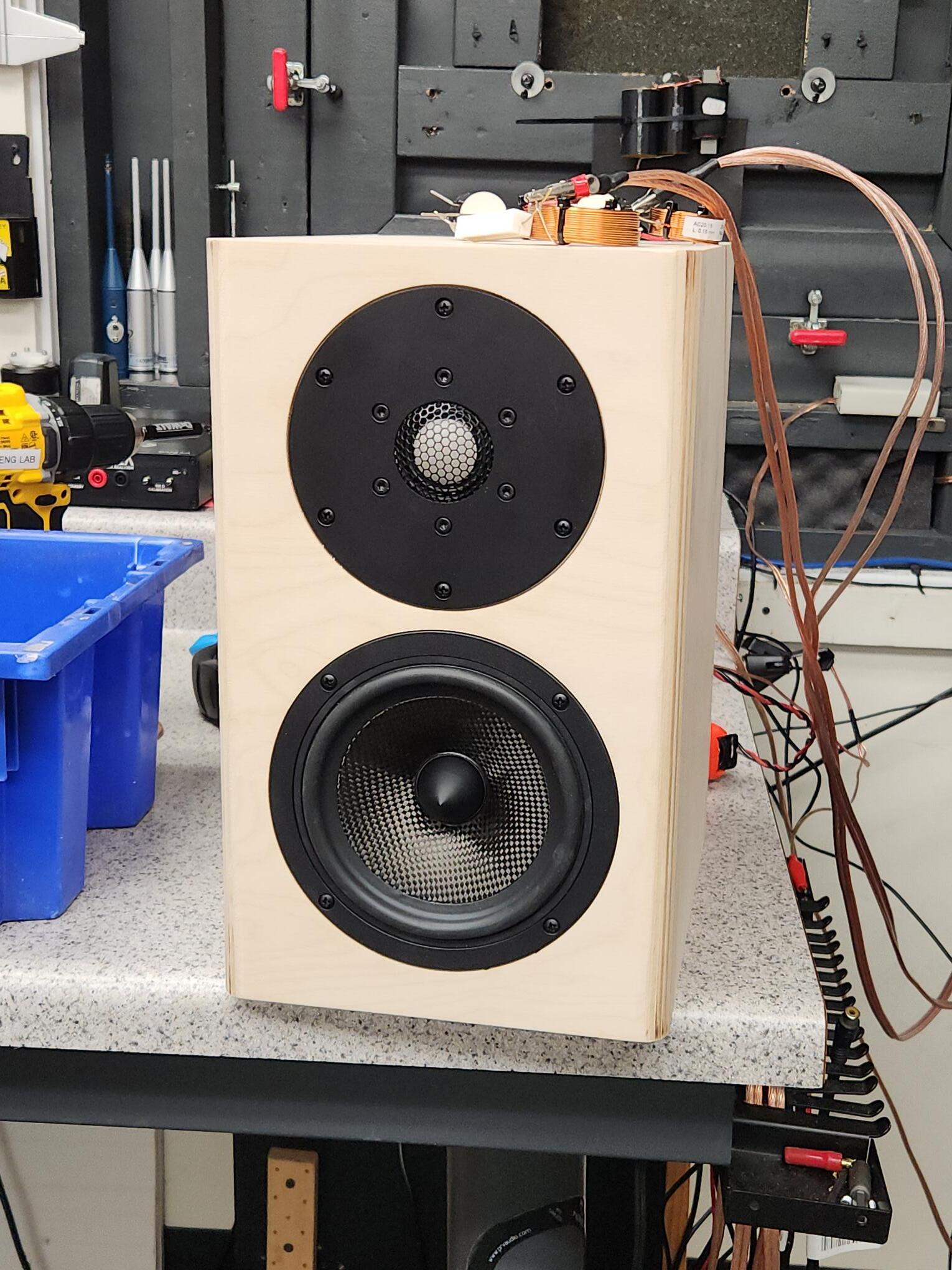Quasi-anechoic, measured in our chamber here at the office. Tweeter was ~52” off the floor, 2.83V/1m. Gating at 5ms. This was passive, paired to two subs high/low-passed at 80 with a pair of SPA500DSP’s. Source was a WIIM Mini, Fosi P4 and a sample ICE Power 2x100W amp kit we had laying around, so very clean. The dip was not audible in my listening. This system is currently collecting dust until I can finish it and get a dedicated space for it. Not much to look at, but they are solid. BB plywood (scraps believe it or not), double front baffle and braced, completely sealed. I have since finalized the crossovers with nicer components and got them all buttoned up. I don’t currently have a photo of the subs.