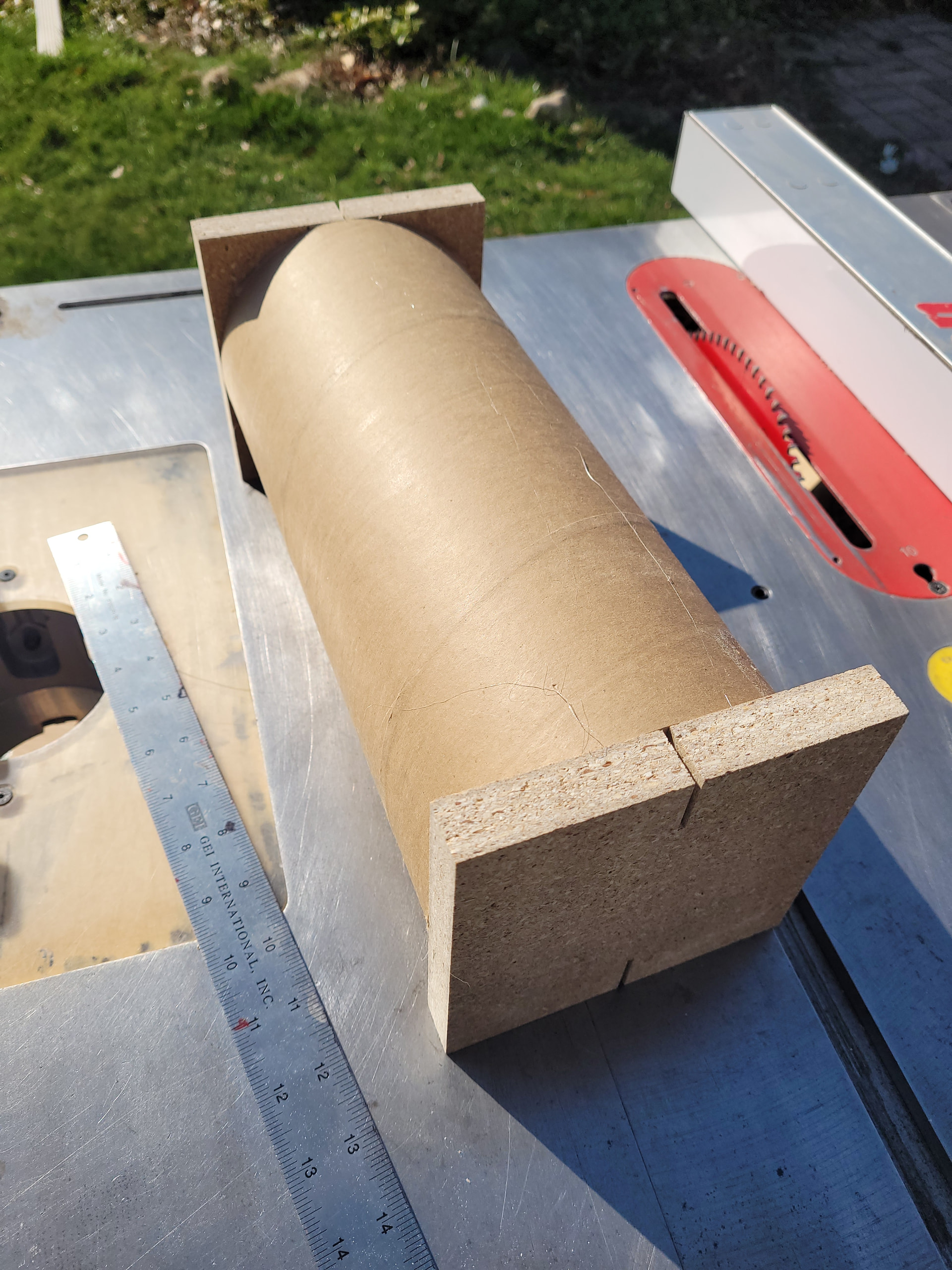 I cut these squares out of some scrap PB that are exactly the same width as the cardboard tubes’ diameters. A quick temporary tack with some hot glue and easily cut exactly in half on the table saw.