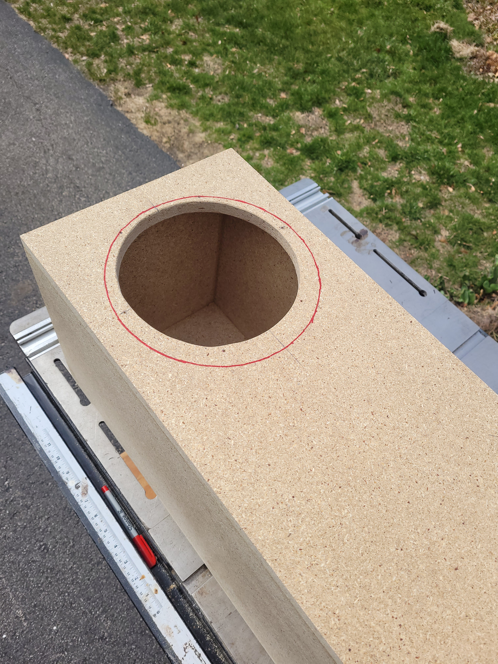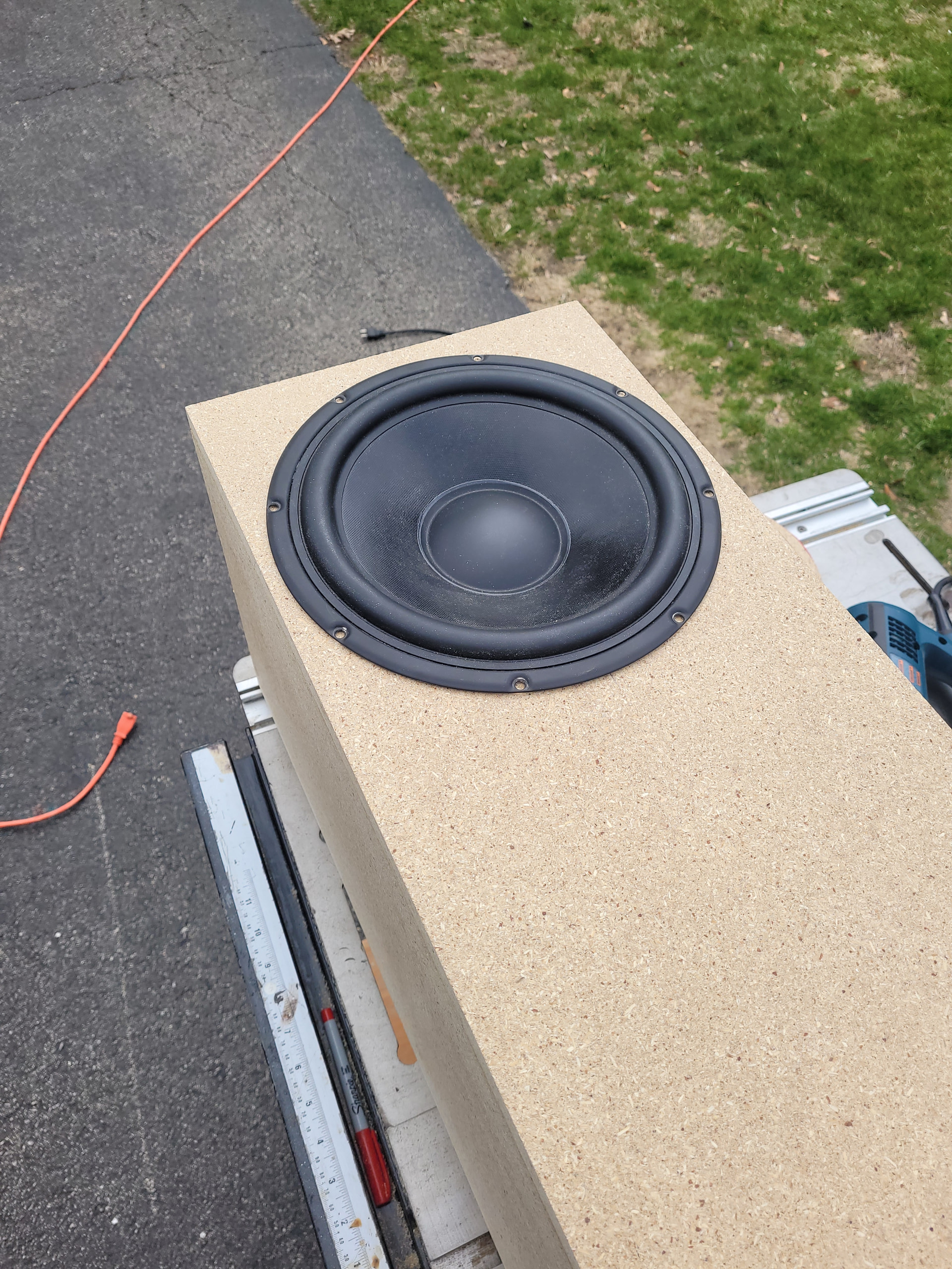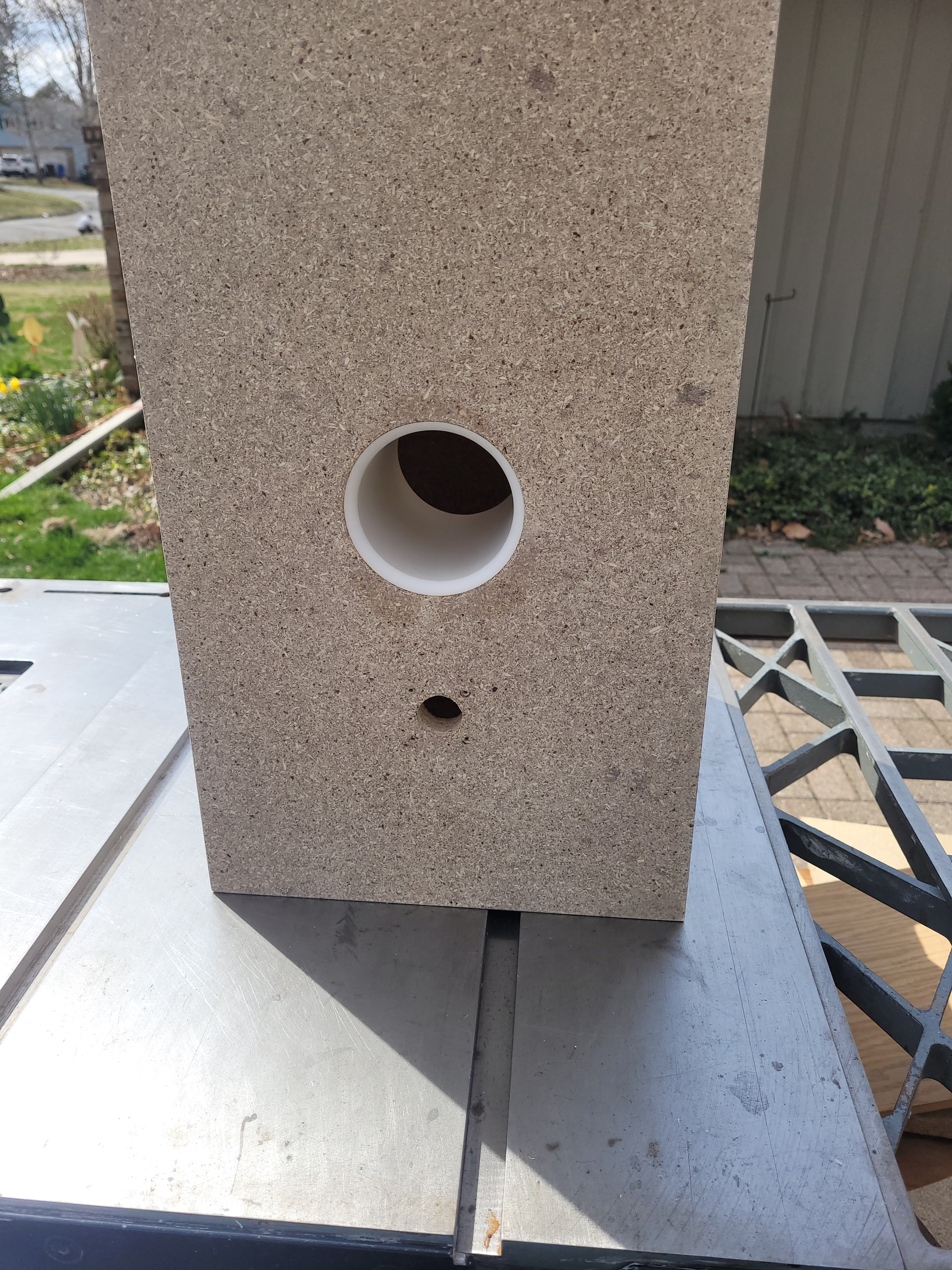 Another beautiful day here for this time of year. After getting my yard chores done I spent a little time flush trimming the enclosures. I built the bass bins last year as ported prototypes for a pair of MCM 55-5670. I built them with some super cheap and sightly damaged PB. I had to enlarge the through holes for the bigger Peerless. I’ll have to cut some block off plates to seal off the ports.