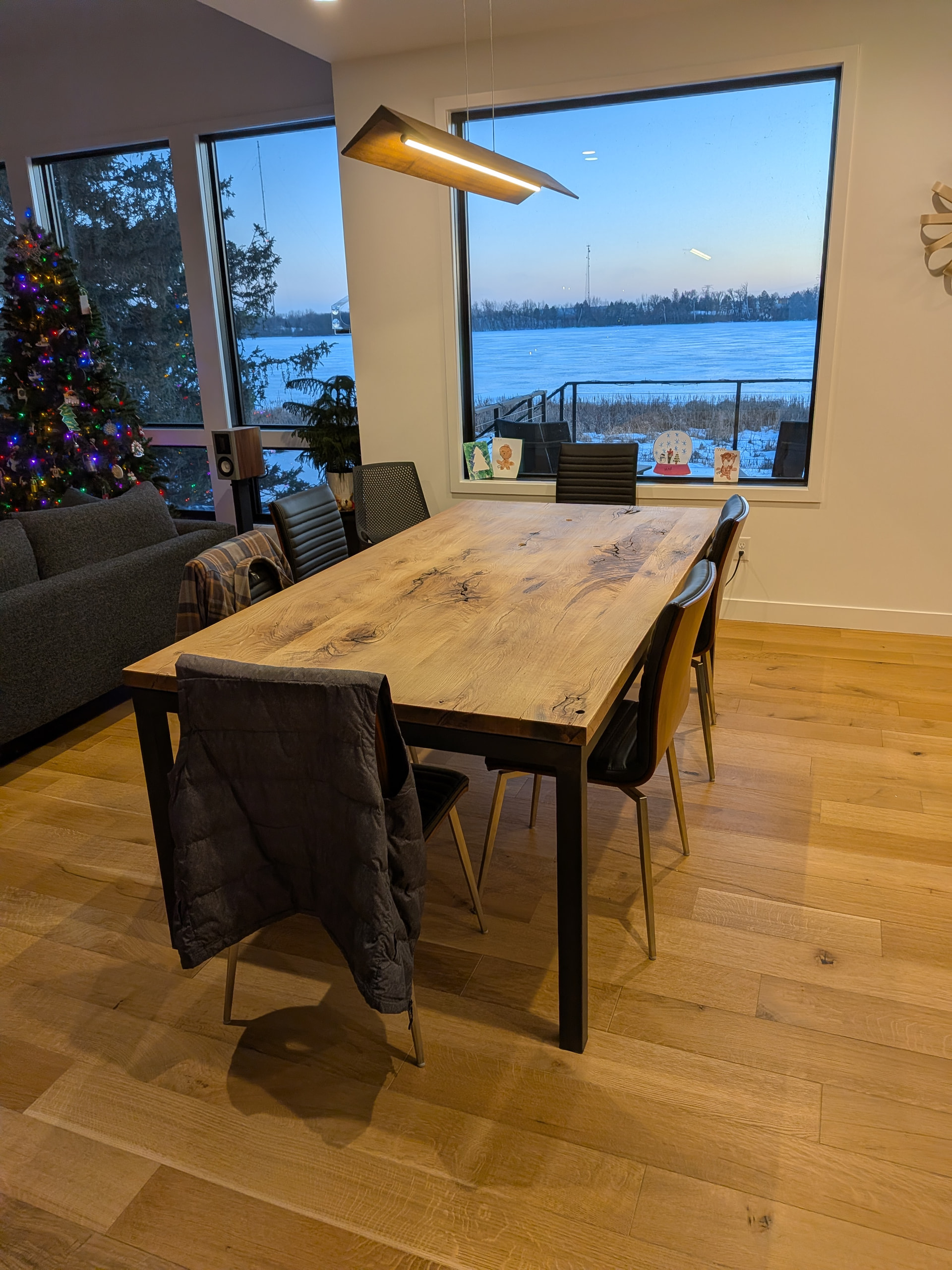 A journey that started in 2013 when a strong storm downed a large oak is now nearly complete. I had the trunk sliced into slabs and for the next decade they sat stickered in a stack, waiting for their moment. With the help of a friend, the stack was moved in preparation for the demo and construction of our new house. We selected the best four slabs and moved them to his shop while the house was being constructed. In the summer of 2024, a makeshift kiln was built to cook the slabs to remove pests. I cut them down to 8 ft and had them leveled. Fast forward to this past fall when I was picking up some rack shelving on marketplace and got to talking with the seller about the slabs and how I was hoping to make a table top. They offered to help me out and today it picked it up! It’s only been sealed and he suggested it acclimate for several months before I put a finish on it. It’s a neat piece that carries a lot of sentiment.