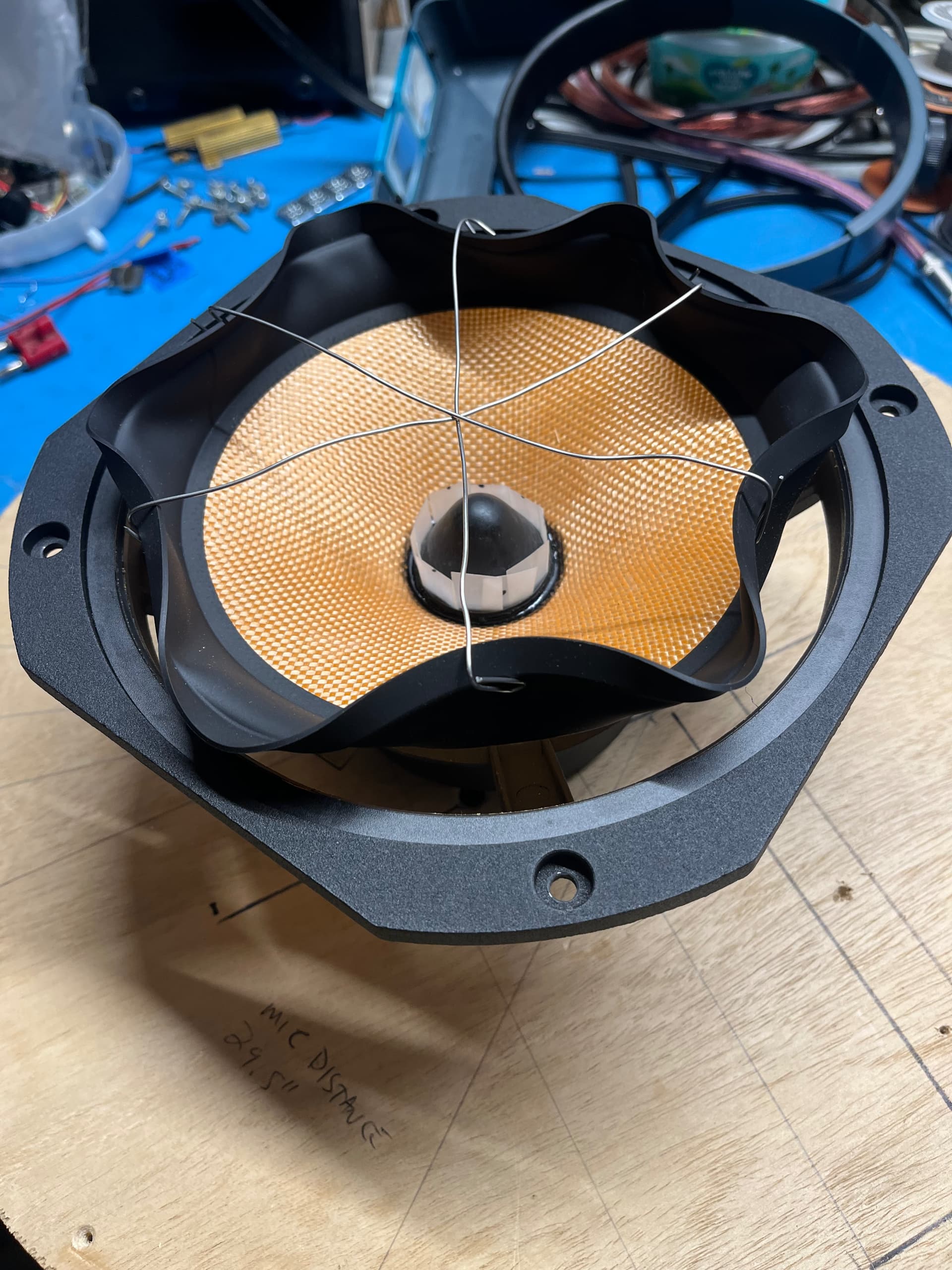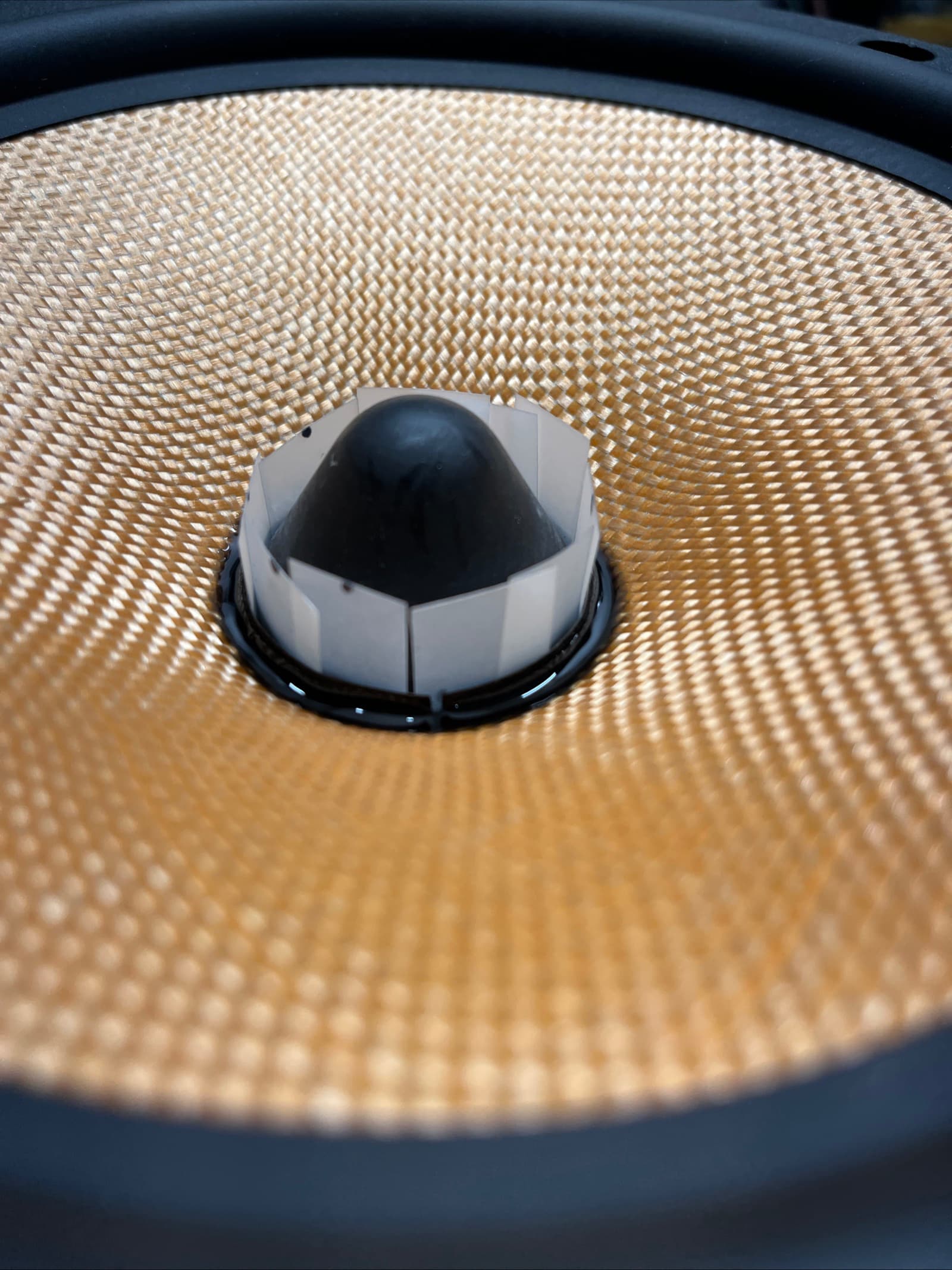 The fiberglass cones had to small of a VC opening, so I had to cut that. I used a pair of curved fingernail scissors. I carefully opened it up for a nice snug fit. No dust cap made it easy to shim the VC in place. I made sure the VC height was approximately centered/spider was flat.