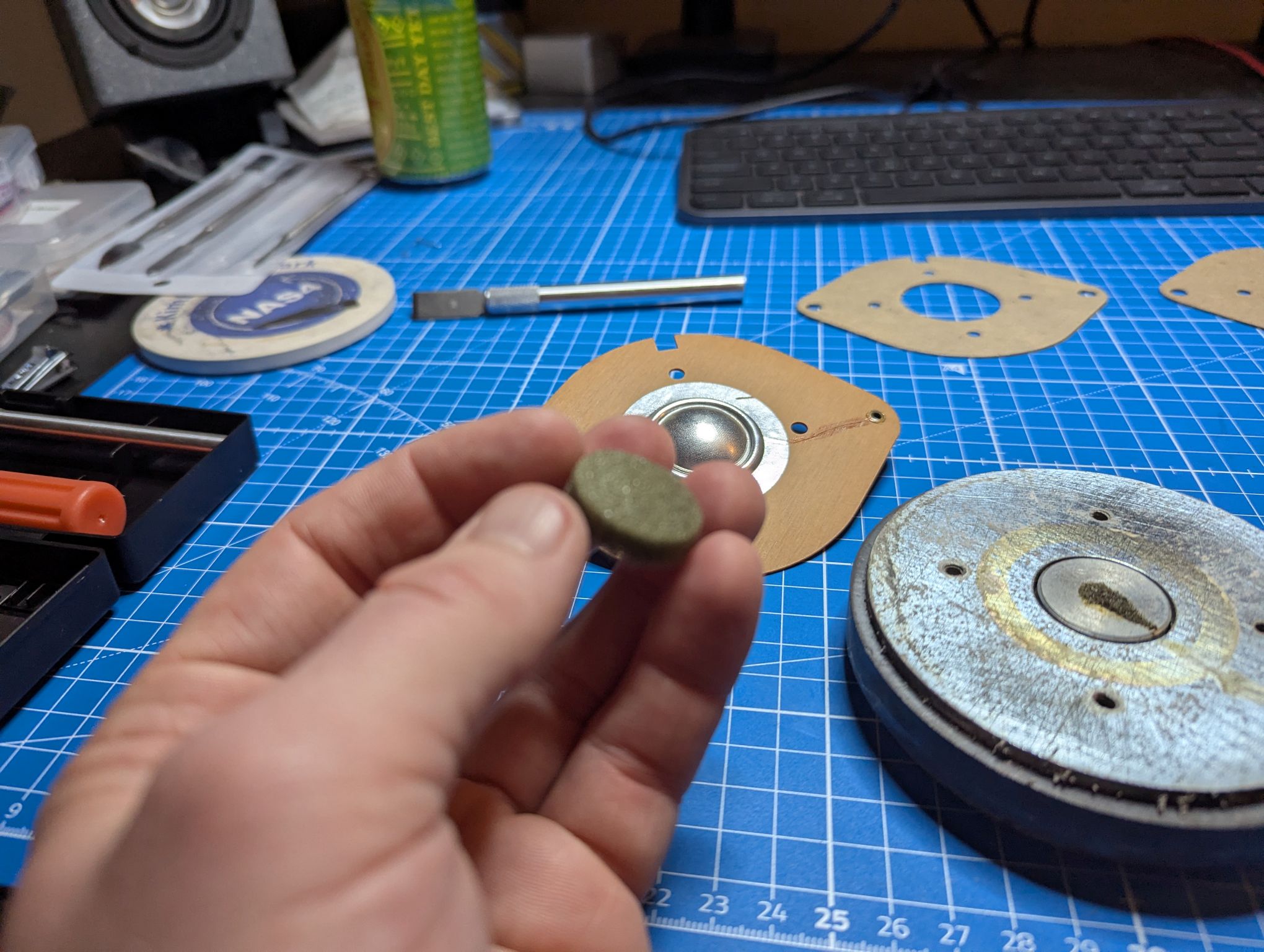 Trying to separate the dome’s thin bakelite board from the magnet was harrowing. I had no clue how much force was OK and how much was not OK. But I managed not to screw things up. Cleaned some oxide whiskers out of one of the tweeters and shot them both with compressed air. Put on the felt pads and started buttoning things up.
